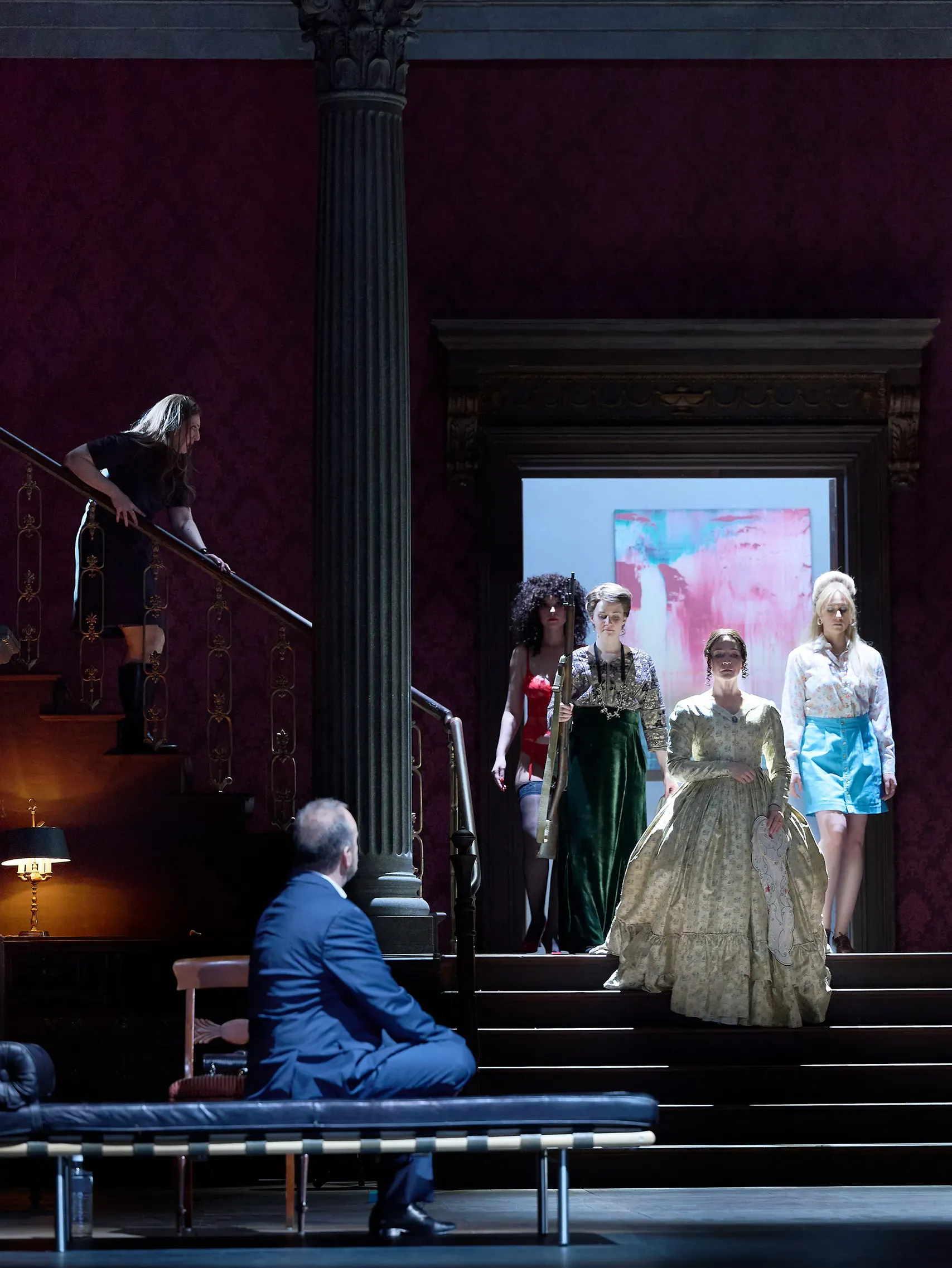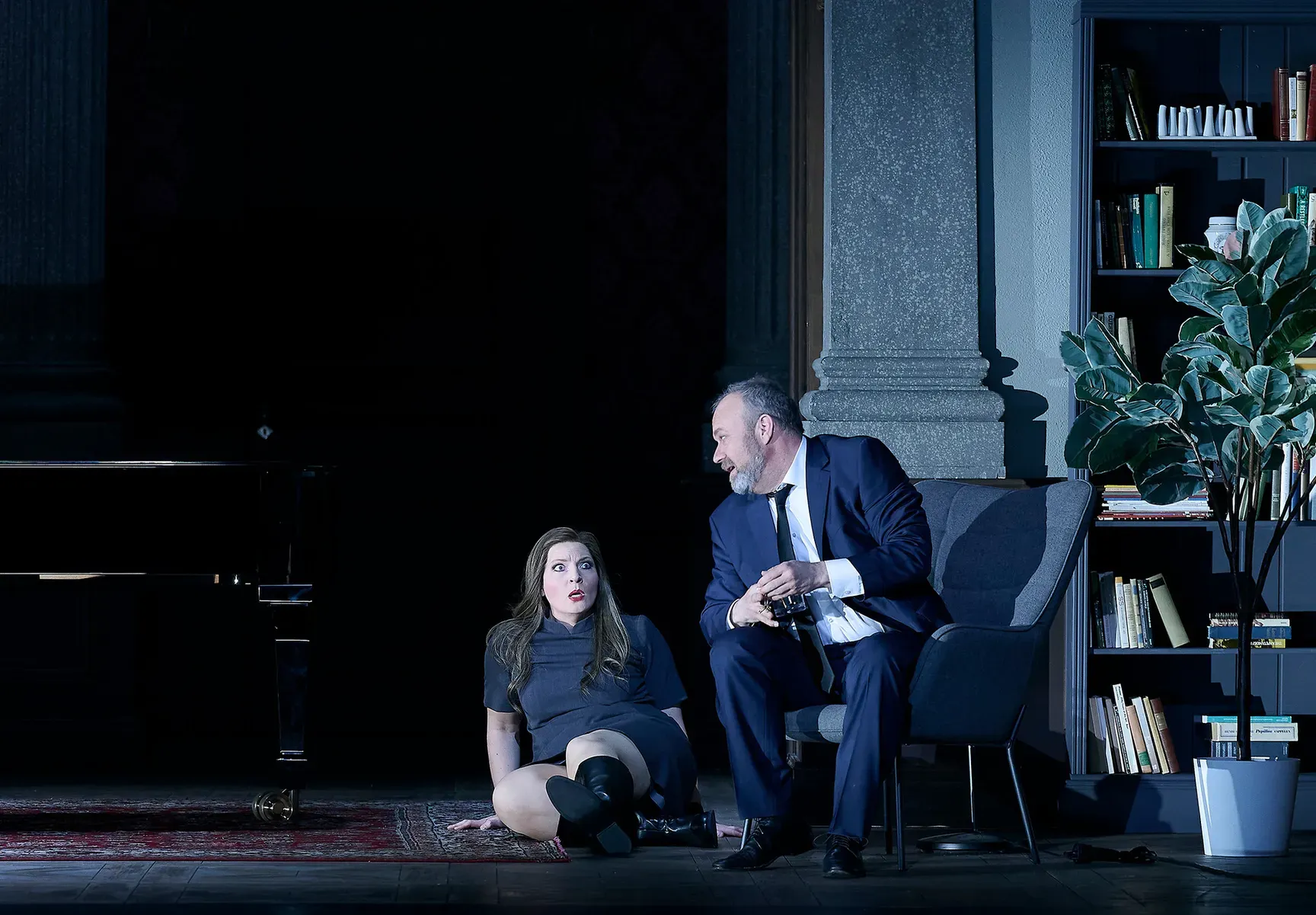 Nahtlos ging der Schumann-Prolog in „Herzog Blaubarts Burg“ über. Das Bühnenbild (von Rainer Sellmaier, ebenso die Kostüme) blieb, nur statt des Biedermeiersofas stand nun eine Psychologen-Liege vorn auf der Bühne, auf die sich Blaubart im Verlauf der Handlung legte, als ob er von Judit therapiert werden sollte.