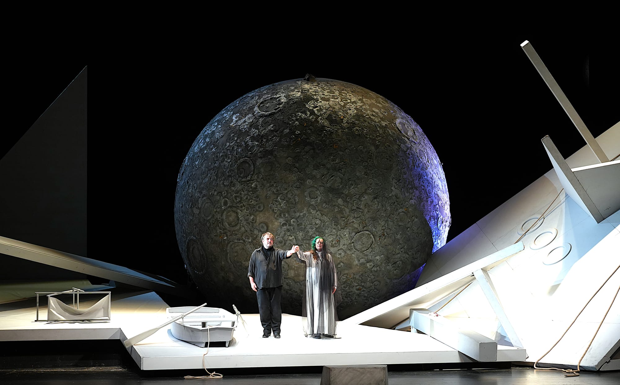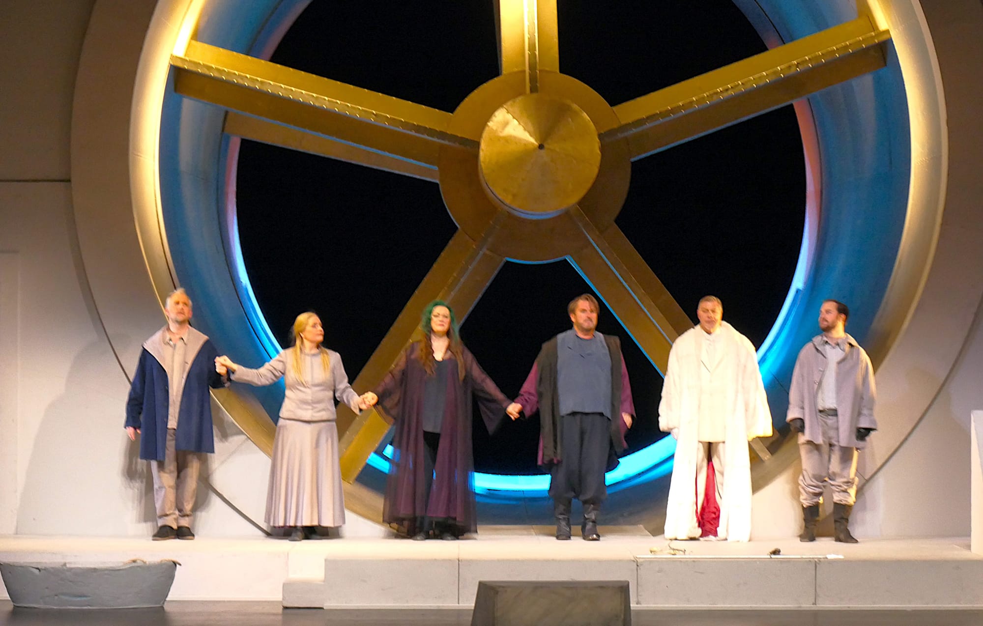 Der zweite Akt bringt weitere Überraschungen: Wir befinden uns wohl in einer Raumstation vor einer riesigen Turbine. Im Vordergrund wieder das Ruderboot, für Isolde wohl das Symbol ihrer Liebe zu Tristan und der Rettung dieser Liebe, gleichzeitig aber wohl auch Flucht aus der Verbindung mit König Marke.