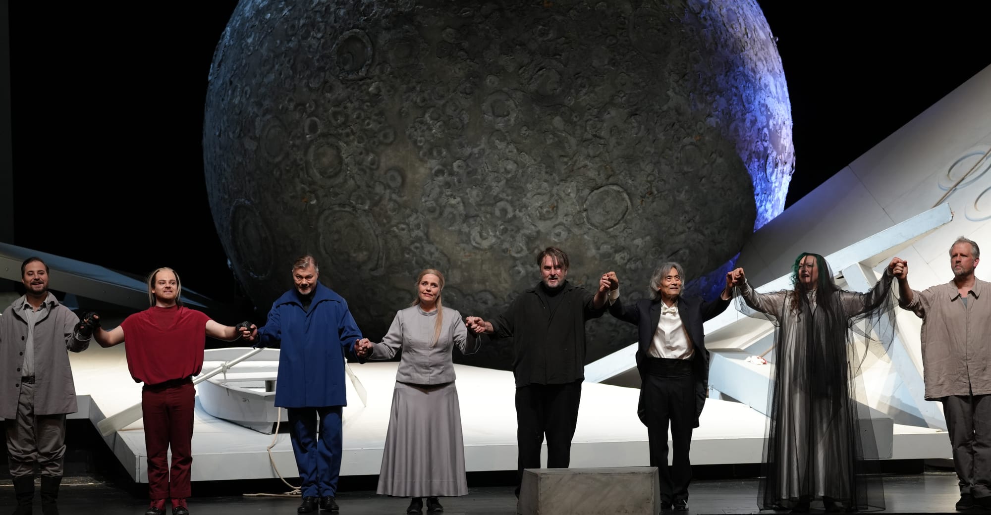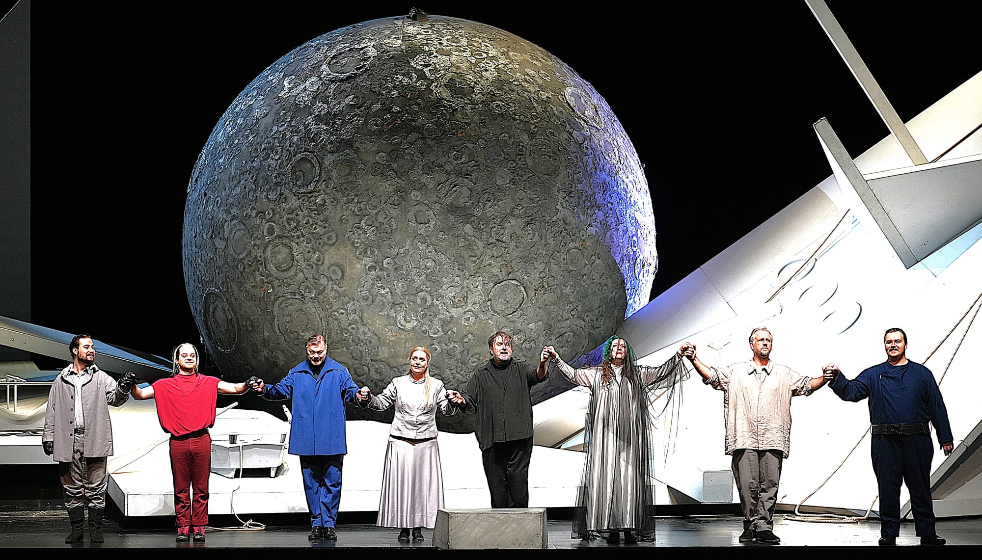 Das Motiv auf dem Zwischenvorhang läßt schon einiges erahnen: Wir blicken ins Universum, auf den Mond, zwei weitere Planeten, auf die Milchstraße – oder befinden wir uns gar in einem anderen Sonnensystem? Steht uns eine „Odyssee im Weltraum“ mit der „Raumpatrouille“ bevor, oder gar „Star Wars“?