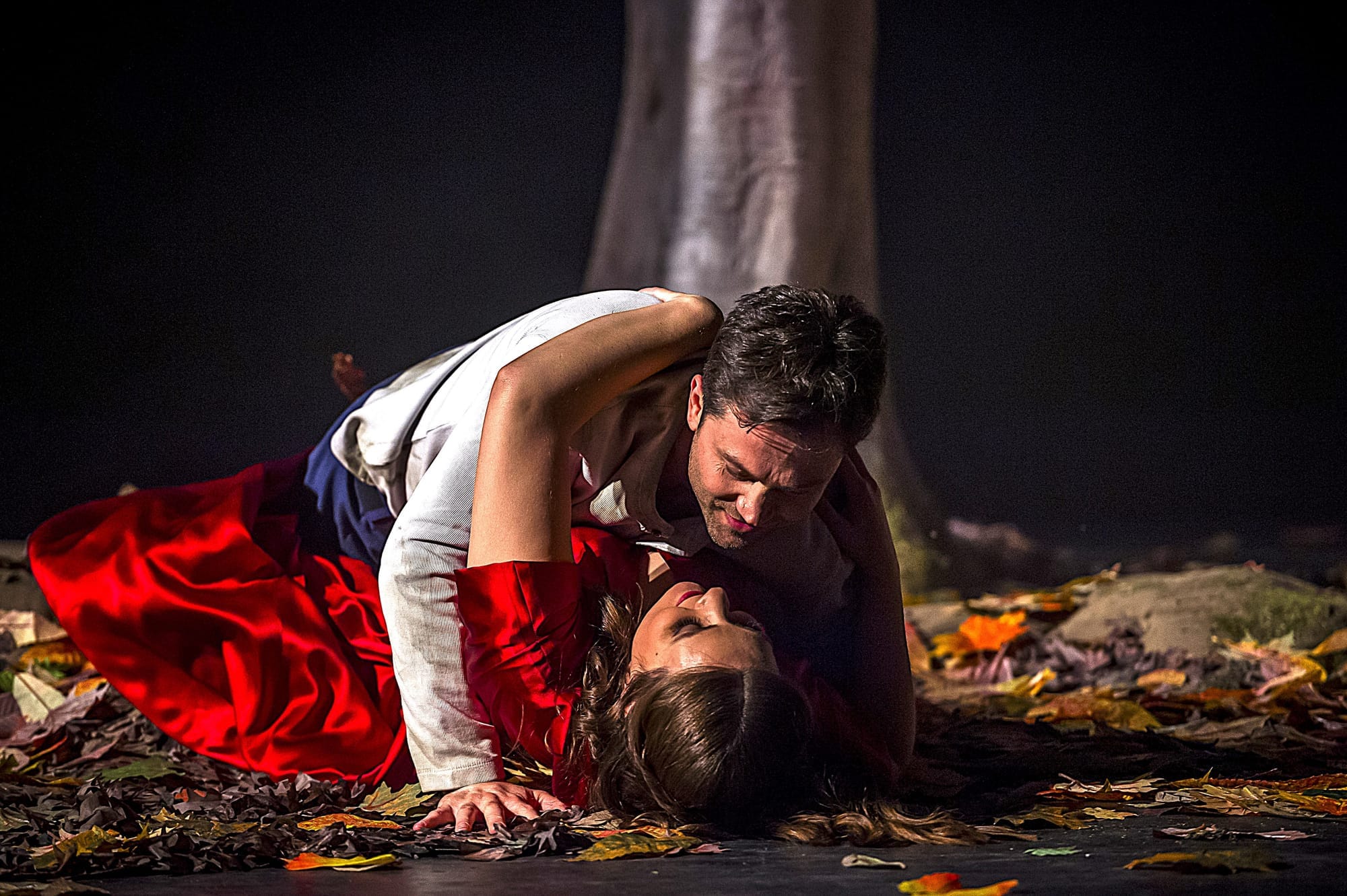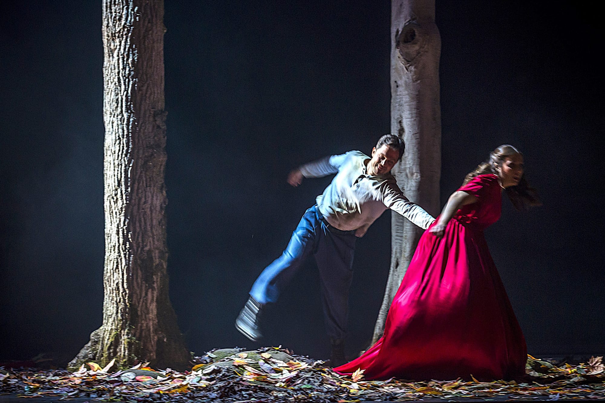 Der erste Akt beginnt, aus den beiden Mädchen im Park sind junge Frauen geworden, Lucia und ihre Vertraute Alisa, die sich noch immer fröhlich mit Herbstlaub bewerfen und sich hinter den Bäumen verstecken. Doch im Hintergrund auf dem ansteigenden Treppengerüst beobachten Enricos ganz in schwarz gekleidete Mannen die Szenerie (Bühnenbild und Kostüme von Tatjana Ivschina).