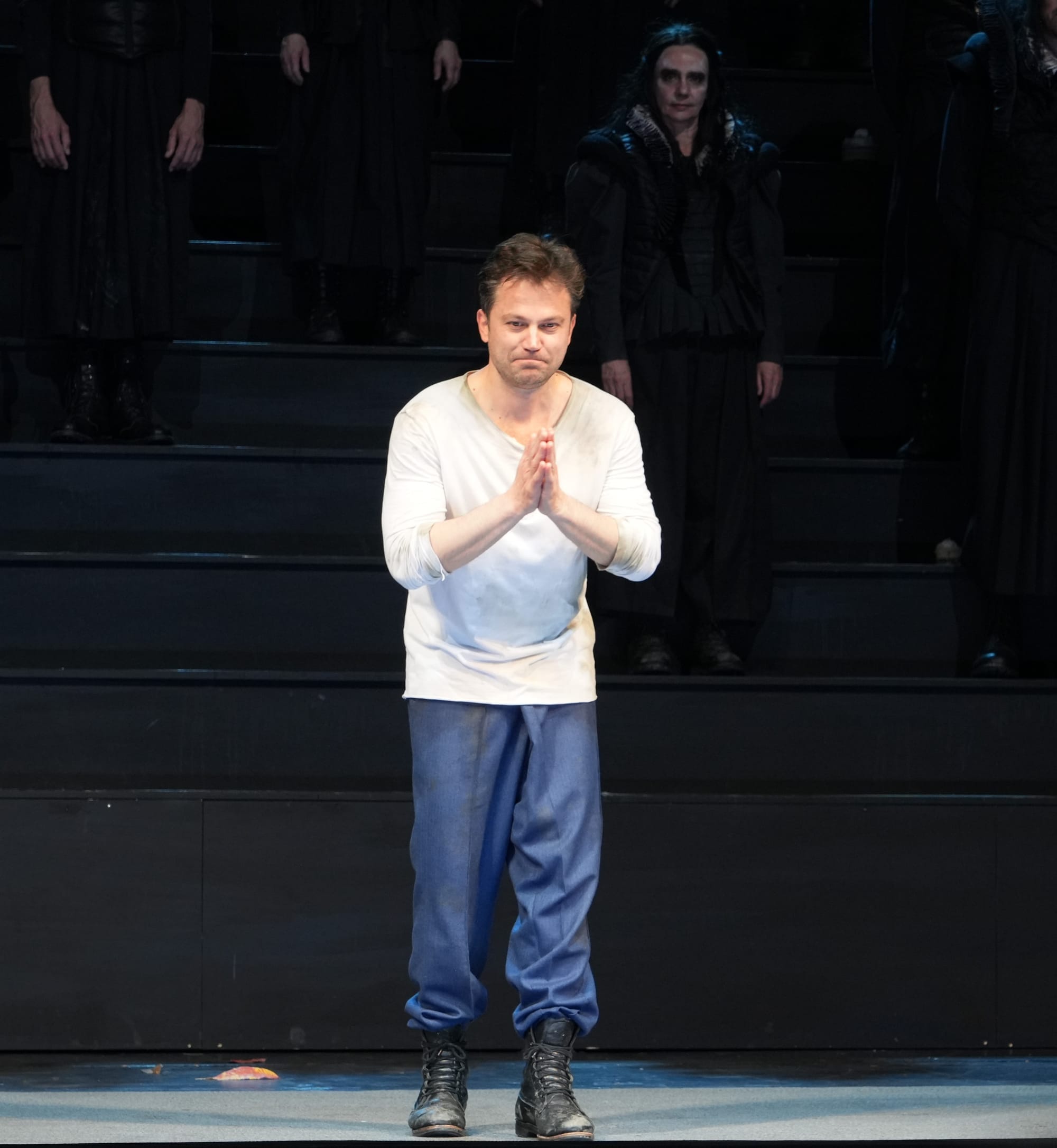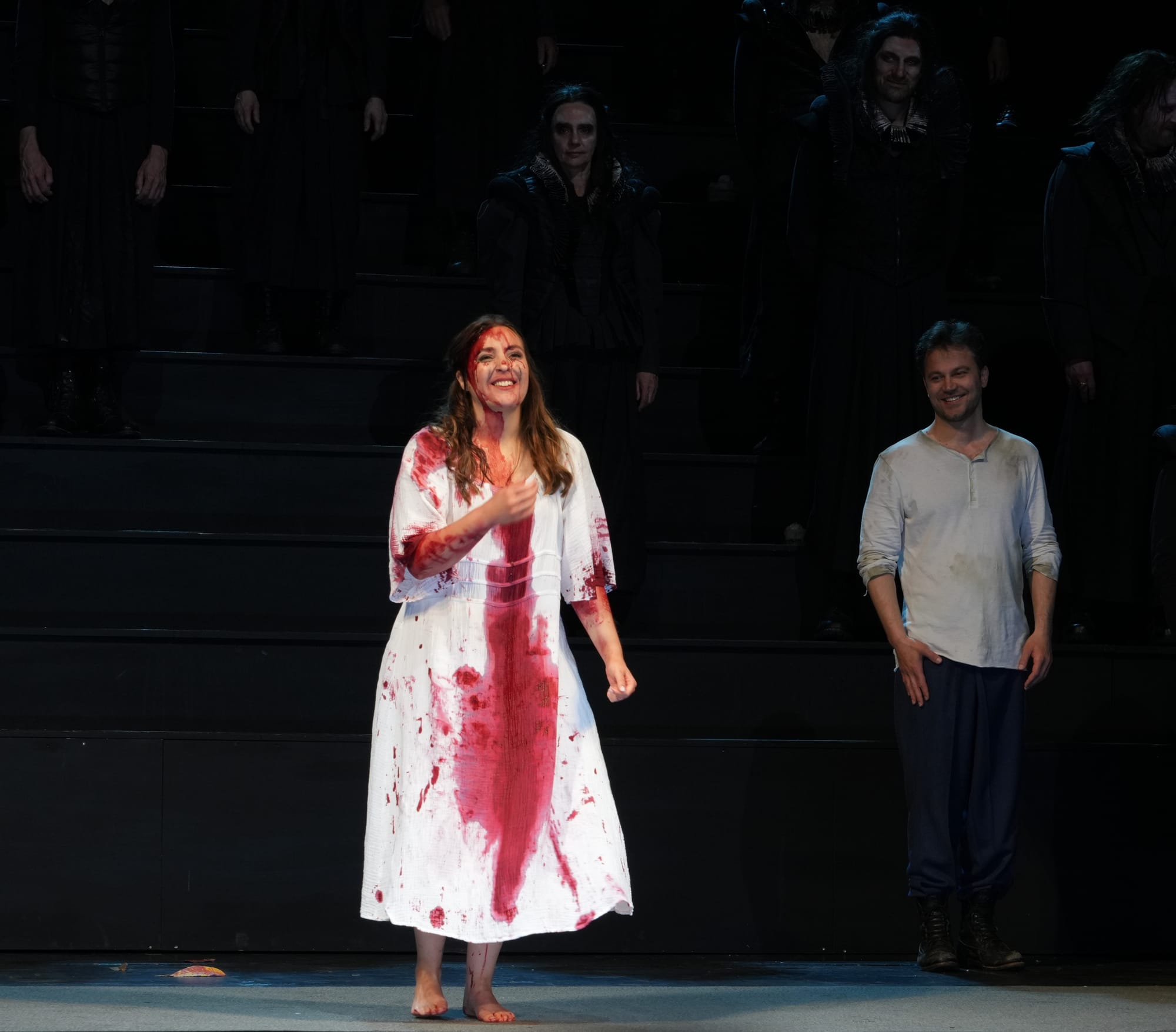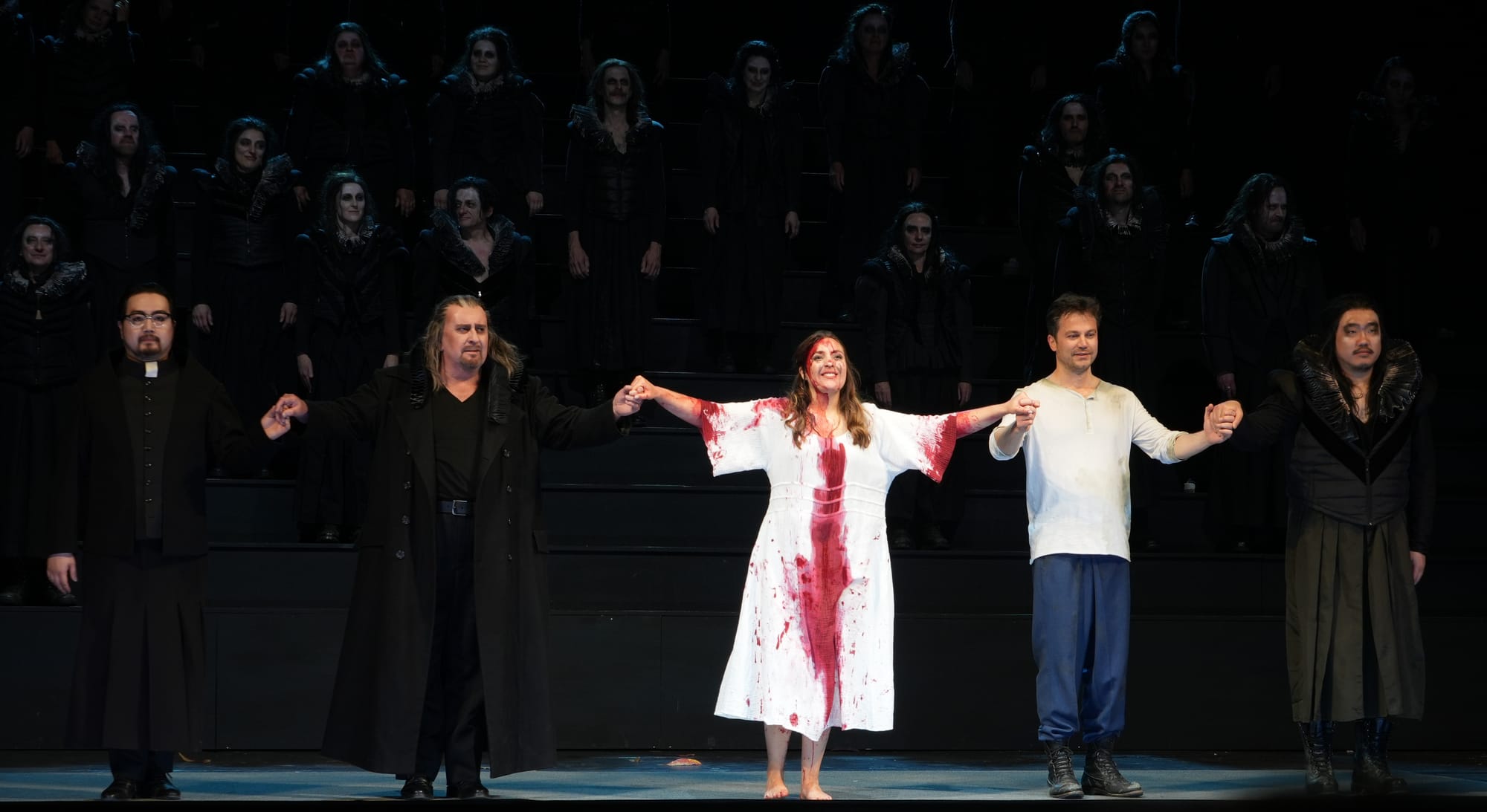 Dieses schön anzuschauende Park-Bühnenbild mit den Bäumen und dem Herbstlaub ist im zweiten Akt verschwunden, es gibt auf der dunklen Bühne nur noch das steil ansteigende Treppengerüst, auf dem der schwarze Herrenchor sich positioniert. Dieser von Jan-Michael Krüger in all seiner gesanglichen Dramatik perfekt einstudierte Herrenchor erfüllte in der ausgefeilten Personenregie von Anna Drescher seine mannigfaltigen szenischen Aufgaben in der grausamen archaischen Männerwelt von Ravenswood, angeführt von Normanno, wenn sie anfangs ihre Gewehre reinigen, oder mit gierigen Blicken die Entkleidungsszene verfolgen, als Enrico seiner Schwester das rote Kleid auszieht und ihr die mächtige, prachtvolle weiß glitzernde Hochzeitsrobe mit der ellenlangen Schleppe anlegt, oder wenn Edgardo ganz am Ende unter der Übermacht dieser schwarzen Männer schließlich versinkt.