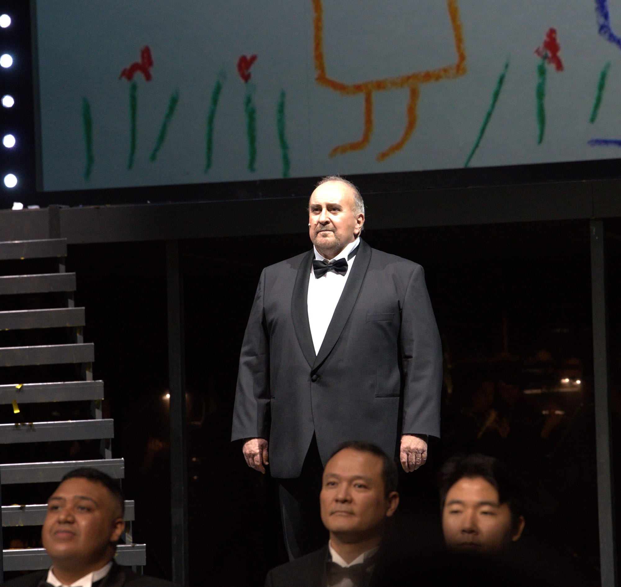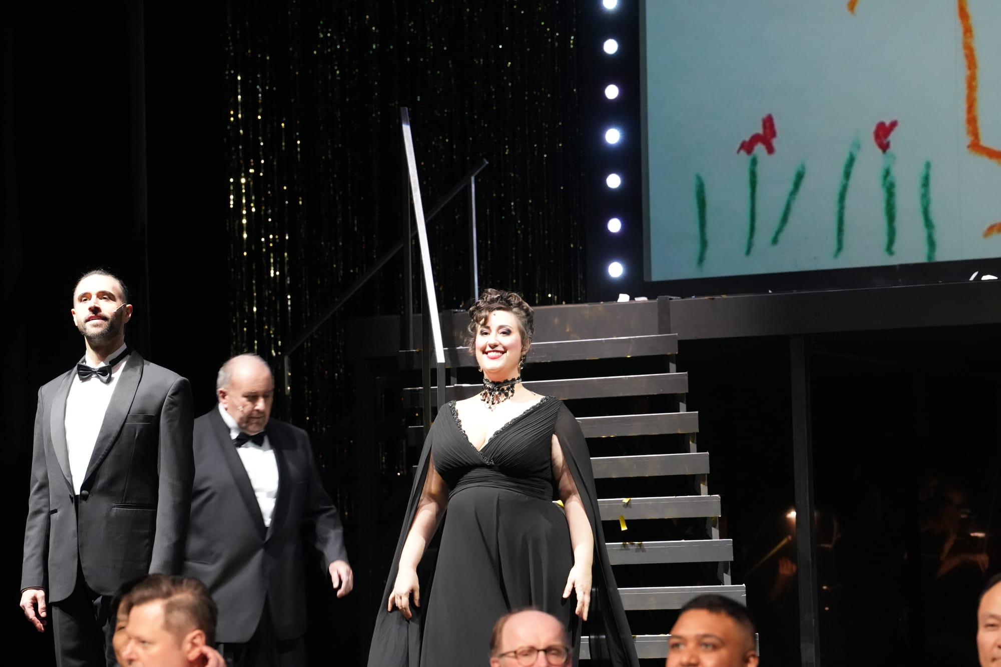 Der Orchestergraben war hochgefahren, dort saßen sowohl der Chor, als auch an einem Regietisch die beiden Illustratoren. Das Orchester war im hinteren Teil der Hauptbühne platziert. Links und rechts führten zwei Showtreppen hinauf zur oberen Bühne vor der großen Projektions-Leinwand. Candide und Kunegonde agierten meist oben, während auf der unteren Spielfläche sich Dr. Pangloss, Paquette, die alte Lady, Maximilian und die Nebenrollen tummelten.