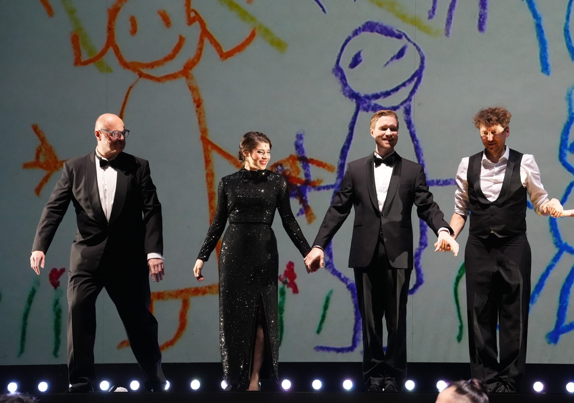 Allzu häufig ist „Candide“ auf deutschen Bühnen nicht zu erleben, und wenn, dann meist in konzertanter Form, denn aufgrund der weitschweifigen und verwirrenden Handlung ist das Stück nur sehr schwer zu inszenieren. Und so hatte sich Ronny Scholz ein interessantes Konzept ausgedacht, „Candide“ als eine Art Revue auf die Bühne zu bringen unter Einbeziehung von vielen amüsanten Live-Illustrationen, die auf die Bühnenrückwand projiziert wurden – ein Konzept, welches sich in den letzten Jahren bereits an den Theatern Münster und Regensburg bewährt hatte und nun auch am Lübecker Theater große Begeisterung vonseiten des Premierenpublikums auslöste. Denn was der Illustrator Robert Nippoldt gemeinsam mit seiner Assistentin Lotta Stein an erklärenden originellen Zeichnungen 'live' und temporeich auf die Bühne projizierten und die Geschichte dadurch auch verständlicher machten, war einfach grandios und ließ die Besucher immer wieder in maßloses Staunen versetzen.