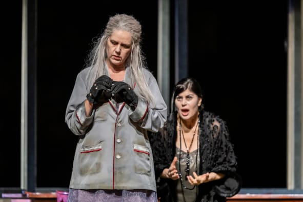 Ebenfalls ein gelungenes Rollendebüt gab Lena Kutzner als ihre Schwester Chrysothemis. Gewandet in einem dunklen mit Spitzen besetzen Kleid und sich nach einem ganz normalen Frauenleben sehnend, gefiel sie mit emotionalem, anrührendem Spiel und ihrem leuchtendem Sopran, wunderbar phrasiert und mit glanzvoller Höhe. Edna Prochnik als Klytämnestra in dunklem Wollmantel und mit Halsketten geschmückt sah optisch jünger aus als ihre Tochter Elektra. Stets begleitet von ihrer Vertrauten (Natalia Willot) und der Schleppenträgerin (Elvire Beekhuizen) konnte sie darstellerisch ihre Ängste vor dem Leben und vor ihrem zu erwartenden Schicksal durchaus glaubhaft machen, und auch stimmlich gelangen ihr besonders im Monolog intensive Momente.