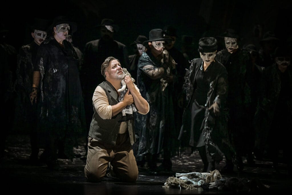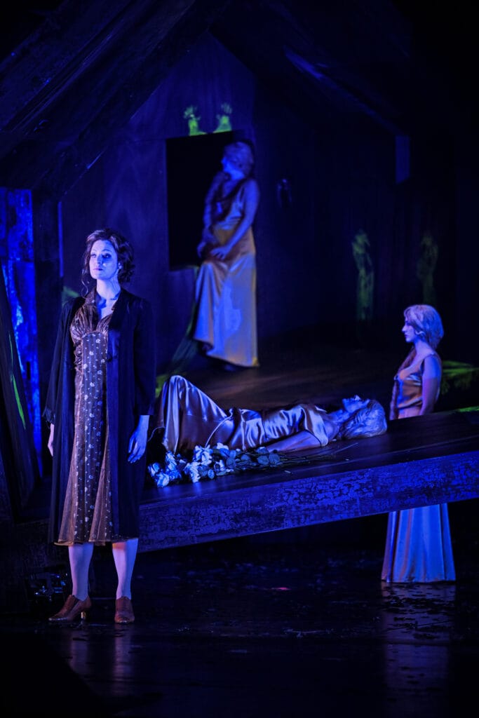 Brügge ist keine tote Stadt, im Gegenteil, mit einem herrlichen alten Stadtkern und langer Geschichte, zieht der belgische Ort heutzutage (massenhaft) Touristen an. Doch in Erich Wolfgang Korngolds Oper ist das Leben daraus verschwunden, es ist ein dunkler Flecken in dem man nicht verweilen möchte. Korngold war gerade 23 Jahre alt, als er 1920 seine berühmteste Oper komponierte und diese nach 105 Jahren zum ersten Mal am Staatstheater Mainz gegeben wird. Das Team um die Regisseurin Angela Denoke hat es wörtlich genommen: Brügge ist nicht vorhanden, verloren im düsteren schwarz-nebeligen Bühnenraum, ohne Romantik oder einen Hinweis auf das reale Stadtbild. Muss auch nicht sein, der mögliche Kontrast zwischen einer an sich schönen Außen- und einer tristen Innenwelt fällt damit aber weg, denn das Seelenleben des „Helden“ Paul entspricht gänzlich dem Zustand Brügges. Er trägt Brügge in sich oder es ist seine Vision der Stadt: unwirtlich und irgendwie auch „schräg“. Die drei Holzhäuser (oder Hütten), die sich öffnen, neu zusammensetzen und gedreht werden, sind ziemlich geneigt; das Fallen ist nicht nur symbolisch gemeint. Für das Bühnenbild wie auch die ansprechenden Kostüme zeichnen Timo Dentler und Okarina Peter verantwortlich.