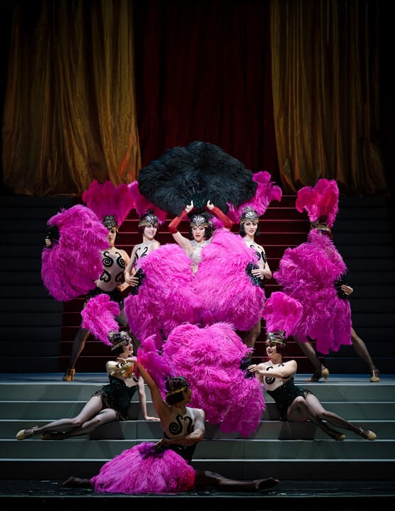 Operette wie man sie kennt und sich wünscht, aber nur als Vorderansicht bröckelnden Gesellschaftsstrukturen. Fin de Siècle Stimmung vor dem großen Knall, was Zitate zum Ausdruck bringen wie „mag die ganze Welt versinken“, „pfeife auf der Welt Misere“ oder „weißt du, ob es morgen nicht schon zu spät“. Das Werk stellt -im Spannungsfeld von oberflächlichem Amüsement einerseits sowie altem aristokratischem Gesellschaftsdenken und Walzerseligkeit andererseits - auch die Frage nach Standesunterschieden, Doppelmoral und wahrer Liebe. Uraufgeführt 1915, in der krisengeschüttelten Zeit des 1. Weltkriegs, ist Angst allgegenwärtig, das Ende der alten Ordnung, der k. und k. Monarchie wirft seine Schatten voraus. Weltuntergangsstimmung wird in ausschweifendem, realitätsvergessenem Taumel champagnerselig ertränkt. Eine dekadente Spaß-Gesellschaft am Rande des Abgrunds amüsiert sich fast zu Tode. Anfang und Ende des Stückes umrahmt ein einsamer Dialog zwischen dem bittersüß aufspielenden Stehgeiger und Feri Bácsi, dem Grandseigneur und Mittler zwischen Damals und Heute. Thomas Berau verleiht ihm mit warmem Bariton Weltwissen, changierend zwischen Melancholie und Lebensfreude. Das Bühnenbild von Davide Raiola zeigt im ersten Akt ein rot ausgeleuchtetes „Orpheum“ Varieté-Theater, mit hoher Show-Treppe, das später zum schmucklos-strengen, in grauen Farbtönen gehaltenen Fürstenpalais „derer von und zu Lippert - Weylersheim“ mutiert. Wirkungsvoll angestrahlt (Licht: Florian Arnholdt) schreitet Revuestar Silva Varescu die breite Treppe hinab, eine hochattraktive, platinblonde Hollywood Diva im glitzernden Bikini, umrahmt von ebensolchen glamourösen Tanzdamen mit pinkfarbenen Federboas. Die Kostüme von Falk Bauer sind eine Augenweide, ob in Tanz- oder in Abendrobe, die verführerischen „Mädis vom Chantant“ und der fulminante Chor unter der Leitung von Alistair Lilley machen in jeder Bekleidung eine gute Figur. Johanna Bodor hat allen Mitwirkenden ausgefeilte Choreografien auf den Leib geschrieben, mit viel Bewegungsfreude werden schwungvolle Formationen aufs Parkett gelegt. Nicht fehlen dürfen die Beine schwingenden Showgirls, Backstage ist nackte Haut jedwedes Geschlechts zu bewundern, dort geht es selbstverständlich sexuell locker und freizügig zu. Es lebe die Liebe und das süße Leben der Halbwelt! Der Dirigent Janis Liepinš entfaltet Kálmáns facettenreiche Partitur aufs Schönste, gibt den Walzern fein dosierten Schwung, die zündenden Rhythmen werden gewürzt mit ungarischem Temperament, traumselige Arien und Duette versetzen in eine idealisierte Vergangenheit. Der opulente Orchesterklang blüht manchmal für die Sänger eine Spur zu üppig. Diese Musik macht Freude und weckt die Lebensgeister. Alles dreht sich um Sylva Varescu. Astrid Kessler lässt in der anspruchsvollen Partie der Varieté-Diva ihren jugendlichen Sopran leuchten, geizt nicht mit dramatischen Höhen, ihre Auftrittsarie „Heia, in den Bergen ist mein Heimatland“ wird zur glanzvollen Visitenkarte. Darstellerisch intensiv, berühren vor allem die intimen Momente mit ihrem Herzensmann Fürst Edwin von und zu Lippert-Weylersheim.