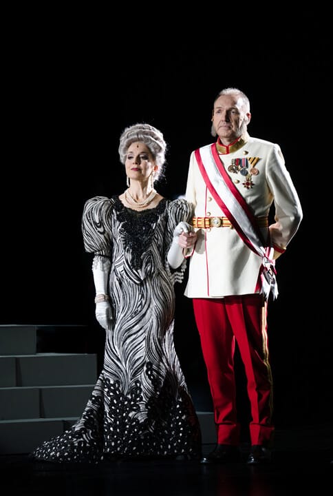 Sie verkörpert eine ernsthafte Frau, die weiß, was sie will; bangend zwischen Hoffnung und Resignation kämpft sie um ihr Liebesglück. Bis sich am Ende die richtigen Paare gefunden haben, gibt es die üblichen Verwicklungen, Hindernisse und besonders den Standesdünkel, den Fürstenspross Edwin gottlob abgestreift hat. Christopher Diffey setzt seinen schönen, lyrischen Tenor leicht und flexibel ein, überzeugt mit müheloser Höhe und schönen Kantilenen, in „Heut Nacht hab’ ich geträumt von dir“. Hingerissen von seiner Leidenschaft und wahren Liebe zu Silva, vergisst er seine adlige Haltung und erscheint zutiefst authentisch. Frauenheld Raphael Wittmer wirbelt als buffonesker Graf Boni mit Selbstironie durch das Nachtleben, gekonnt platziert er seine Pointen und erweist sich als virtuoser Darsteller. Er setzt mit seiner variablen Stimme tenorale Glanzlichter und präsentiert die schwungvollen Ohrwürmer „Die Mädis vom Chantant“ und „Ganz ohne Weiber geht die Chose nicht“ hinreißend. Komtesse Stasi, Bonis spätere Verlobte, wird von Theresa Steinbach mit lupenreinem, gut fokussiertem Sopran, bester Textverständlichkeit und viel Charme ausgestattet, eine vernünftige junge Frau, die kurzerhand Boni einen Heiratsantrag macht. Die Zeiten ändern sich erfreulicherweise. Das Elternpaar Leopold Maria, Fürst von und zu Lippert-Weylersheim und seine Gattin Anhilte erscheinen wie Karikaturen der letzten Tage der k. und k. Monarchie, man ist stolz auf das Adelsgeschlecht, das bis zu Kaiser Maximilian zurückverfolgt werden kann. Es herrscht militärischer Drill, die Dialoge werden mit viel Witz und Schlagkraft geführt, das Regiment führt Anhilte, die Michaela Schneider herrlich steif und dünkelhaft vorführt, vor allem wenn sie ihren „Leopold Maria“ aufstampfend zur Ordnung ruft. Erzkomödiant KS Thomas Jesatko hat die meisten Lacher auf seiner Seite, auch wenn er am Ende feststellen muss: „Ich gebe jeden Widerstand auf. Zwei Chansonnetten in der Familie, mein Stammbaum zerfällt in lauter Brettl!“.