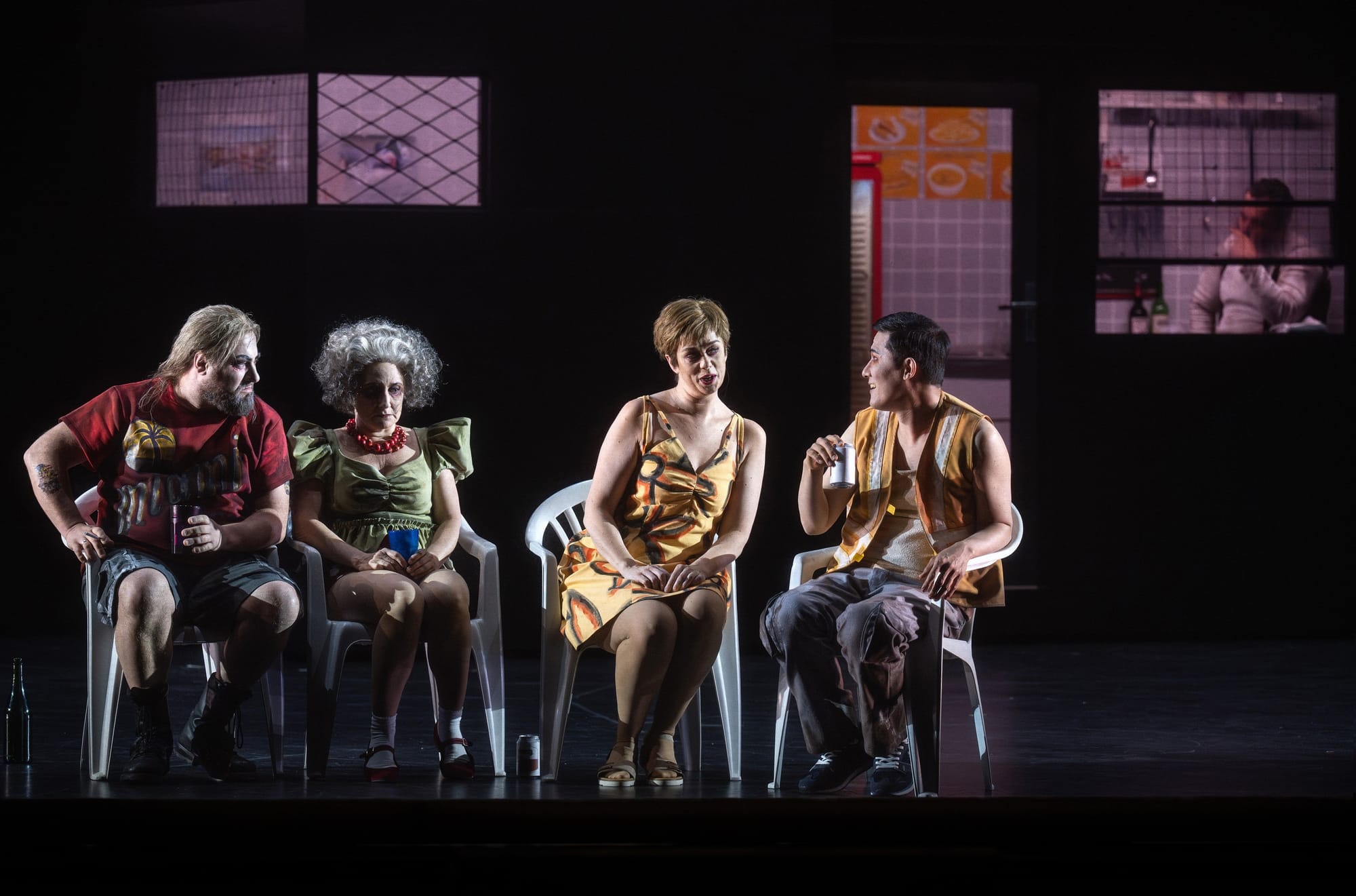 Nigel Lowery kleidet „Il tabarro“ in bedrohliche Dunkelheit, man blickt auf eine Hafenskyline, die sich hell und kalt über der dahinfließenden Seine erhebt, in der Mitte der Bühne ein trostloser Kiosk, der den hart Arbeitenden kleine Freuden bietet: Alkohol, Zigaretten, ein verstohlenes Tänzchen; das Leben hält nicht mehr viel bereit für die Abgehängten. Kaum einmal hat die Liebe eine Chance bei Michele, dem alternden, verhärmten Kahn-Besitzer und seiner viel jüngeren Frau Giorgetta. Das gemeinsame Kind ist gestorben, Angst, Misstrauen haben sich in die Seelen eingegraben. Videoprojektionen zeigen riesige Gesichter mit weit aufgerissenen Augen, die das Entsetzen der drei Protagonisten spiegeln. Beklemmend, unter die Haut gehend. Michele, mit grauem Zopf und weitem Kapuzenmantel, ahnt die Affäre von Giorgetta und Luigi, seinem Angestellten. Gestohlene Stunden kurzen Glücks lassen die jungen Liebenden der elenden Realität entfliehen und vage Zukunftshoffnung aufscheinen. „Es ist schwer, glücklich zu sein“ (Giorgetta). Evez Abdulla als Michele hat jede Lebensfreude verloren, gebrochen, müde, schleppt er sich dahin, seinem schönen kernigen Bariton gibt er die düstere Farbe des Einsamen, im Monolog „Nulla! Silenzio“ entfaltete er seine variable Stimme mit großer Ausdruckskraft. Leah Gordon im geblümten Mädchenkleid verleiht der Giorgetta Jugendlichkeit und Frische zwischen all den gestrandeten Figuren. Ihrer Zerrissenheit zwischen Michele und Luigi begegnet sie mit herrlich aufblühenden Sopran, puccinischem Melos und kraftvollen Spitzentönen. Der junge Sung Min Song beeindruckt als wahrhaft Liebender mit großer klarer Tenorstimme, die mühelos und frei in allen Lagen glänzt. Seine Auseinandersetzung mit dem Widersacher Michele endet für ihn glimpflich: als dieser die Affäre entdeckt und Luigi mit dem Ehebruch konfrontiert, ersticht Michele nicht den Rivalen, sondern sich selbst; das tragisch-unausweichliche Ende des Lebensmüden. Als skurriles Paar agierten und sangen hervorragend Marie-Belle Sandis (La Frugola) und Bartosz Urbanowicz (Talpa) sowie Uwe Eikötter (Tinca).