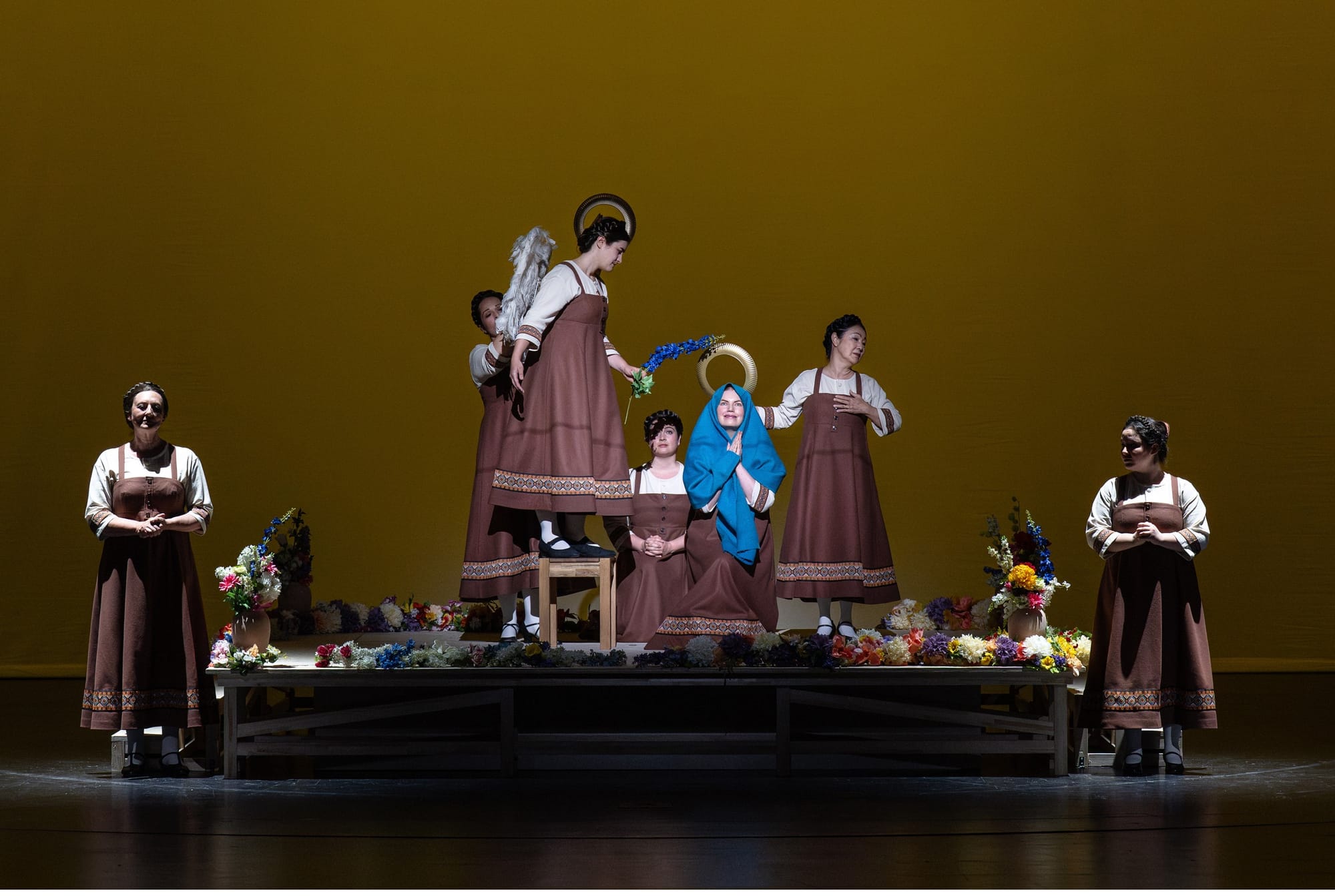 Das „Lyrische Drama“ „Suor Angelica“ gestaltet Nigel Lowery als sakrales Mysterienspiel einer reinen Frauengemeinschaft, in der das Ritualhafte im Vordergrund stehen soll (Nigel Lowery). Vorhänge und kitschige Rosengebinde rahmen den Bühnenausschnitt ein. Zu Beginn necken sich eine junge Nonne und ein junger Mann, der später als Jesusfigur in unterschiedlichen Bildern auftritt. Dann beginnt das Spiel. Vorhänge werden auf- und zugezogen, Partylämpchen aufgespannt, die Frauen tragen alle die gleiche Tracht, es gibt eine kleine Holzbühne in der Mitte, auf der einzelne Szenen wie Genrebilder nachgestellt werden, die zu Tableaus erstarren: Maria Verkündigung, Da Vincis Abendmahl, die Pietà von Michelangelo. Liturgische Requisiten wie Kelch und Hostienschale stehen auf der Bühne, später auch der Heilige Speer, den die Jesusfigur bringt, eine Szene, die stark an den Schluss von Wagners „Parsifal“ erinnert; auch das ritualisierte Klosterleben wird zur Schau gestellt. Leah Gordon war wieder in der weiblichen Hauptrolle zu erleben und brillierte als Schwester Angelica mit einer grandiosen Rollengestaltung; ihre große Szene „Senza Mamma“ wurde zum stimmlichen Zentrum des Abends, aufrührend, leidgeprüft, mit zarten Schattierungen und bewegenden Steigerungen. Der Schmerz um den Verlust ihres unehelichen Kindes wird für sie zur Todesgewissheit, der Wunsch nach Vereinigung im Jenseits lässt den Suizid zu einer inbrünstigen Himmelfahrt werden, in ihrer großen Verklärungsszene wird man auf hochexpressiven Gefühlswogen hinweggetragen. Ihre kaltherzige Verwandte La Zia Principessa erscheint als schwarz verhangene Hexe mit Besen, fegt den Bühnenboden und setzt ihre junge Verwandte unter Druck. Julia Faylenbogen singt sie mit dunklem, voluminösem Alt, textdeutlich und eindringlich. Ganz ausgezeichnet präsentierten sich Seunghee Kho, Marie Belle-Sandis und Gerda Maria Knauer als weitere Nonnen sowie die wunderbar singenden Chordamen.