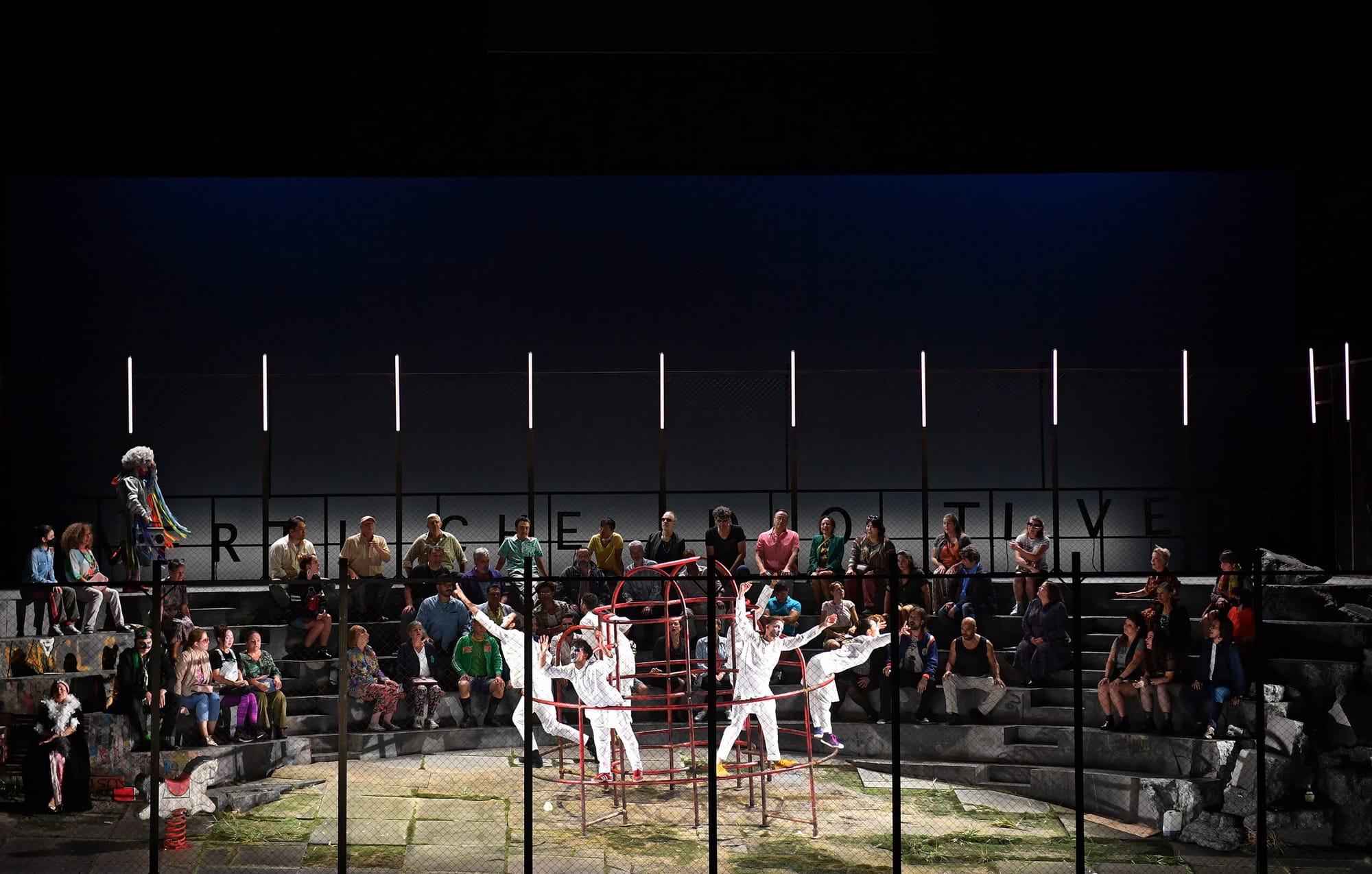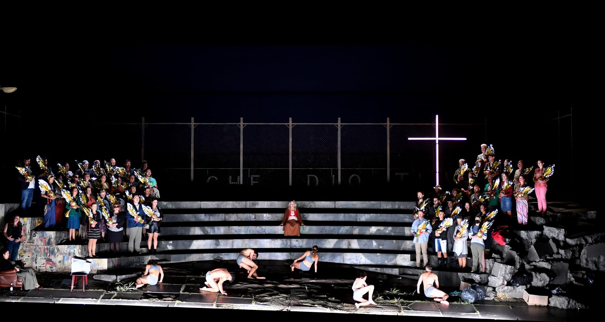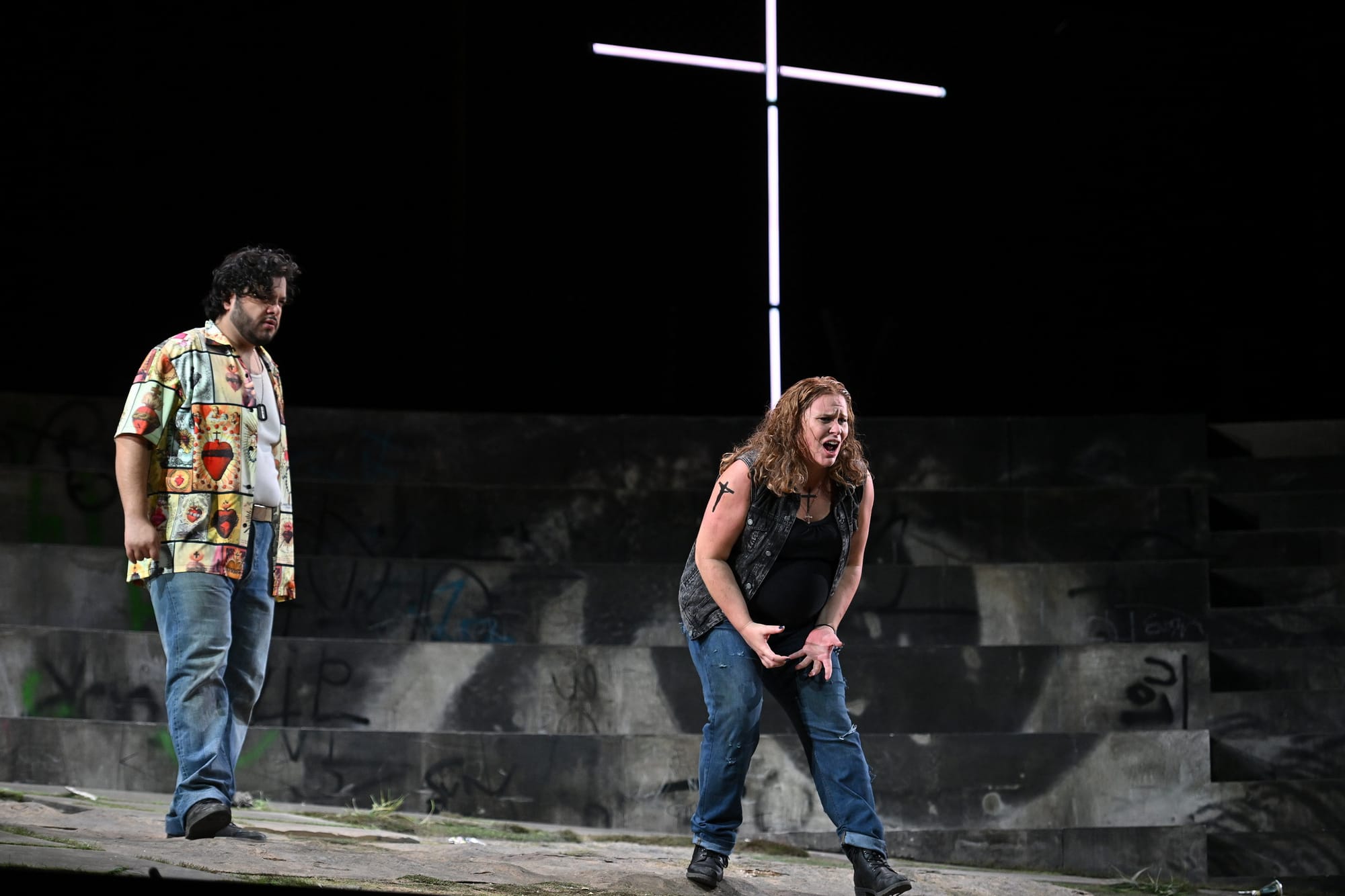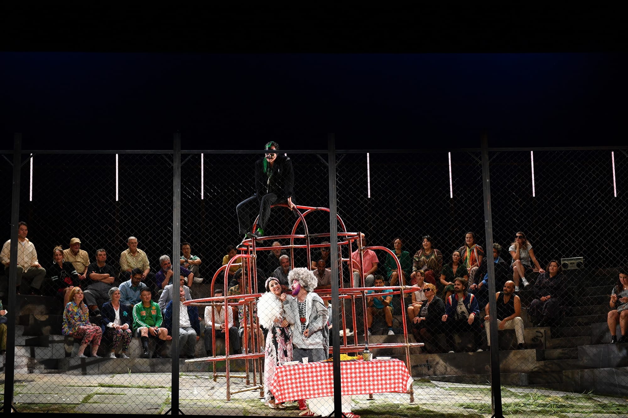 Diese Koproduktion mit der Opéra National de Toulon, die 2024 in einem Freilichttheater aufgeführt wurde, eröffnet die Saison in Montpellier. Vor dem Hintergrund aktueller und gesellschaftlicher Ereignisse wird der Schauplatzt der beiden Verismus-Dramen aus den Orten und der Zeitlichkeit des 20. Jahrhunderts entfernt, um die soziale Gewalt unserer Zeit deutlicher anzuprangern. Dies steht im Kontrast zur nüchternen Regie von der gleichfalls italienischen Regisseurin Emma Dante in der Produktion an der Opéra de Gèneve im Jahre 2018. Auch das sizilianische Dorf am Vorabend von Ostern in Cavalleria Rusticana und das kalabrische Dorf, das die reisende Straßentheater-Truppe im Pagliacci herzlich willkommen heißt, werden hier auf einem heruntergekommenen Platz aufgeführt. Umgeben von Zäunen aus Brachland macht der Halbkreis aus markierten Tribünen den Bühnenvorderteil frei für den Austausch der zeitgenössischen Protagonisten in aktueller Kleidung, entworfen von der italienischen Kostümbildnerin Agnese Rabatti. Eine intime Ecke vor dem Fernseher bei Mamma Lucia in Cavalleria Rusticana, ein vertraulicher Dorfklatsch mit den Bewohnern des Dorfes unter dem in Neonleuchtenden Heiligenschein von der italienischen Lichtbildnerin Fiammetta Baldiserri. Das einzigartige Kunststück von der italienischen Bühnenbildnerin Emanuelle Sinisi verleiht dem Diptychon eine gewisse dramatische Kohärenz, indem es auf diese Randgruppen der Gesellschaft hinweist, die beten, sich lieben und sich gegenseitig umbringen. Die Regisseurin Paoli spielt geschickt mit der Höhe und Tiefe der Tribünen und der Einfassung der Gitter für die Gemeinschaftsszenen, wie etwa die Ostermesse am Ausgang der Kirche in Cavallaria Rusticana. Für Pagliacci wird dieses Kunststück frontal: Die Zuschauer auf den Tribünen verfolgen die Aufführung der Commedia dell’arte wie ein antiker Chor. Sie sind somit ein Spiegel des Publikums in der Opéra Berlioz / Le Corum, das genauso durch das reale und schmutzige Drama des angekündigten Frauenmords an Nedda in Frage gestellt wird. In diesem Raum stellen das Graffiti „Piangi la Madonna“ und das Neonkreuz die fanatischen katholischen Bezüge her. Durch die Hinzufügung der stummen Rolle einer Obdachlosen und der sechs Tänzer unterstreicht die Regisseurin das sozioreligiöse Thema, eine wahre Grundlage des Verismus. Die alte Dame interpretiert von der italienischen Schauspielerin Giuseppina Merli symbolisiert die Menschlichkeit, die den Ausgeschlossenen ein wenig Trost spendet und sogar den Schmerz einer Pieta, die zu Ostern die liegenden Körper der Tänzer in ihren Armen hält. Die Breakdancer mit einer Choreografie von der italienischen Choreografin Emanuela Rosa verkörpern die Mafia-Kriminalität der Vorstädte, bevor sie sich als fröhliche Donald-Duck-Plüschtiere verkleiden.