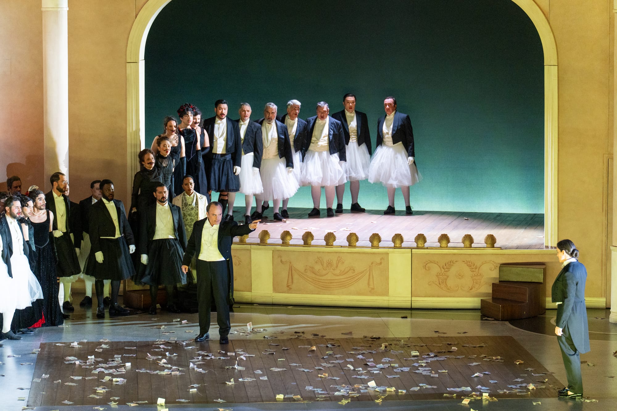 Zu Beginn der Handlung schreitet eine Reihe von Männern in Zylindern, in der Kleidung des zweiten französischen Kaiserreichs - die mit den anderen Kostümen von der italienischen Kostümbildnerin Valeria Donata Bettella kreiert wurden -, auf die Bühne und schreitet brutal über Violettas tanzendes Abbild. Die Bühnenbilder der italienischen Bühnenbildnerin Lisetta Buccellato sind bewusst künstlich, ein Stück im Stück, ein Effekt der Täuschung, der den korrupten und entfremdenden Gesellschafts-Mechanismus verdeutlicht, in dem Violetta – die armenische Sopranistin Ruzan Mantashyan - gefangen ist. Sie versucht, trotz der starren Regeln der Hight Society des 19. Jahrhunderts als freie Frau zu leben und huscht in Pappkulissen umher, die an die sarkastischen Gemälden des Pariser Lebens von Édouard Manet (1832-1883) und Frédéric Bazille (1841-1870) erinnern.