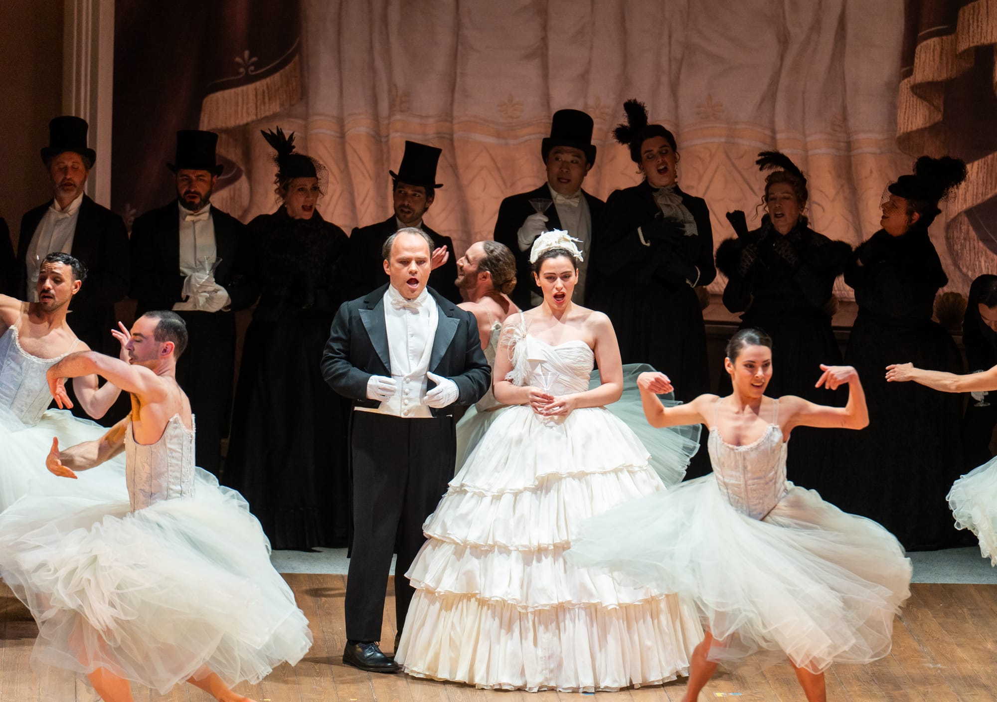 Nach ihrem Rollendebüt als Violetta an der Staatsoper Hamburg im Jahre 2025 widmet sich Mantashyan dieser anspruchsvollen Partie mit großem Engagement. Die Feinheit ihres Legato, die Zahrheit ihrer Pianissimo-Höhen in der Landhausszene sowie die in sich gekehrte Emotionalität ihrer letzten Augenblicke zeugen von einer strukturierten Herangehensweise, die von einer ergreifenden Tinta im Sinne Verdis getragen wird. Obwohl ihre Koloraturen im „Brindisi“, noch etwas gehemmt und mitunter angestrengt bleiben – eine verständliche Einschränkung für eine Premiere – nicht im „Sempre libera“, wo sie ihrer Puppe gegenübertritt und diese energisch zurückweist. Auch sollten wir nicht ihre großartige Verkörperung dar Tatiana in Eugen Onegin, Op. 24 (1879) von Pjotr Iljitsch Tschaikowski (1840-1893) an der Opéra National de Paris vergessen (Siehe IOCO-Kritik vom 09.02.2026). Als launischer junger Liebhaber ist Owens Alfredo als „Einspringer“ einfach umwerfend. Während er das berühmte „Libiamo“ mit Inbrunst interpretiert und in „De’ miei bollenti spiriti“ elegante Phrasierung beweist, entfaltet sich sein hohes Register erst in der schmerzlichen Intensität des Duetts „Addio del passato“ vollends. Myshketa als Giorgio Germont, der bereits Erfahrung mit Verdi-Rollen hat, verkörpert einen autoritären und kompromisslosen Vater. Sein samtweiches Timbre, seine voluminöse Stimme und seine vielfältigen Akzente – von Würde über Doppelzüngigkeit bis hin zu Entschlossenheit, je nach seiner Strategie – verleihen der Figur eine beständige bedrückende Präsenz. Vom zentralen Duett mit Violetta in die Arie „Di Provenza il mar” bis hin zur Ermahnung an seinen Sohn etabliert er sich als unerschütterlicher Dreh- und Angelpunkt des Dramas.