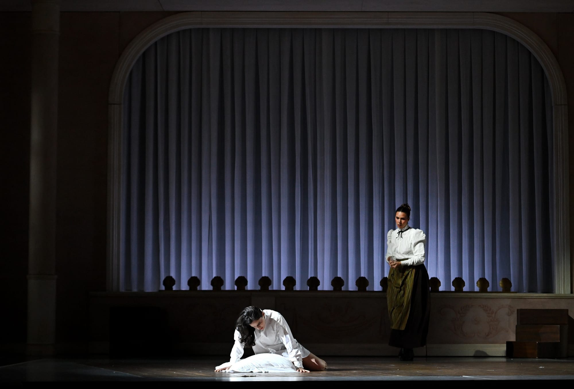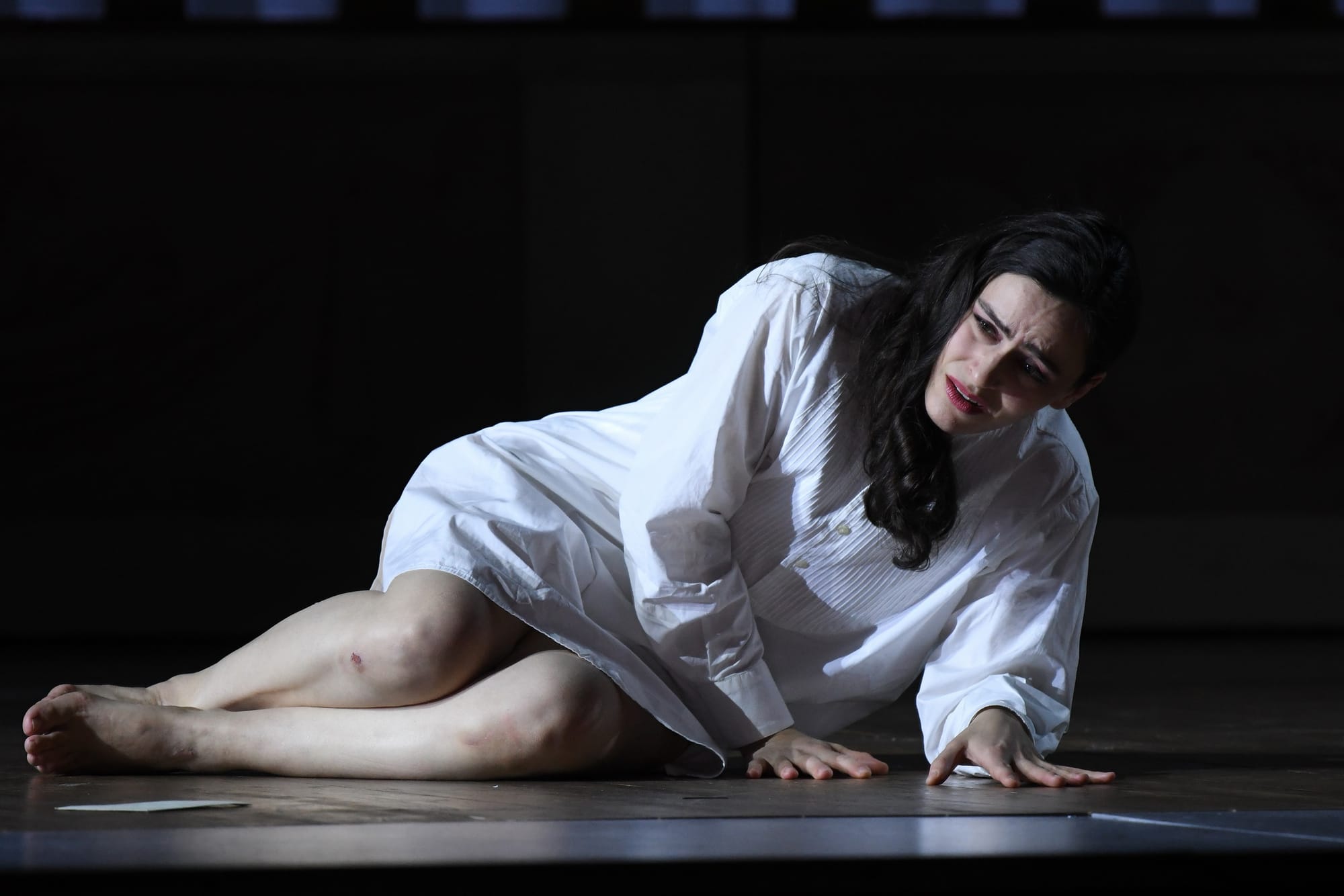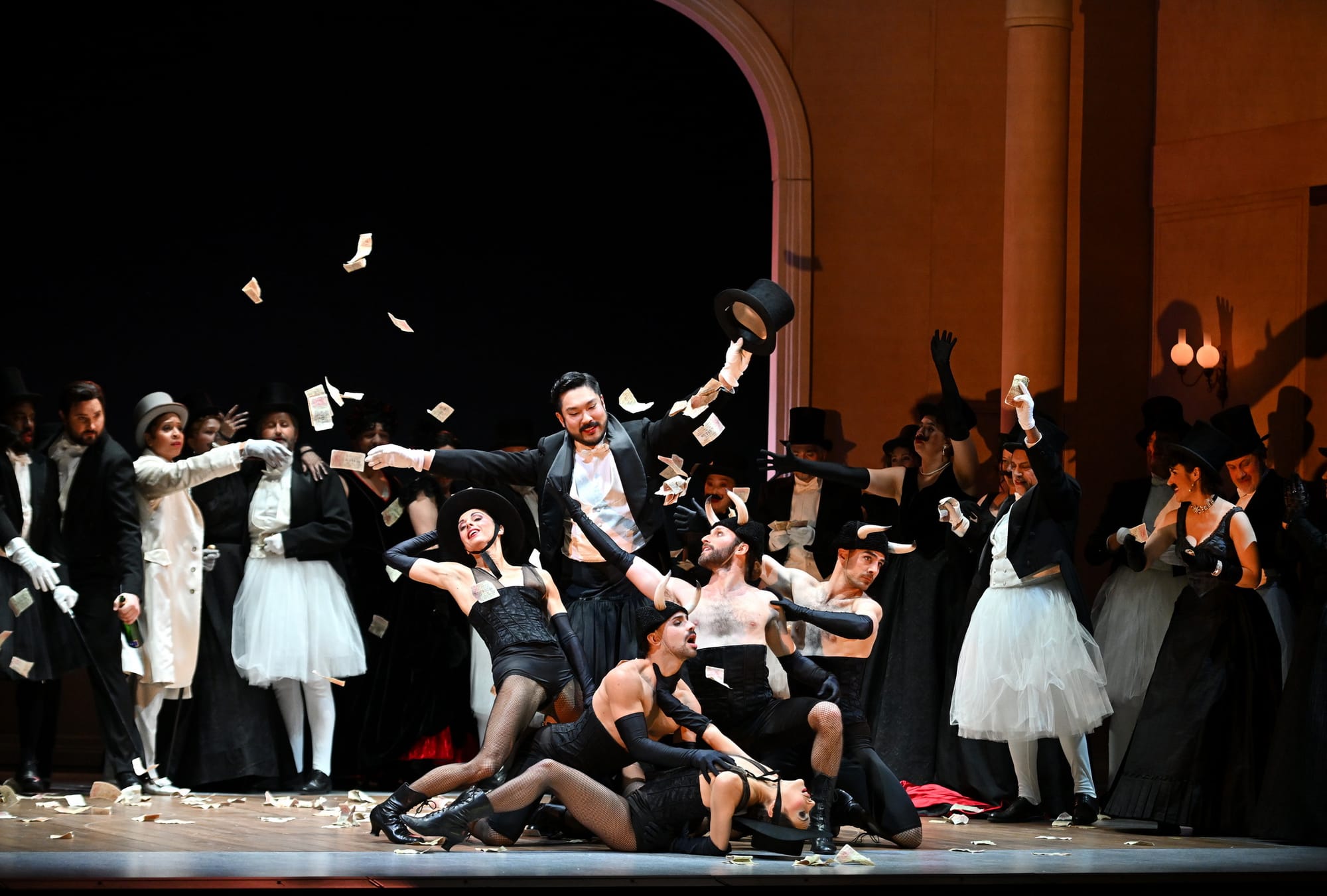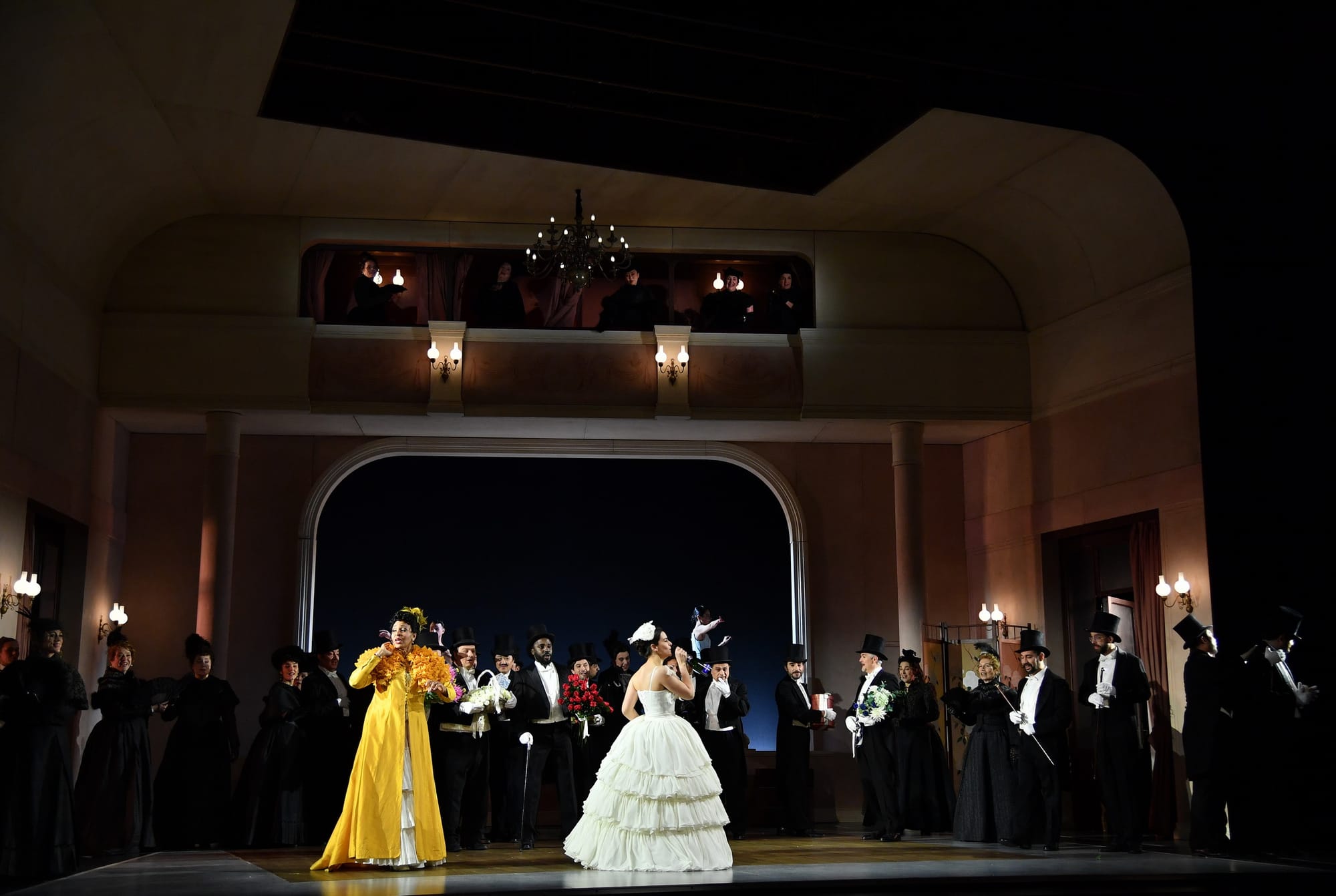 Zu Beginn der Handlung schreitet eine Reihe von Männern in Zylindern, in der Kleidung des zweiten französischen Kaiserreichs - die mit den anderen Kostümen von der italienischen Kostümbildnerin Valeria Donata Bettella kreiert wurden -, auf die Bühne und schreitet brutal über Violettas tanzendes Abbild. Die Bühnenbilder der italienischen Bühnenbildnerin Lisetta Buccellato sind bewusst künstlich, ein Stück im Stück, ein Effekt der Täuschung, der den korrupten und entfremdenden Gesellschafts-Mechanismus verdeutlicht, in dem Violetta – die armenische Sopranistin Ruzan Mantashyan - gefangen ist. Sie versucht, trotz der starren Regeln der Hight Society des 19. Jahrhunderts als freie Frau zu leben und huscht in Pappkulissen umher, die an die sarkastischen Gemälden des Pariser Lebens von Édouard Manet (1832-1883) und Frédéric Bazille (1841-1870) erinnern.