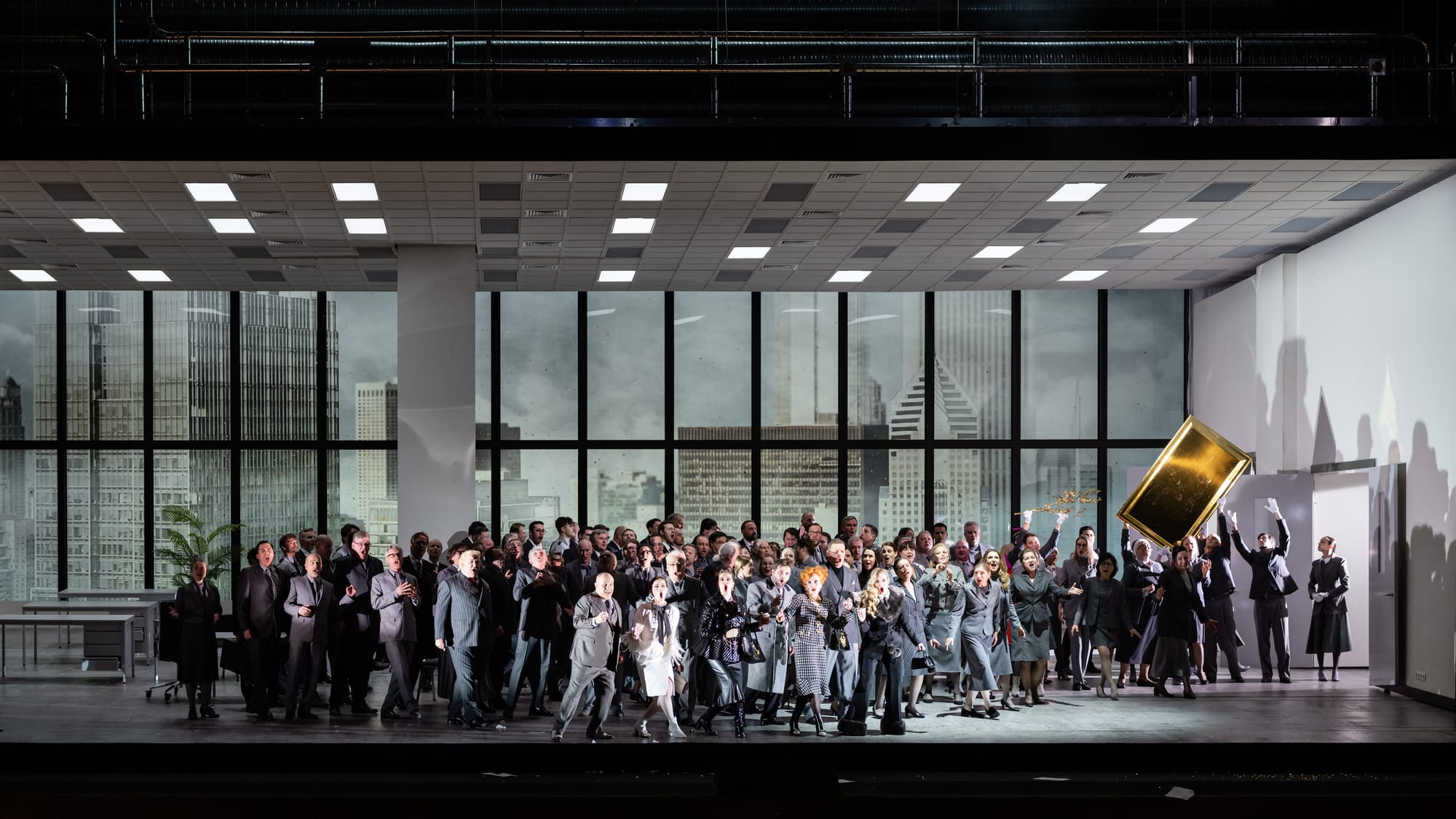 Claus Guth hat mit allem märchenhaften Geplänkel gründlich aufgeräumt. Die Bühne ist alles andere als die Darstellung einer Idylle. Zwar agieren die Hauptpersonen zuweilen wie Märchenfiguren im Vordergrund. Manchmal von hoch oben, von einer Empore herab argwöhnisch, aber unbehelligt beäugt (wohl von den ironischen Göttern?). Und das Geschehen ist durch eine dicke Glaswand von der Realität getrennt. Aber sie, die Realität, ist allgegenwärtig, und das ist keine Märchenwelt mit romantischer Landschaft, bizarren Felsen und ewiger Sonne. Gleich am Anfang merkt man: Hier wird mit der Moderne gehandelt und verhandelt.