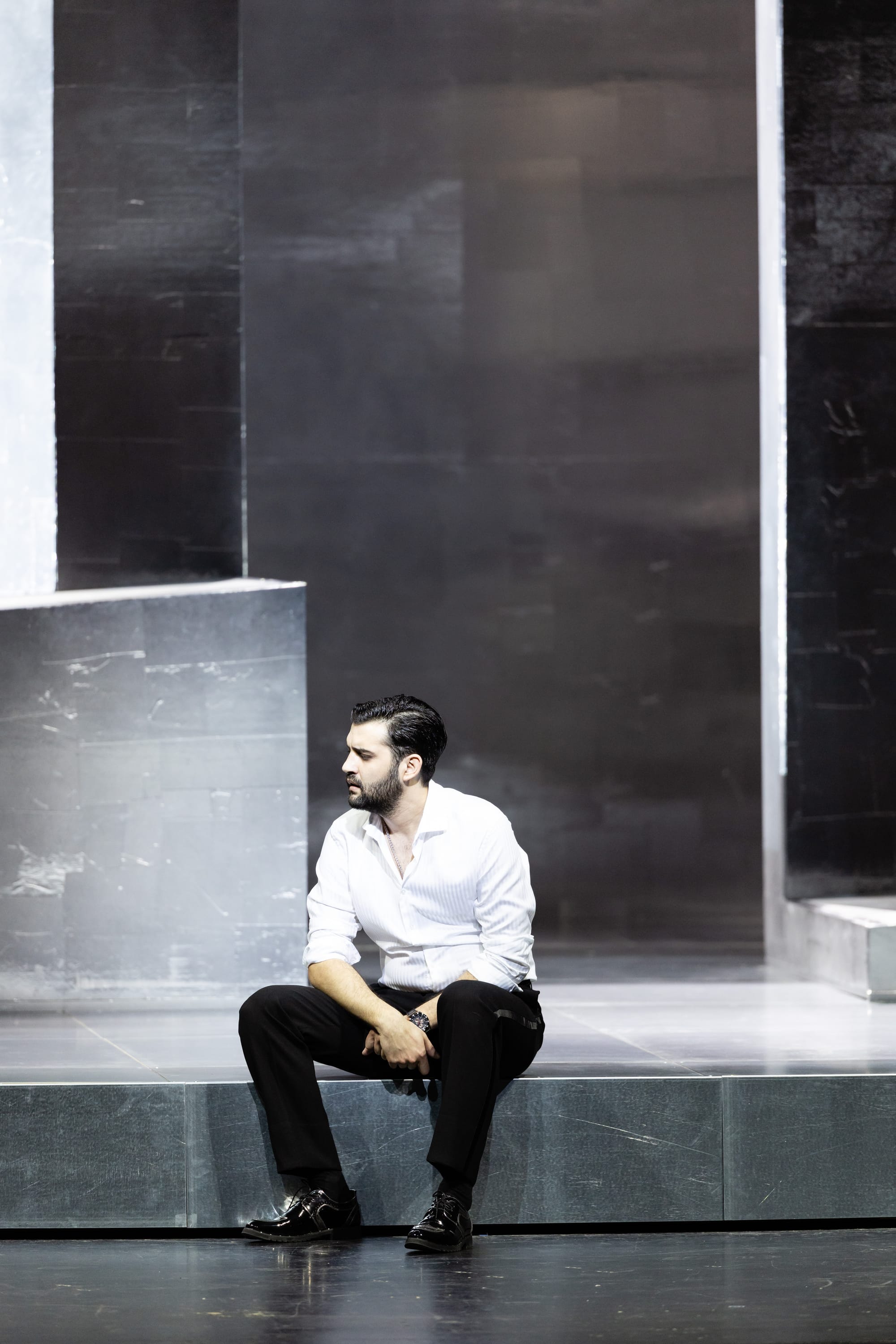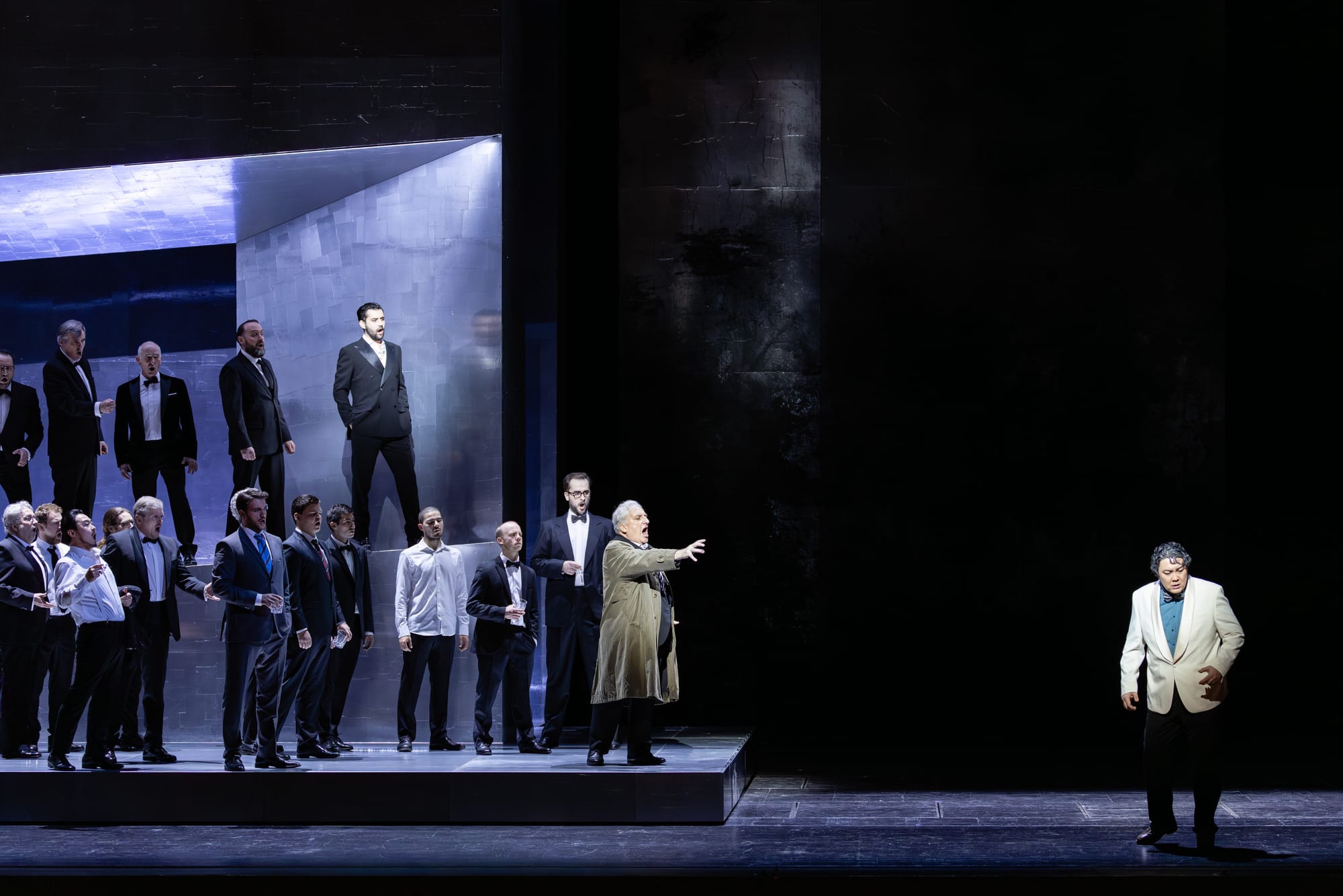 Mal ganz abgesehen von den inhaltlichen Wirrnissen des ersten Aktes, den Querverbindungen und Liebschaften, den angeblichen Eskapaden des Herzogs (Bekhzod Davronov, il Duca di Mantova) muss man sich bei dieser Inszenierung heutzutage schon sehr anstrengen, um in den Abgrund der Sittenlosigkeit zu schauen. Da haben uns der Epstein und seine Besucher schon einst etwas ganz anderes vorgemacht und in gewisse Sümpfe der Fantasie geführt. Nein – das soll gar keine Kritik an der Inszenierung sein, sie hat durchaus diskret eine gewisse Normalität gewisser libidinöser Beziehungen und Verhältnisse zart und am Rande vorgeführt, über die man sich heute nicht mehr aufzuregen braucht. Die es auch nicht zur Sensation bringen. Zum Glück oder zum Leidwesen der Sittenrichter, je nach Standpunkt und Geschmack –, freilich abgesehen von den strafrechtlich relevanten Missbräuchen an Minderjährigen und grauenhaften Gesetzesverstößen, die es offenbar zur Schwärzung gewisser Unterlagen brachten. Nein – dieser Herzog scharwenzelt da herum, vergnügt sich hier und da, und die Damen sind offenbar ganz einverstanden. Abgesehen davon, dass allenfalls im Hintergrund eine zarte Andeutung von „Spektakulärem“ (?) zu sehen sein könnte, wenn man schon sehr genau hinsieht. In dieser dankbar vorsichtigen und taktvollen Inszenierung der Barbara Wysocka geschieht nichts Anstößiges.