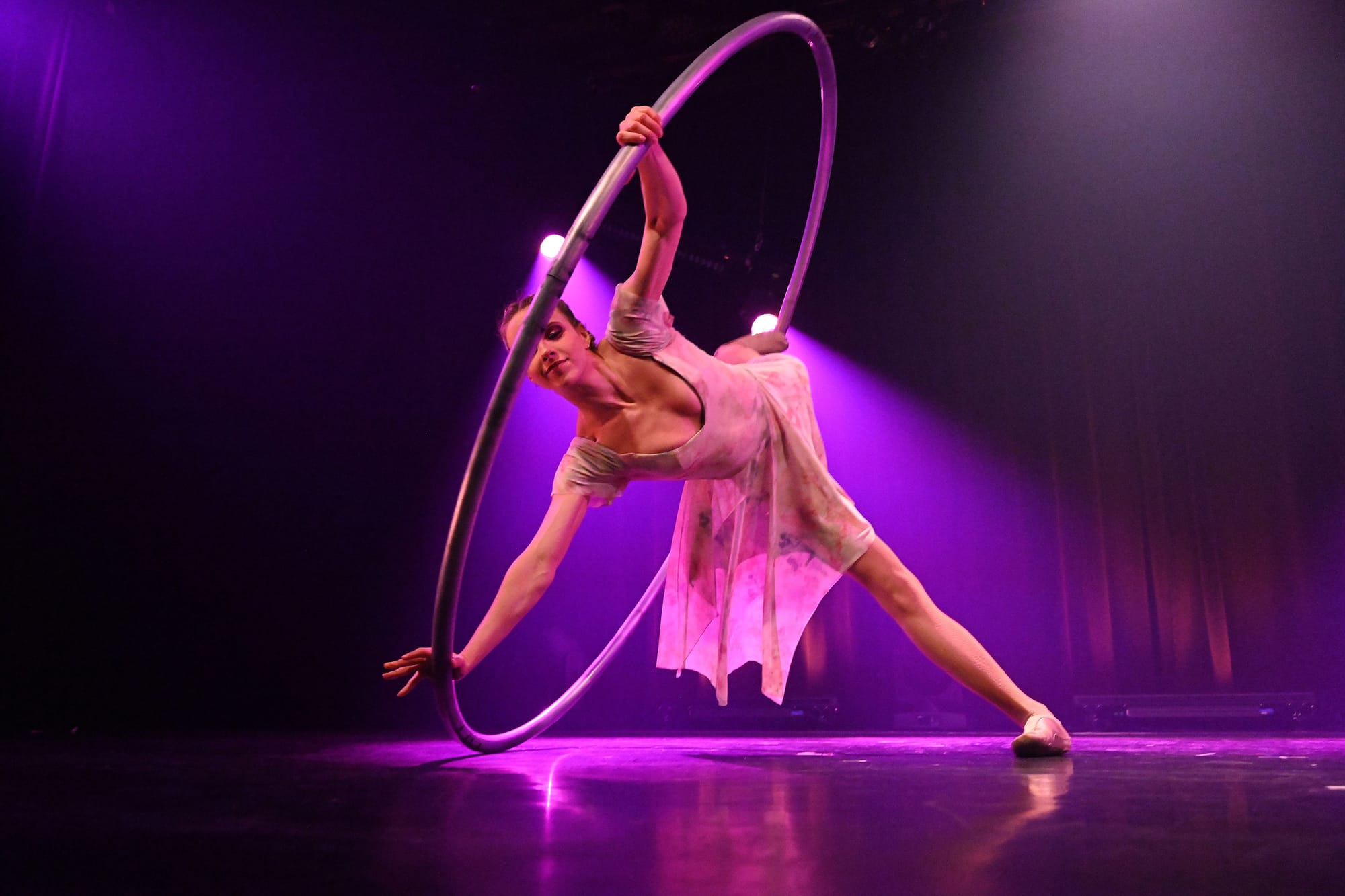 Für den artistischen Teil der Show bildet die Diabolo-Interpretation von Hilary einen wunderbaren Einstieg. Je länger sie mit kaum nachvollziehbarer Geschwindigkeit und unglaublicher Präzision ihre Diabolos um sich herum und meterhoch in die Luft jagt, desto stärkere Energie geht von ihr aus und springt ins Publikum über. Und ebenfalls auf ihre eigene Weise berührt Cléa Périon, die mit ihrem Cyr-Reifen einen romantisch leichten Elfentanz aufführt, den sie mit einem mitreißenden Wirbel ausklingen lässt.