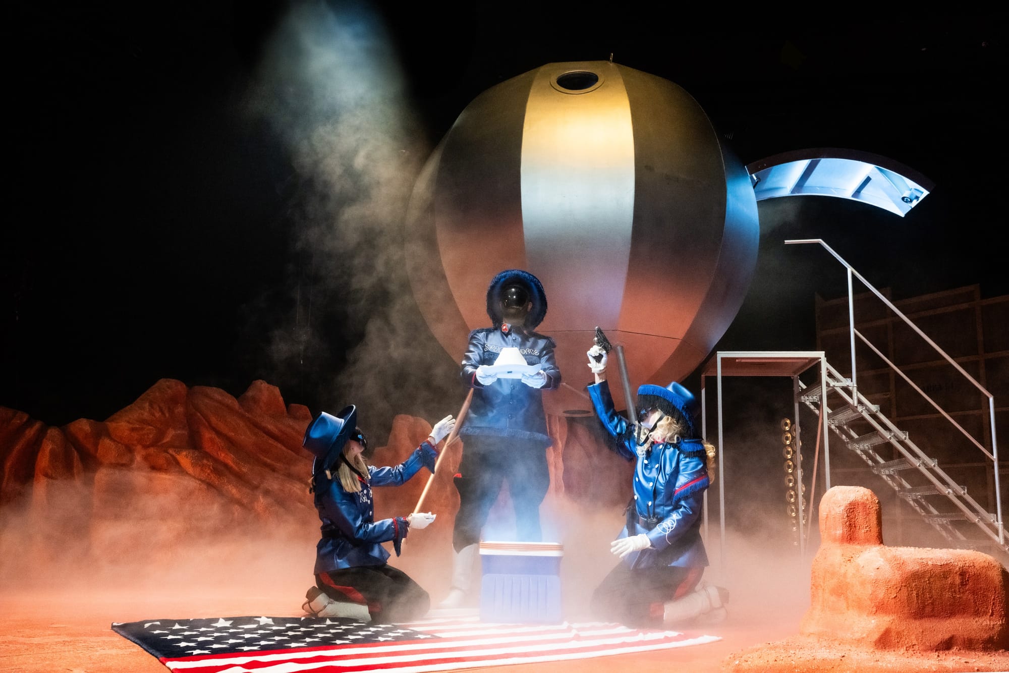 Nachdem die drei Raumfahrer eine US-amerikanische Flagge auf dem rötlich-braunen, am Rand felsigen Boden ausgebreitet haben, beginnen die Drei zwischen Raumschiff und Küche eine Unterhaltung im Alltagston, von der nicht klar ist, ob sie sich wirklich so unterhalten oder ob der Text zu ihrer Raumfahrer-Rolle gehört. Es geht darin um den wiedergewählten Trump als auferstandener Messias oder als König, aber auch als einer, der kleiner ist als sein „Schatten“, der ihn ersetzen wird. Auch das Wahlvolk wird abgewatscht, das endlich, nach langem Streben nach oben, nun von oben nach unten drücken darf - alles recht pauschal und wenig originell.