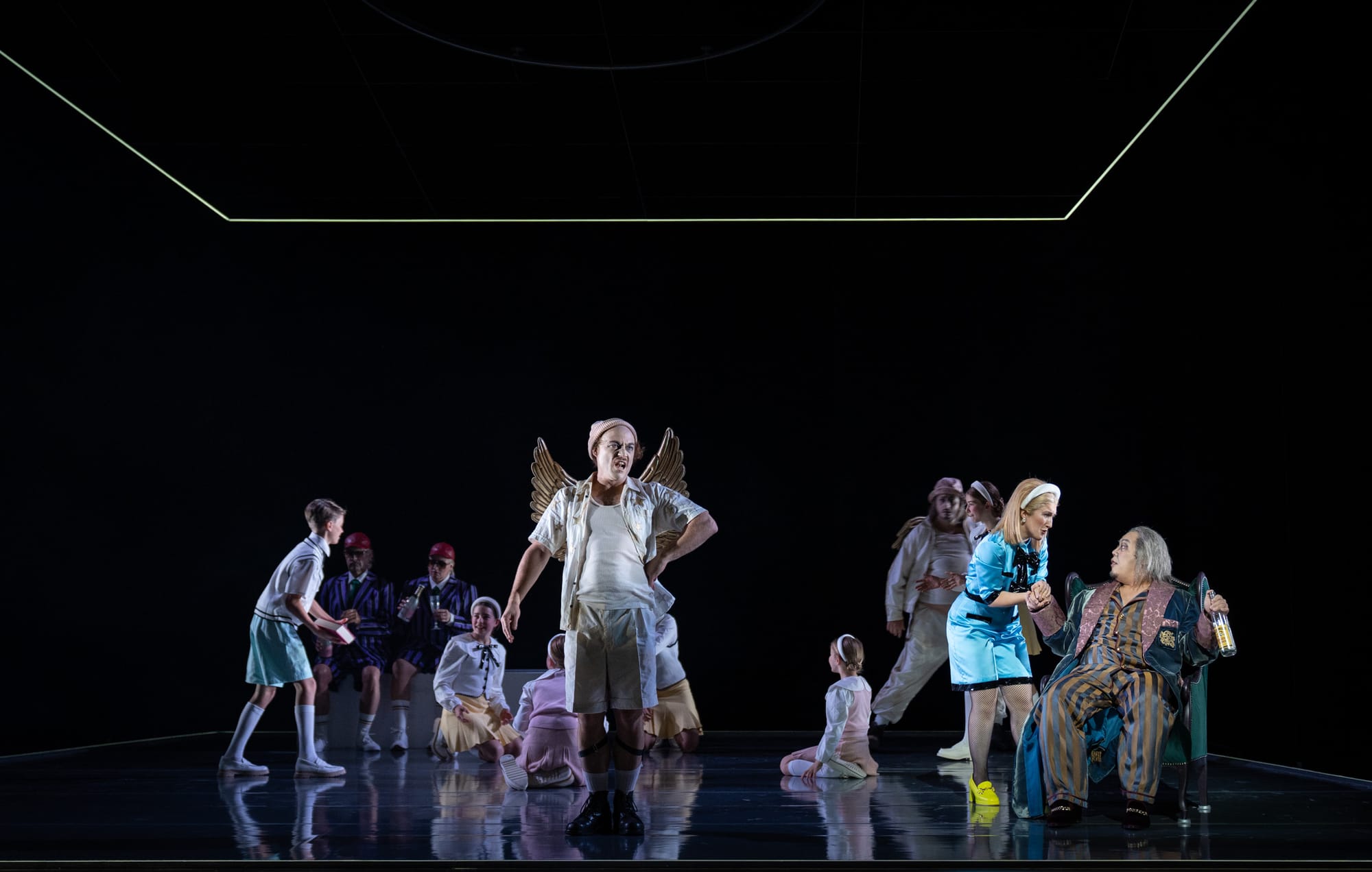 Dazu kommt, dass Schuhmacher dem Kinderchor, der nach knapp 15 Minuten seine partiturgemäßen Pflichten erfüllt hat, weitere üppige szenische Aufgaben zukommen lässt. Zunehmend verschwinden deren bunte Kostüme und sie werden allesamt ebenfalls zu silbernen „Engelein“, die dann die Szene zusätzlich bevölkern. Eine Deutung als „14 Nothelfer“ wie in Humperdincks Hänsel und Gretel stellt sich allerdings nicht ein; wäre auch abseitig. Im Wettkampf der beiden Juxgestalten Schmidt und Johann zählt der Triumph über den Sieg in der Sache. Dass dieser sich am Ende für keinen der beiden einstellt: Geschenkt!