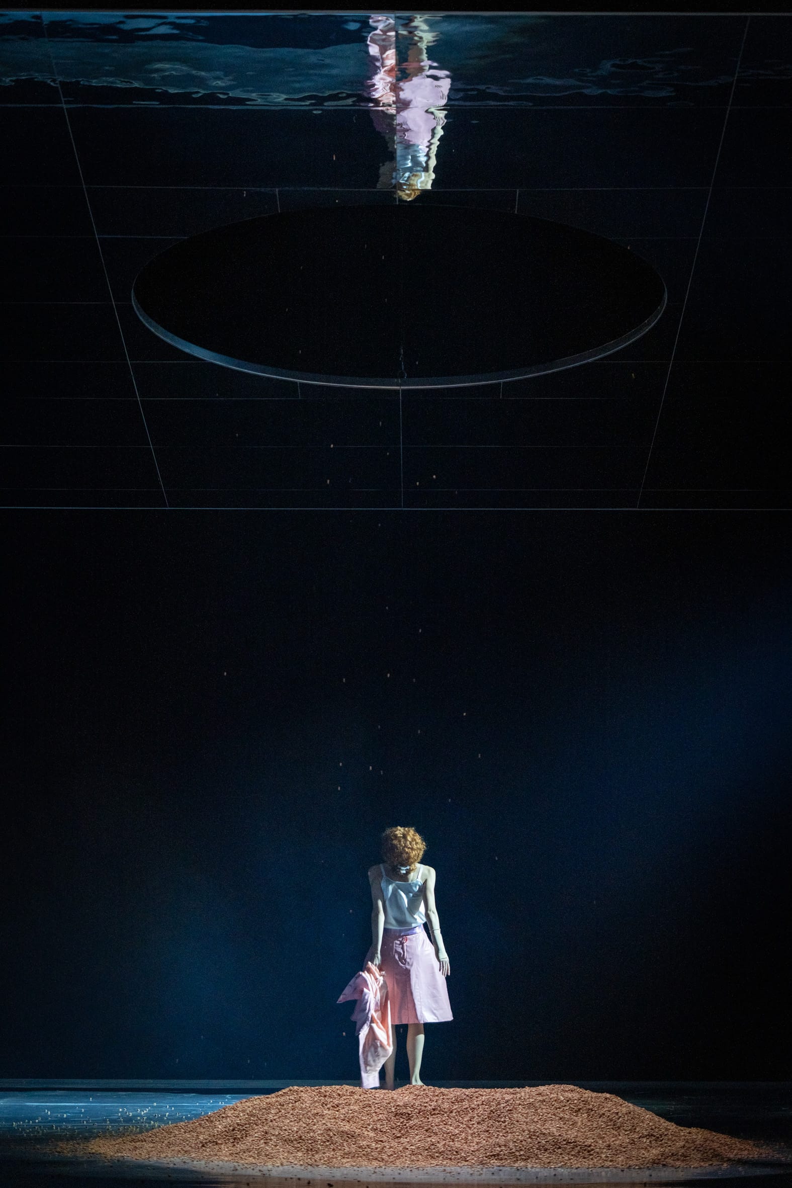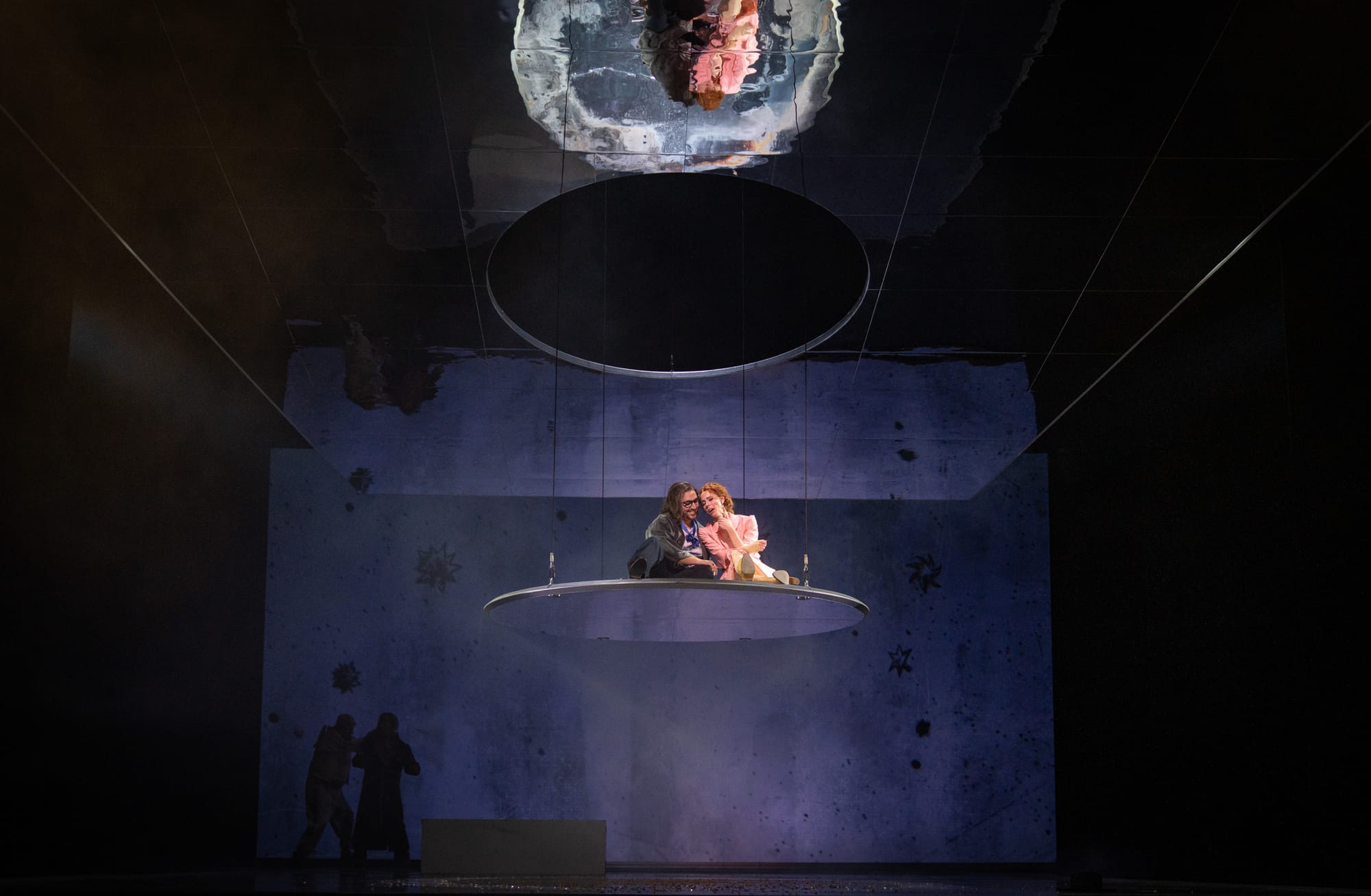 Und mit einem weiteren überraschenden Element wartet der Plafond auf: Eine gut drei Meter große kreisrunde Öffnung, die ebenfalls abgesenkt werden kann und Platz und Belastbarkeit für die beiden Protagonisten bietet. Da entschweben die Träumenden in eine andere Welt, lässt das freie Loch Sicht auf einen fernen Traumplaneten (vermutlich der Mond), rieselt beständig blutroter Schnee auf die Agierenden. Neonumrandet werden diese Bühnenelemente zum beengten Ort für all die Mono- und Dialoge von Charlotte und Werther, die ihnen und uns die Ausweglosigkeit all ihrer Lebenspläne vor Augen führen. Am Ende fallen alle diese räumlich begrenzenden Elemente. Werther entschwindet als Geist im Dunkel, Charlotte durch eben eine solche Öffnung auch. Wohin? Wer weiß?...