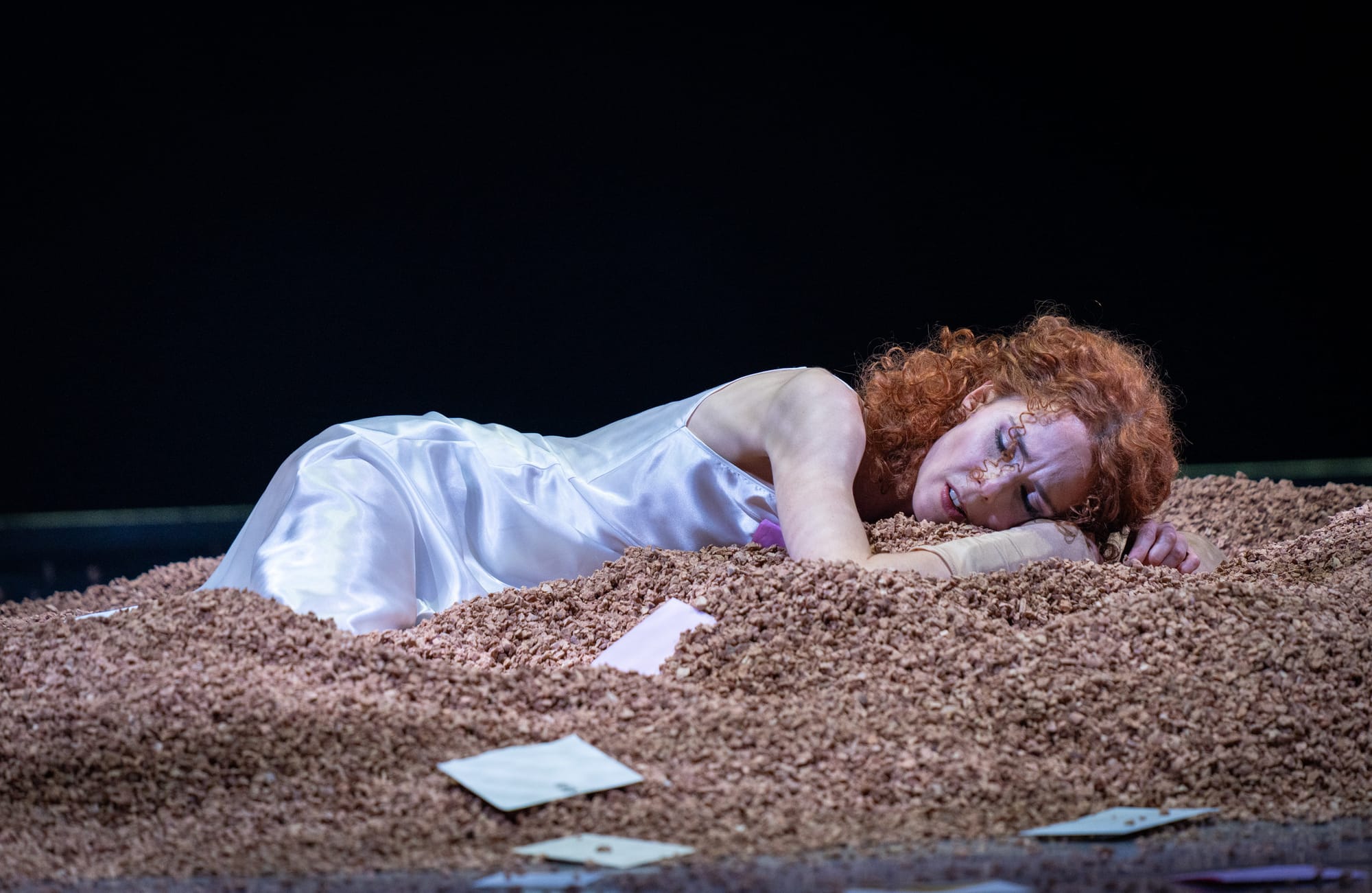 In diesem seherisch blutgetönten Schnee wälzt sich zerknirscht und selbstkritisch Charlotte (jetzt weiß gekleidet) und liest wieder und wieder die Liebesbriefe von Werther. Die Regisseurin verlangt ihren Protagonisten einiges ab beim Waten in den rotgefärbten Substanzen und in allen denkbaren Positionen. In ihren beiden zentralen Arien, die wir später eingehend untersuchen, rührt Charlotte bis ins Mark. Es ist ihr Akt!