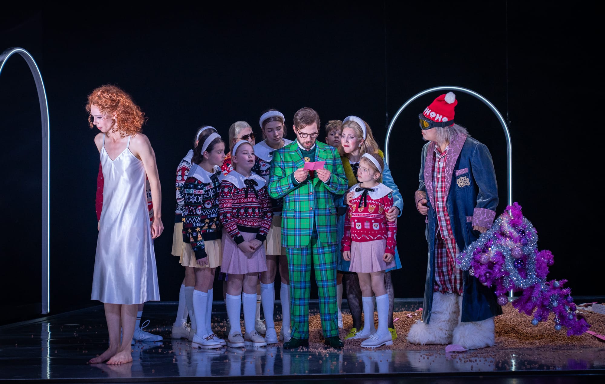 Der Kinder- und Jugendchor des Staatstheaters (Einstudierung: Marija Jocovic) hat dazu zwei Hände voll Eleven abgestellt, denen nicht nur die wenigen Strophen und Takte des Weihnachtsliedes „Noel!“ anvertraut sind. Vielmehr hat die Regisseurin die Schar an kleinen und größeren jungen Menschen immer einmal wieder in die Folgeakte szenisch eingebunden. Ein Impuls, den die jungen Leute mit Gewinn und mit szenischer Disziplin gut meistern. Das klangliche Volumen, bei knapp zehn Akteuren auch schwer zu bewerkstelligen, könnte man sich üppiger vorstellen; doch Sauberkeit und rhythmische Sicherheit, vor allem aber präsentes und einnehmendes Spiel bewundert man zurecht.