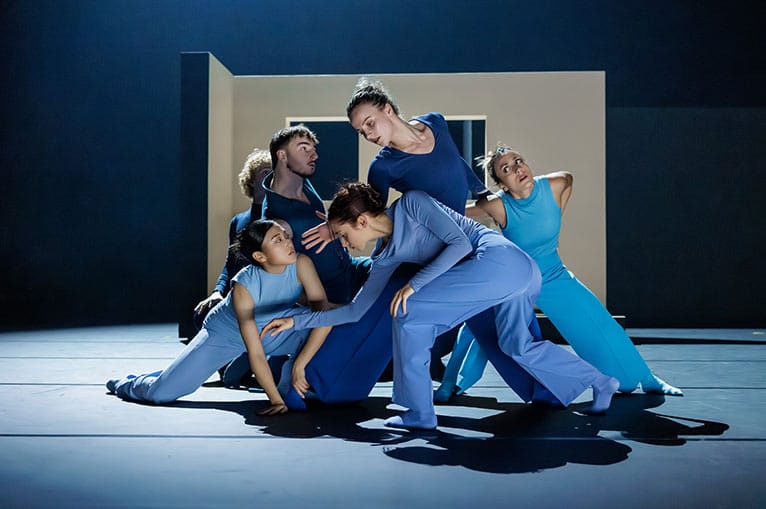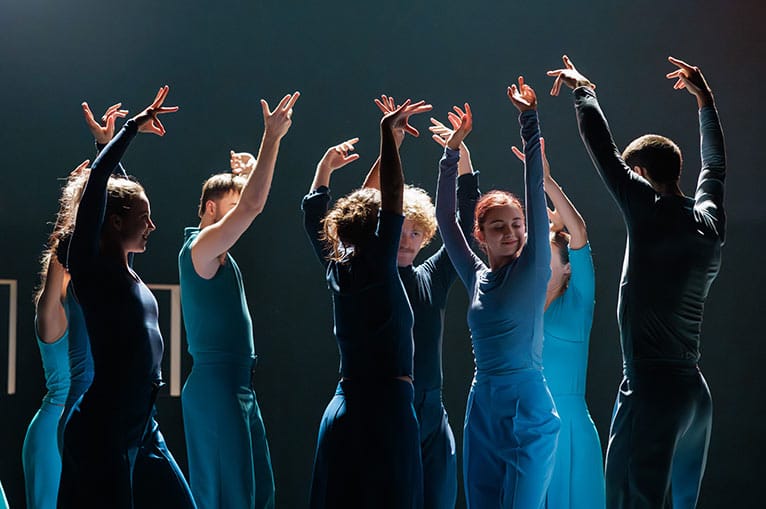 Als sich die Bühnenelemente schräg gegen einander verschieben und so eine intimere Gasse bilden, wird auch die Szene stiller und intimer. Paare werden identifizierbar, ein Tänzer nimmt eine Tänzerin in die Arme und hebt sie zärtlich hoch, wobei ihn eine weitere Tänzerin ablöst. Tänzerinnen halten sich an den Händen und ekstatisch werden Arme zum Himmel gestreckt; hier wird schon etwas Gemeinsamkeit gefeiert.