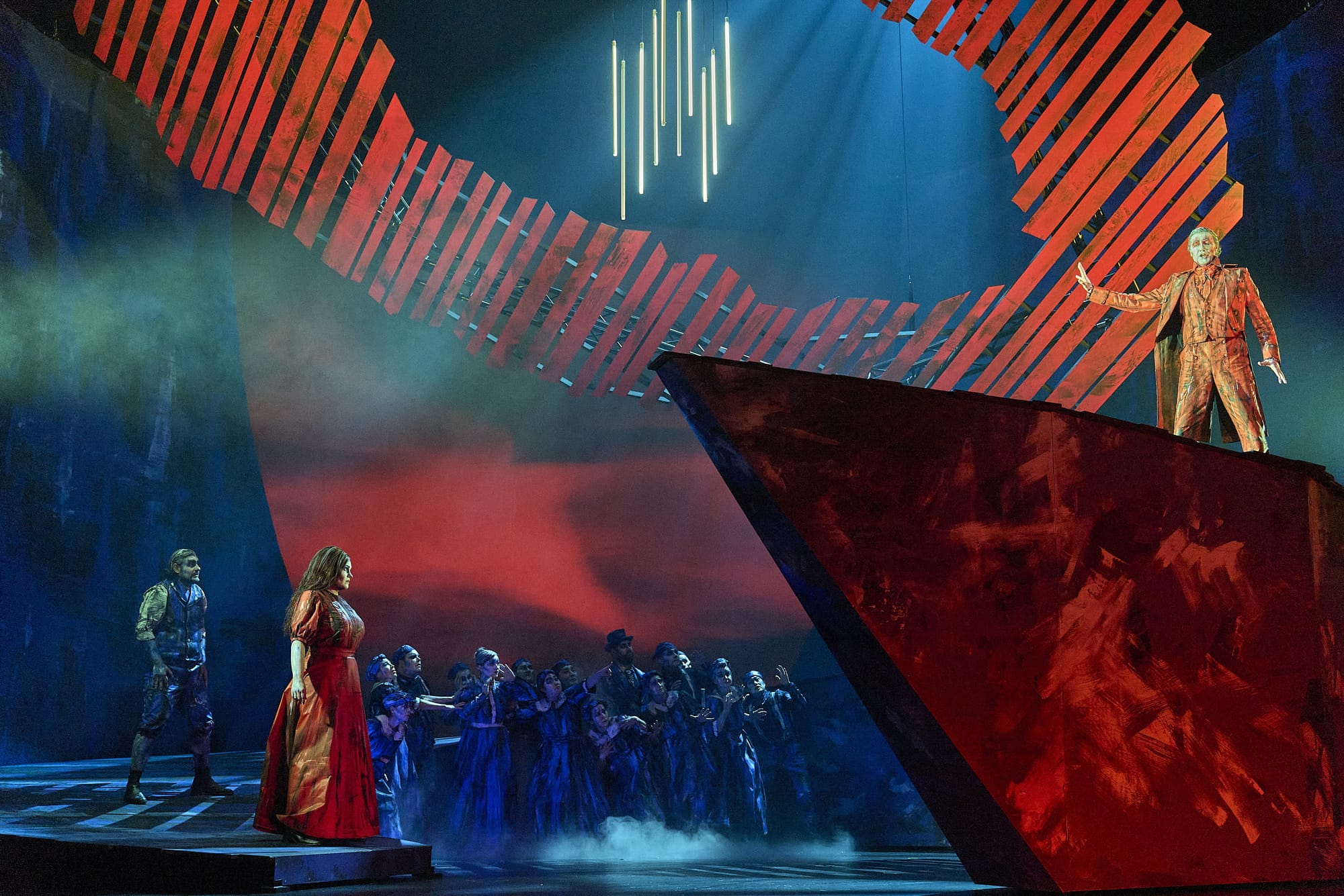 Vieles noch unterstreicht den gebrochenen Realitätscharakter der Handlung. Daland, die Matrosen und ihre Frauen tragen das gleiche verwaschene Blau, die Leute des Holländers und zunehmend auch Senta knalliges Rot. Alle sind extrem geschminkt und bewegen sich, von Gal Fefferman choreographiert, mit der expressionistischen Gestik eines Stummfilms. Das Geisterschiff des Holländers schwebt als blutrotes Brettergerüst über der Szene, Frauen stürmen die Bühne, rote Fahnen schwingend, und geben dem Erlösungswillen Sentas ein weniger phantastisches Ziel als den Holländer.