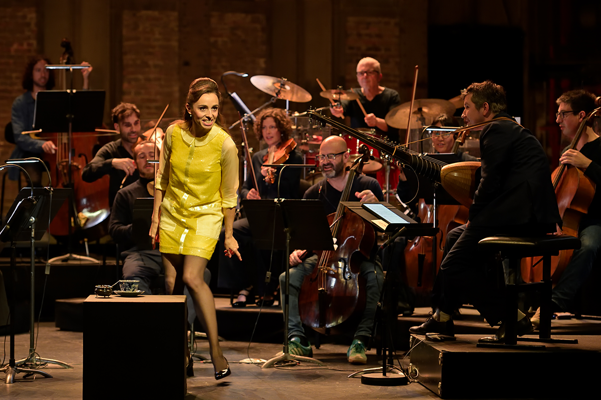 Um die Szenerie zu beschreiben, da wir uns in der Opéra-Comique befinden, spielt sich alles auf einer leeren Bühne ab, auf der die zwanzig Musiker des Ensemble Jupiter sitzen: Links und in der Mitte Streicher, Flöte und Oboe, rechts Klavier, Schlagzeug, Saxophon und Trompete – daher das anhaltende Gefühl eines Ungleichgewichts zwischen den Klangmassen -, zwei Hocker, eine Garderobe für zwei oder drei sichtbare Kostümwechsel und ein Lautenständer am Fuß des Dirigentenpults. Es gibt keine Videoinstallation, die die ausgewählten Songs in ihren filmischen Kontext hätte einordnen können. Somit liegt die Aufgabe, den Figuren, die Andrews in Filmen und auf den Bühnen des Broadway oder des West End verkörperte und sang, Leben und Stimme zu verleihen, allein bei Desandre.
