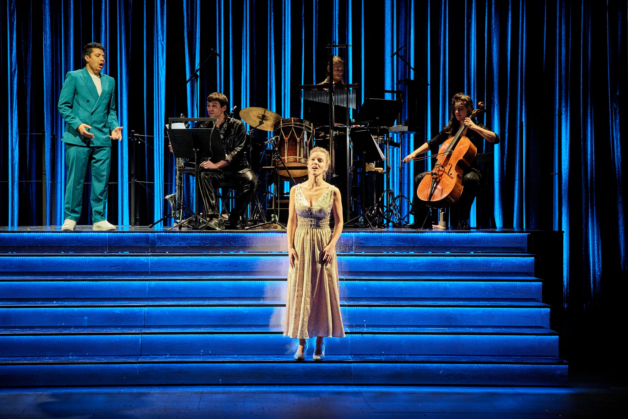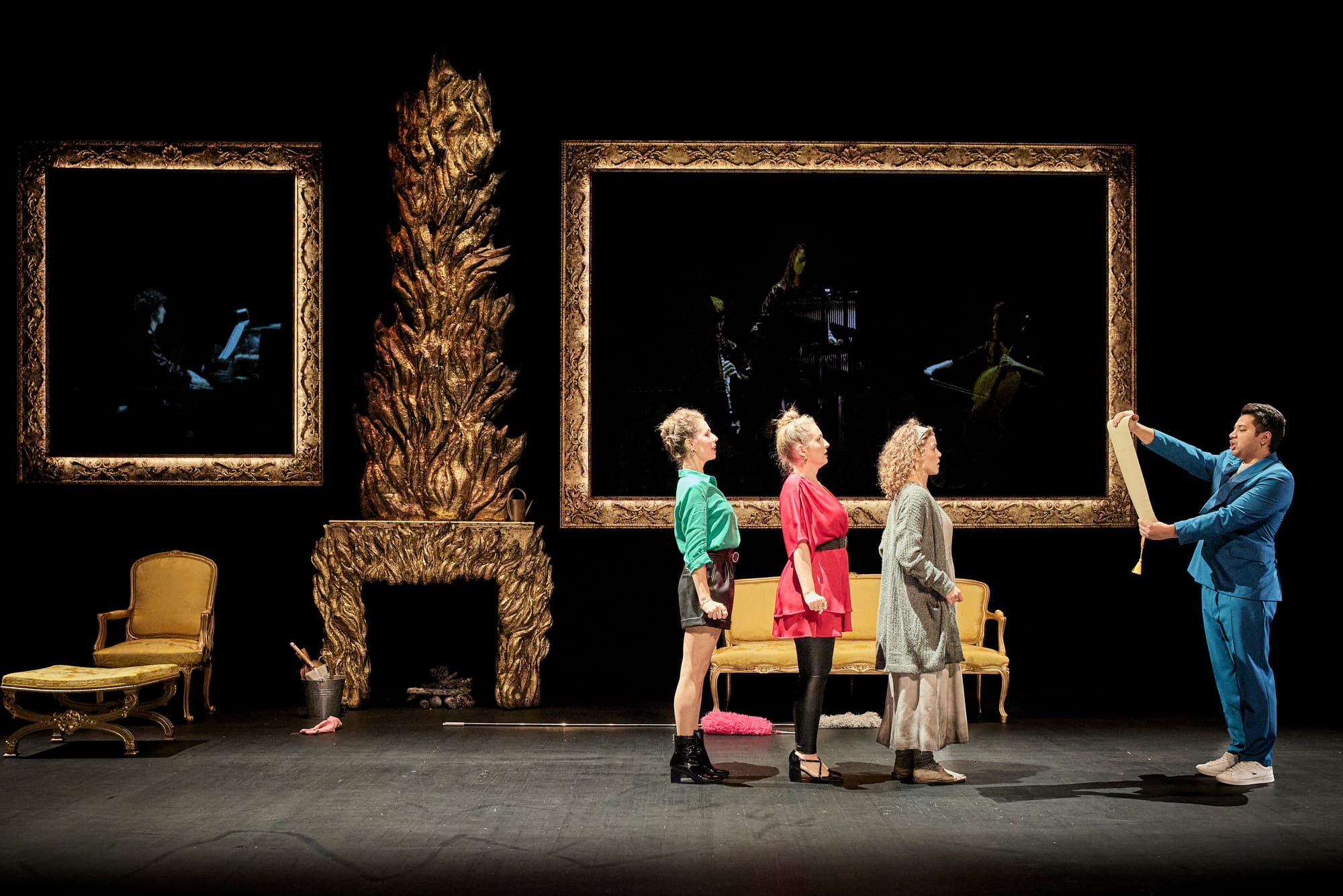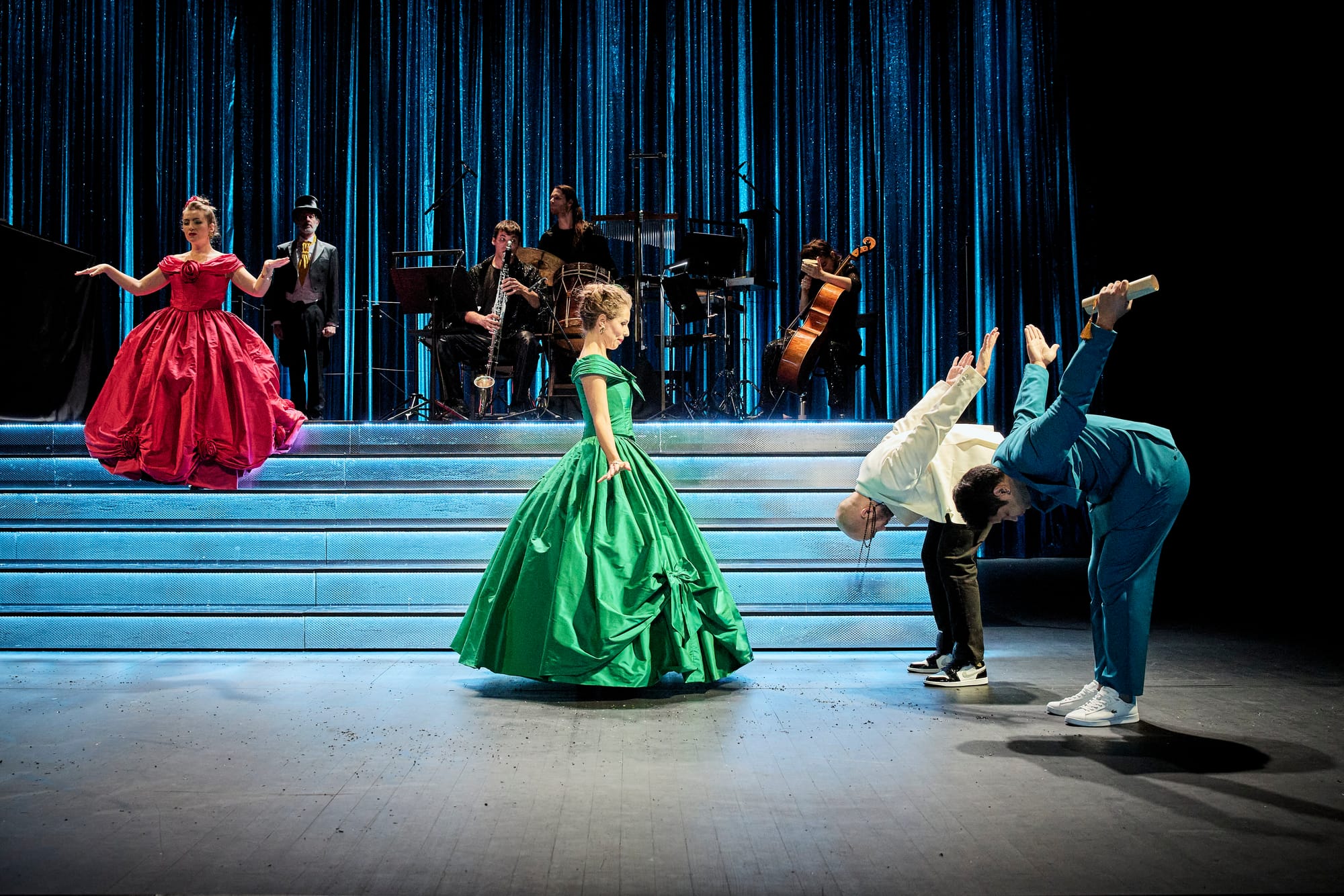 Das etwas erweiterte Orchester – Cello, Klarinette, Schlagzeug und Klavier – befindet sich nicht im Orchestergraben, sondern auf der Bühne. Zuerst ist es durch die majestätischen Gemälde an der Rückwand des Salons Pictordu sichtbar, dann, während des berühmten Balls, ganz obenauf der großen Freitreppe des Fürstenschlosses, in einer wilden Felsformation, wo die Trommeln und die anderen Instrumente die Stelle einer romantischeren Begleitung ersetzen, die für den 1. Und 3. Teil reserviert sind. Chillemi dirigiert am Klavier die Instrumentalisten und auch das Zusammenspiel mit den Sängern, mit denen sie die Bühne teilen: Wie es das Athénée gerne pflegt, wirkte wie ein zauberhaftes Wunder über den ganzen Abend.