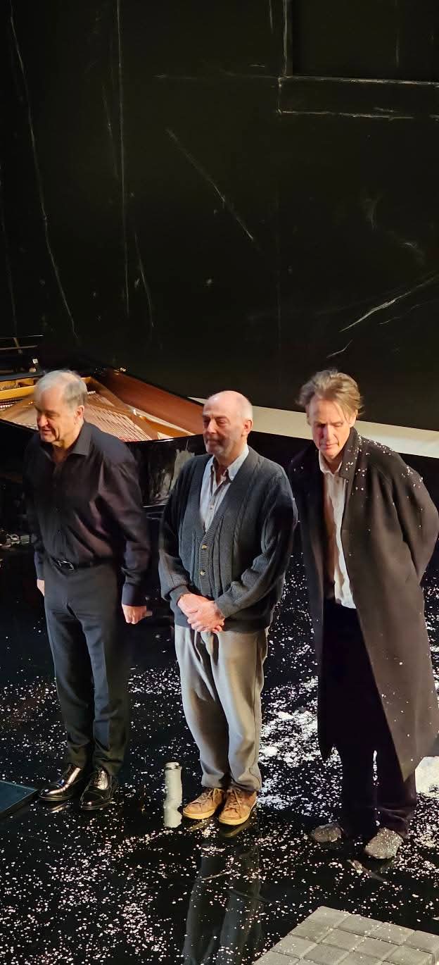 Zwei große, verblasste schwarze Tafeln, deren Vorderseiten mit Kreide umrandet sind, grenzen einen kahlen Raum ab, der von einigen Schneewehen gekrönt wird. Am anderen Ende, zur Gartenseite hin, sticht das ebenfalls schwarze Klavier durch seinen Lack vor einer cremefarbenen Leinwand und im Schatten einer hoch oben sitzenden Krähe hervor. Während die anderen noch ihre Plätzte einnehmen, stehen die Künstler bereits auf der Bühne, ihre Blicke müde, auf den Boden gerichtet oder nachdenklich in die Ferne gerichtet.