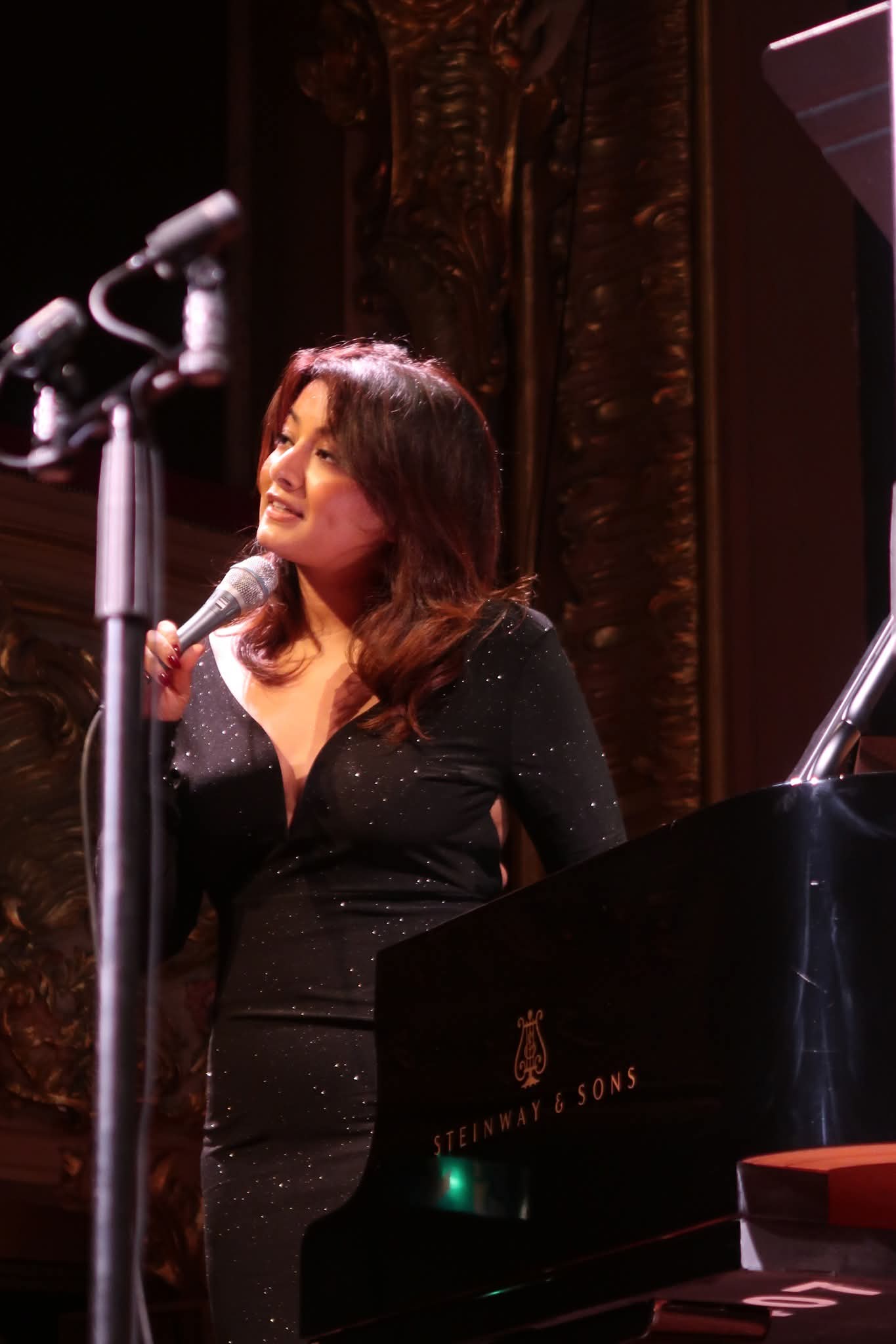 Der Abend ging weiter mit einem weltweitem Hit von ABBA, gefolgt von einer Komposition Weills, die eine wunderbare Theatralik entfaltete. Ein Stück von Willson schien die Zeit elegant stillstehen zu lassen und ein Werk von Styne beendete den Abend mit einem letzten, klangvollen Lächeln. Und als Zugabe gab es gewissermaßen ein wunderbares wohlschmeckendes „Sahnehäubchen“. Guten Appetit!: Einem bekannten Song, oft als Duett von den schon mythischen Stars Barbra Streisand (*1942) und Judy Garland (1922-1969) gesungen: Wurde hier teilweise vom Pianisten und seiner Partnerin gesungen. Ein warmes und intimes Finale.