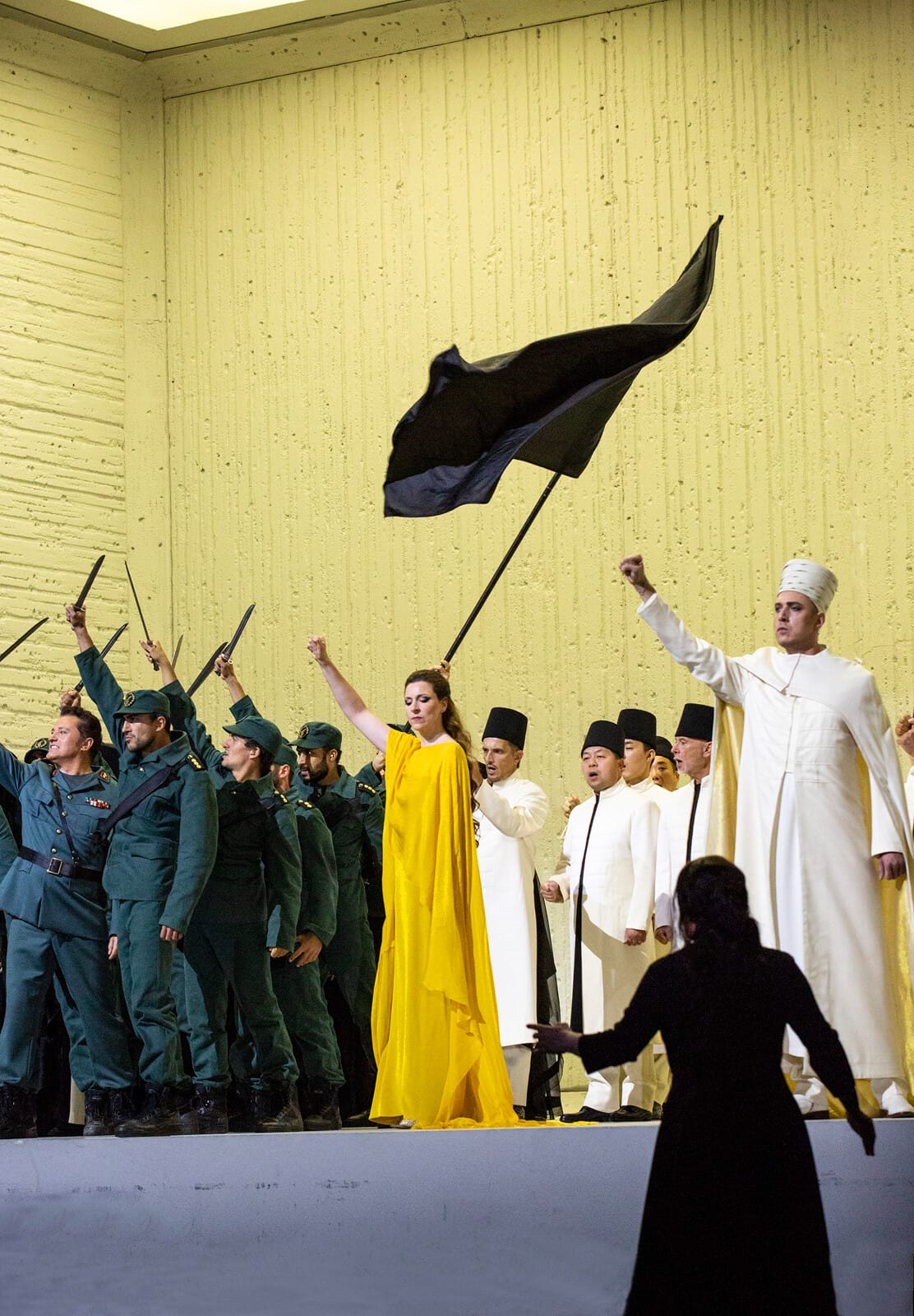 Auch wenn der frische Wind fehlt, der eine Inszenierung zu einem wahrhaft mitreißenden Erlebnis macht, wird Verdis Werk dennoch respektiert und manche Passagen strahlen wahre dramatische Intensität aus, seien es die Leichen, die Amonasro seiner Tochter zeigt, um sie zum Verrat an Radames zu drängen oder auch die monumentale Projektion der Priester während der Gerichtsszene. In diesem szenografischen Rahmen konnten sich die Sänger und die musikalische Leitung orientieren!