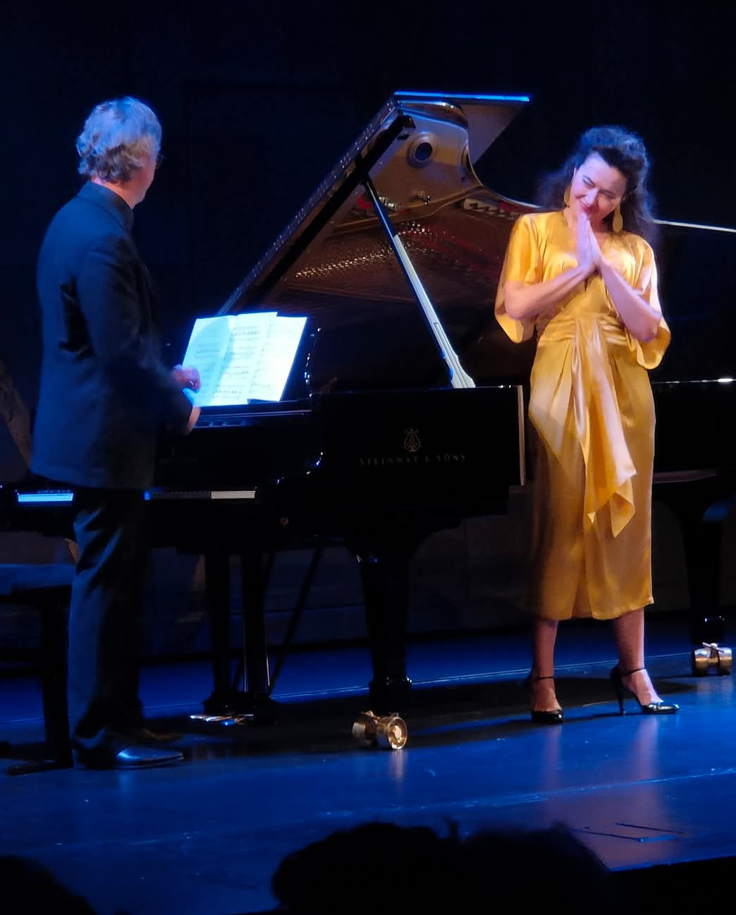 Nichts ungewöhnliches, das unsere elegante Diva einschließlich ihrem Pianisten das Ende dieses so ereignisreichen Abends mit einem Zyklus von Poulenc, ihrem zweiten Urgroßvater beendet! Dieser Ausnahme-Komponist in der Musik-Geschichte: Urkomisch, frech, einfallsreich und natürlich schleppt er immer einen duftenden Hauch von „Halbseide“ hinter sich her. Ja – neben seiner großen und tiefen Religiosität, haftet das gewisse „Halbseidene“ an ihm und man spürt und fühlt es immer wieder mit viel Begeisterung in seinen Werken wieder.