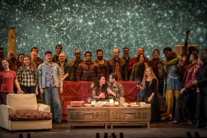 Gigantische Bilder paradieren vor dem Bühnenhintergrund: Mit Wolken, Sternen, Luftaufnahmen beleuchteten Städten, ein Vulkan, wenn die Unterwelt donnert, der Planet Jupiter, wenn der gleichnamige Gott kommt. Alles leuchtet mal rot, mal grün, mal beides gleichzeitig. Auf der Regieseite des Schauspielers singt der Chor, während er seinen Text nachahmt: Ein großer Kreis mit den Armen, wenn er „Universum“ singt. Und dann sind da noch die vielen Ticks: Alle tragen wahllos Allzweckkleidung, der Raum ist zum Zeitpunkt des Finales erleuchtet. Pollux checkt sein Handy, Castor und Télaïre schlagen Purzelbäume auf dem Bett oder machen Kissenschlachten. Schlimmer noch, es gibt die offensichtlichen Ungereimtheiten – wer weiß, ob das etwas bedeutet -: Eine Duschkabine in der Mitte des Wohnzimmers, Charaktere, die die Unterwelt ansprechen, während sie in den Himmel schauen. Pollux, der sagt: „Je le vois“, indem er seine Hand über die Augen des toten Castor legt, gespielt von einem Tänzer, der nicht die geringste Ähnlichkeit mit dem lebenden Castor hat, einem bettlägerigen Jupiter, der sich nur schwer bewegen kann. Das ganze ist nicht nervig, aber das liegt daran, dass es nicht viel ist! Wenn wir die finanziellen Schwierigkeiten der Kultur in Frankreich kennen, können wir uns bei der Vorstellung schämen, dass so viel öffentliches Geld für unsinnige Produktionen vergeudet werden.