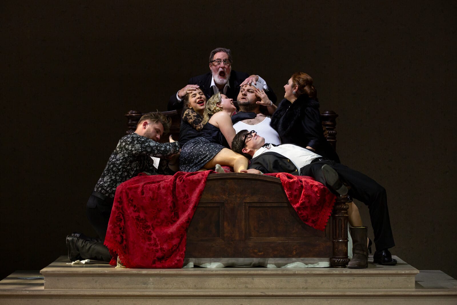 Der Vorhang hebt sich also und gibt den Blick frei auf das Schlafzimmer des verstorbenen Buoso Donati mit einer nüchternen eleganten Kulisse des schweizerischen Bühnenbildner Etienne Pluss, der mit seiner Nachtmütze auf dem Sterbebett liegt. Während tutta la famiglia, die sich klugerweise für die vereinbarte Totenwache in einer Reihe aufgestellt hatte und dabei Spaghetti aß und natürlich dabei literweise Krokodilstränen verweinte. Der unwiderstehliche komische Effekt kommt voll zur Geltung, vor allem da die Elemente der Farce durch die musikalische Leitung des italienischen Dirigenten Carlo Rizzi und die Sänger-Schauspieler unter der Leitung von Loy mit bemerkenswerter Finesse und Präzision sowie auch durch einige nette und gleichzeitig auch bösartige Gags gekonnt unterstrichen werden. Buosos sterbliche Überreste werden vor der Ankunft des Notars kurzerhand hinter das Bett geworfen! Schicchi kehrt mit den Kerzenleuchtern und anderen Gegenständen, die ihm die Familie zu stehlen suchte, in seines neues Haus zurück… Die vielen Charaktere, aus denen die Familie besteht: Schwager, Onkel, Cousine, usw., sind fein gezeichnet und werden von einer Gruppe hervorragender comprimari interpretiert, aus denen vielleicht ein besonders schönes weibliches Trio hervorgeht: Nella von der italienischen Sopranistin Lavinia Bini, La Ciesca von der deutsch-italienischen Mezzo-Sopranistin Theresa Kronthaler und Zita von der albanischen Mezzo-Sopranistin Enkelejda Shkoza hervorragend interpretiert. Wie schon gesagt: Grigorian singt Lauretta in einem sehr eindrucksvollen „O mio babbino caro“ und bildet mit ihrem Geliebten Rinuccio – der ausgezeichnete russische Tenor Alexey Neklyudov – ein absolut glaubwürdiges Paar. Doch der Sänger, der hier wirklich die Bühne dominiert, ist tatsächlich Gianni Schicchi, gesungen von dem armenischen Bariton Misha Kiria – der wie Neklyudov sein Debut an der Opéra National de Paris gibt -, der sich in seiner Rolle als gerissener Bauer vollkommen wohl fühlt und über eine unverschämte, sehr gesunde Stimme verfügt. Sein beeindruckendes „Vittoria, vittoria“, gefolgt von einem „Si corre dal notaio“, das zugleich schelmisch und fast verstörend ist.