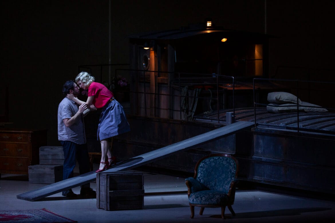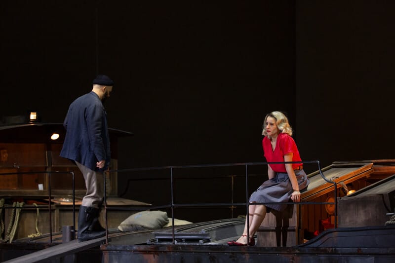 Ein Stimmungswechsel mit Il tabarro, dessen Regie Loy bewundernswert erneuert – das zweideutige Spiel zwischen Giorgetta und Luigi bei den Tanzschritten, die amouröse und erotische Spannung der Liebenden, die Heuchelei der beiden Eheleute, usw. – und die große Sorgfalt, mit der auch die kleinsten Details – wie dem unbrauchbar gewordenen Kinderwagen des nie geborenen Kindes von Michele und Giorgetta, der in einer Ecke der Bühne verstaubt liegt – nachgegangen wird. Erwähnenswert ist noch einmal die meisterhafte Kunst des Dirigenten, der mit millimetergenauer Präzision und ohne unnötige Übertreibungen die Momente aufkommender Spannung und dann die Ausbrüche von Leidenschaft oder Gewalt unterstreicht. Zu den großen (!) Nebenrollen gehört wohl der irländische Tenor Dean Power als eleganter Un Venditore di canzonette. Grigorian erweist sich auch hier als Giorgetta wieder als perfekte Schauspielerin und entfacht in ihrer Beschwörung von Belleville „È ben altro il mio sogno“ einen leidenschaftlichen Gesang. Der kanadische Tenor Joshua Guerreros als Luigi ist vollkommen überzeugend, auch wenn ihm in den dramatischeren Ausbrüchen einer kurzen, aber stimmlich spannenden Rolle ein wenig Kraft fehlt. Schließlich packt der russische Bariton Roman Burdenko den Zuschauer buchstäblich mit der Kraft seiner Darbietung: Abwechselnd von Trauer erdrückt, flehend, berührend, verrückt vor Liebe, gewalttätig und hasserfüllt gelingt es dem Sänger, die Komplexität von Micheles Charakter vollständig zu vermitteln: Eine erstklassige Bühnen- und Gesangsleistung!
