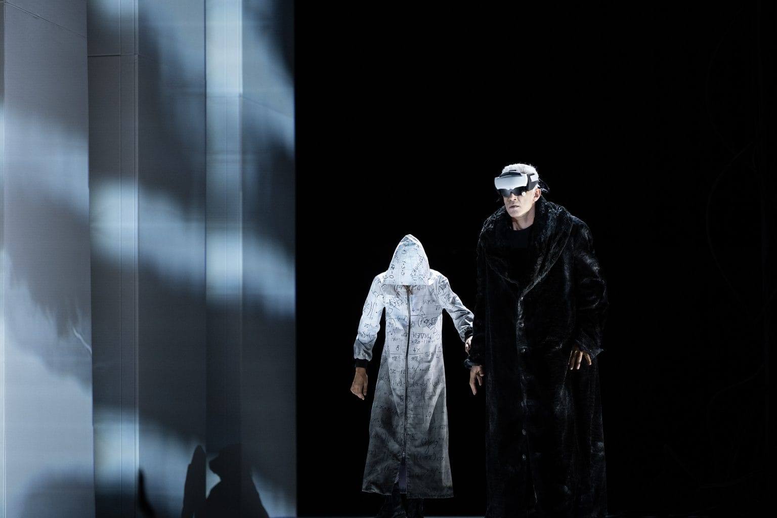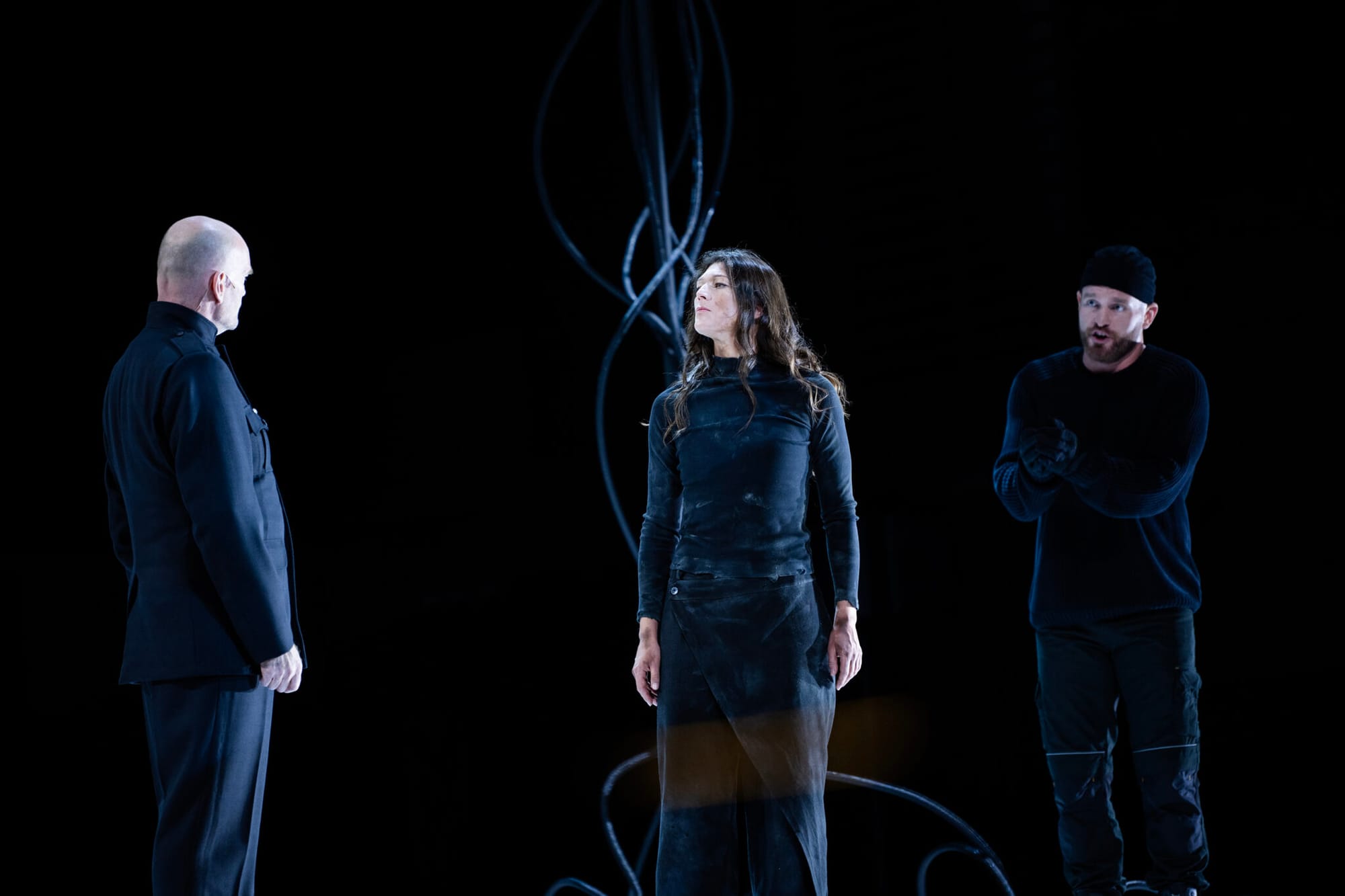 Die Inszenierung der britischen Regisseurin Netia Jones wirkt abstrakt. Sechs gigantische weiße, quadratische Säulen nehmen die Hälfte der Bühne ein, auf die Lichtstrahlen oder schwarze Punkte projiziert werden. Ein eckiger Vorsprung der Bühne beherbergt einen Halbkreis aus Mikrofonen, die wie für eine Pressekonferenz aufgestellt sind, während eine Stange zwei Bildschirme trägt. Zusammen mit den dunklen Kostümen entworfen von der britischen Kostümbildnerin Sukie Kirk ist die Inszenierung komplett in Schwarzweiß gehalten, was durch die geisterhaften Bilder auf den Bildschirmen noch verstärkt wird. Diese sind mit äußerst viel Talent von dem französischen Videokünstler Marc Lavallée entwickelt worden. Auf ihnen sehen wir die Protagonisten, die sich vor den Mikrofonen zum Sprechen versammelt haben, zeitversetzt und in Zeitlupe.