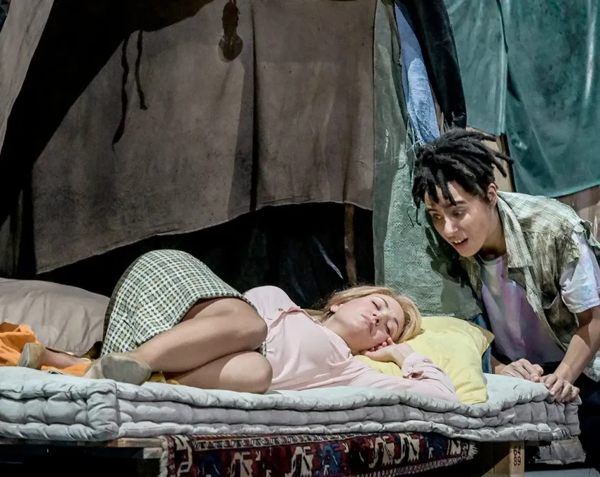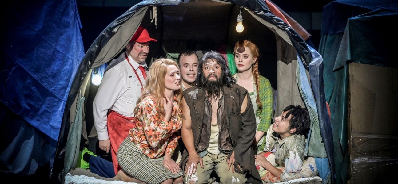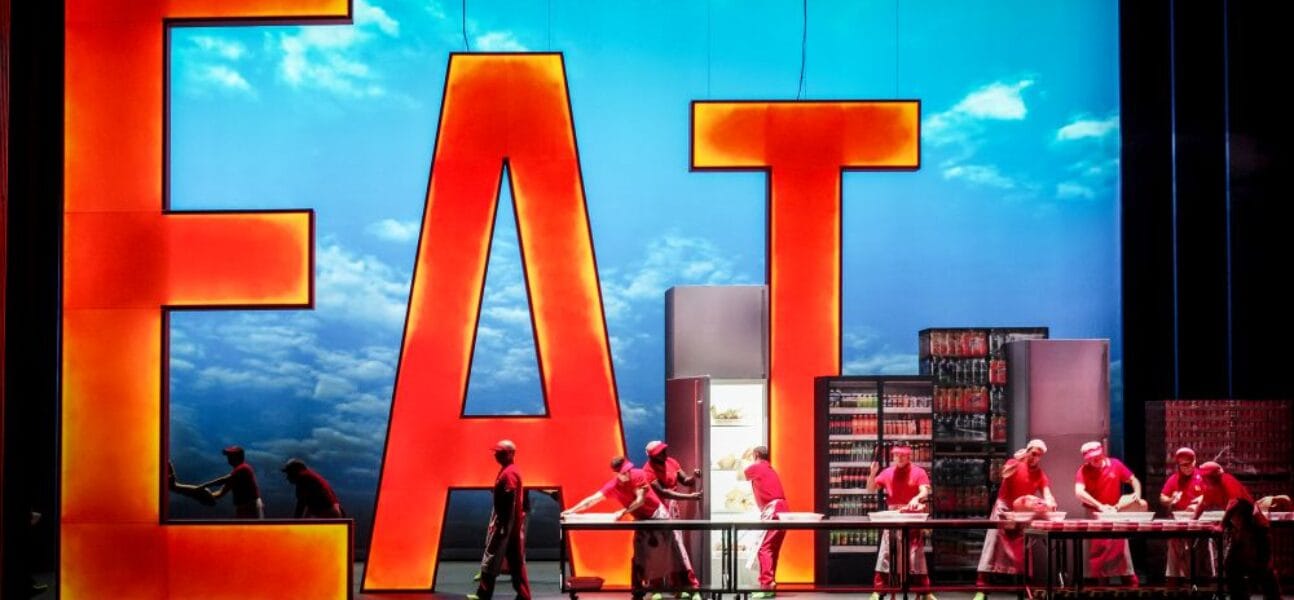 Mit seinem charakteristischen Humor und Einfallsreichtum hat Pelly zusammen mit seiner langjährigen Mitarbeiterin, der französischen Bühnenbildnerin Chantal Thomas die wilde Insel gegen Manhattan eingetauscht, das von einigen Wolkenkratzersilhouetten dominiert wird. Die Hütten der Ureinwohner gegen die Zelte der frisch gestrandeten Obdachlosen der modernen, kapitalistischen Gesellschaft: Das Quechua-Zelt dient sogar als Metonym für die gesamte Insel. Die Szene, in der Robinsons Freunde Toby und Suzanne Gefahr laufen, Zutaten für den berühmten Eintopf zu werden, den ein überdrehter Jim Cocks zubereitet – der Beginn einer Reihe urkomischer Gags -, verwandelt sich in eine grandiose Fleischfabrik, die der Moderne würdig ist, symbolisiert durch ein gigantisches, neonbeleuchtetes „EAT“,