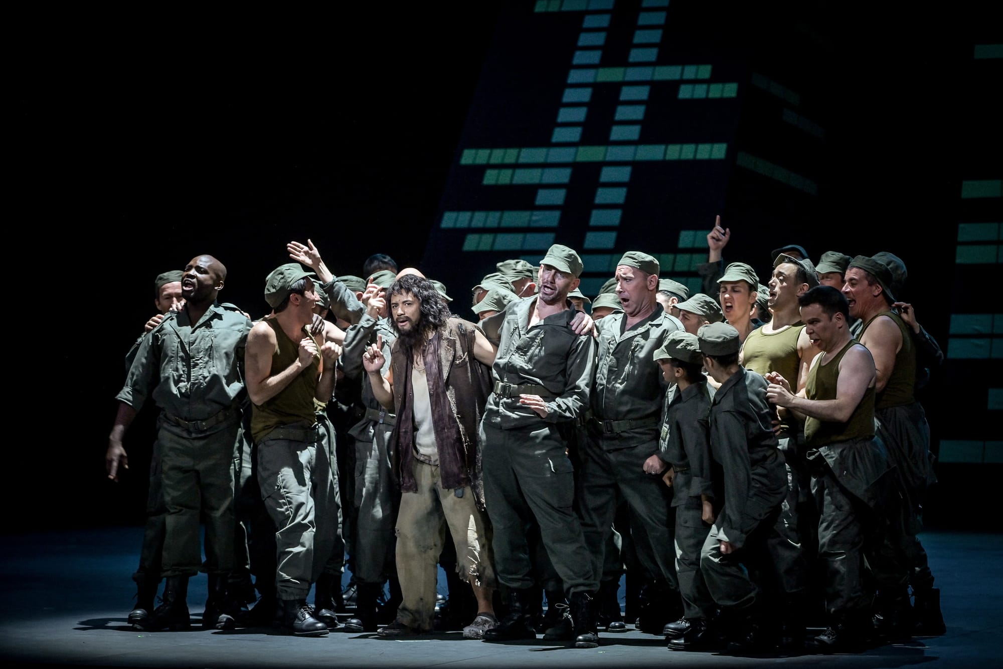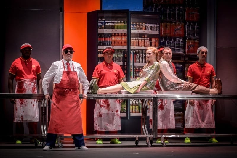 Seit Jahrzehnten gelingt es dem Gründer von Les Musiciens du Louvre mit der schöpferischen Fantasie Pellys zusammenzuarbeiten. Nach Orphée aux Enfers, Les Contes d’Hoffmann (1881), La belle Hélène, La Périchole (1868), nicht zu vergessen der unvergessliche Platée (1745) von Jean-Philippe Rameau (1633-1764) und vielen anderen Werken ist die Wiederaufführung von Robinson Crusoé, einer komischen Oper, die damals nach dem Misserfolg eines anderen Meisterwerks, Barkouf, sieben Jahre zuvor nur mäßigen Erfolg hatte, ein voller Triumph. Dennoch war es schwierig, das Libretto von Cormon und Crémieux wörtlich zu interpretieren, das zwar theatralisch wirkungsvoll, aber voller kolonialistischer Vorurteile war – wie die Streichung der Arie von Suzanne „Oui, c’est un brun“ zu Beginn des dritten Akts beweist, in der Vendredi mit einer Ware verglichen wird -. Wie immer gelingt der französischen Dramaturgin Agathe Mélinand eine intelligente Adaption, ohne das Original zu verfälschen: Die Piraten verschwinden und werden durch US-Soldaten ersetzt, während die Kannibalen in einem modernen Schlachthof arbeiten, alle in Orange gekleidet mit fluoreszierend grünen Füßen und der Stamm, der den Gott Saranha verehrt – ist eine urkomische Erscheinung – als ein gewisser Republikaner mit einer großen blonden Stirnlocke und orangefarbenen Gesicht verkleidet. Selbst die Sprache von „Friday“ ist wesentlich geprägt – verschwunden ist das pseudo-einheimische Kauderwelsch, dessen Tradition mindesten bis zu Jean-Baptiste Poquelin, genannt Molières (1622-1673) Le Bourgois gentilhommes (1670) zurückreicht -. Die Londoner Szene, die – entgegen suggerierenden Regieanweisungen im Libretto – keineswegs an eine William Hogarth (1697-1764)- Radierung erinnert -, präsentiert ein steifes, sehr bürgerliches Interieur der „Seven Teens“, das eine große Langeweile ausstrahlt, die Robinson zur Seefahrt treibt. Ein erster Akt , der enttäuschen könnte und nur schwer in Schwung kommt, wenn er nicht als Prolegomenon für den Aufbruch des Helden dienen würde und wenn er nicht durch entzückende, oft unwiderstehliche Musik, insbesondere seine atemberaubende Ouvertüre und seine reichen Orchesterpassagen, aufgewertet würde.