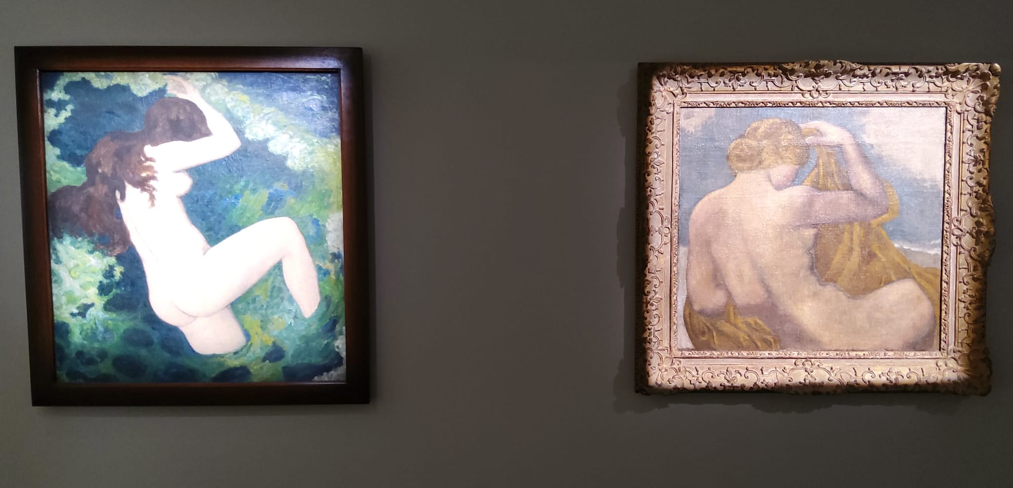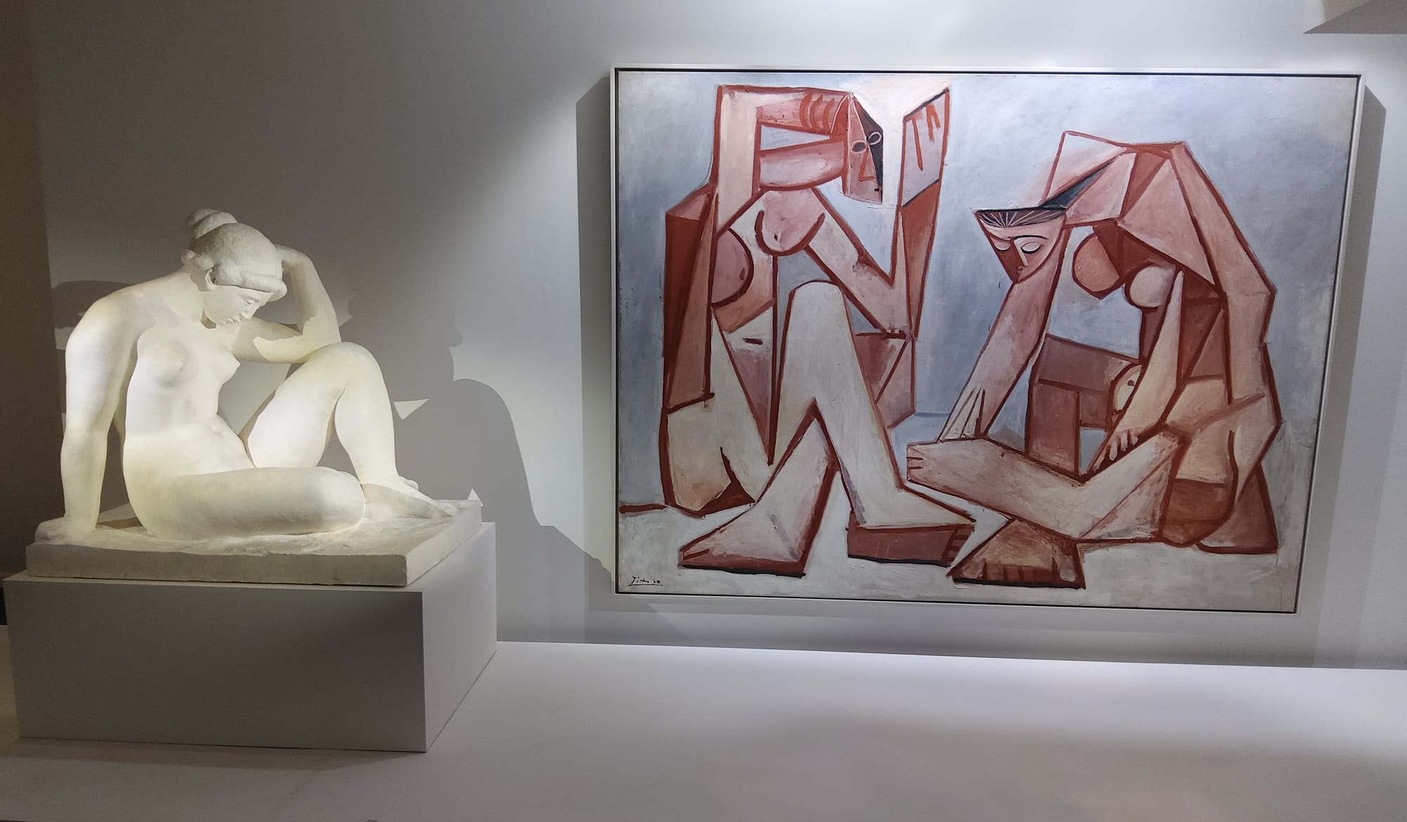Der nächste Raum enthält eine Überraschung. Neben Maillols wohl bekanntester Skulptur „La Méditerranée“ von 1905, eine der „la montagne“ im Aufbau ähnliche, aber versonnene Frauenfigur von ausgewogenem Klassizismus, steht Picassos großformatiges Ölgemälde „Femmes devant la mer“ von 1956. In dessen beiden kubistisch dekonstruierten und flächigen Frauenfiguren könnte man den Aufbau der „Méditerranée“ wiedererkennen; Picasso hatte sie tatsächlich bei seinen Aufenthalten in Perpignan zwischen 1953 und 1955 im gotischen Patio des Rathauses gesehen und, wie andere Skulpturen Maillols auch, für sich fotografieren lassen.