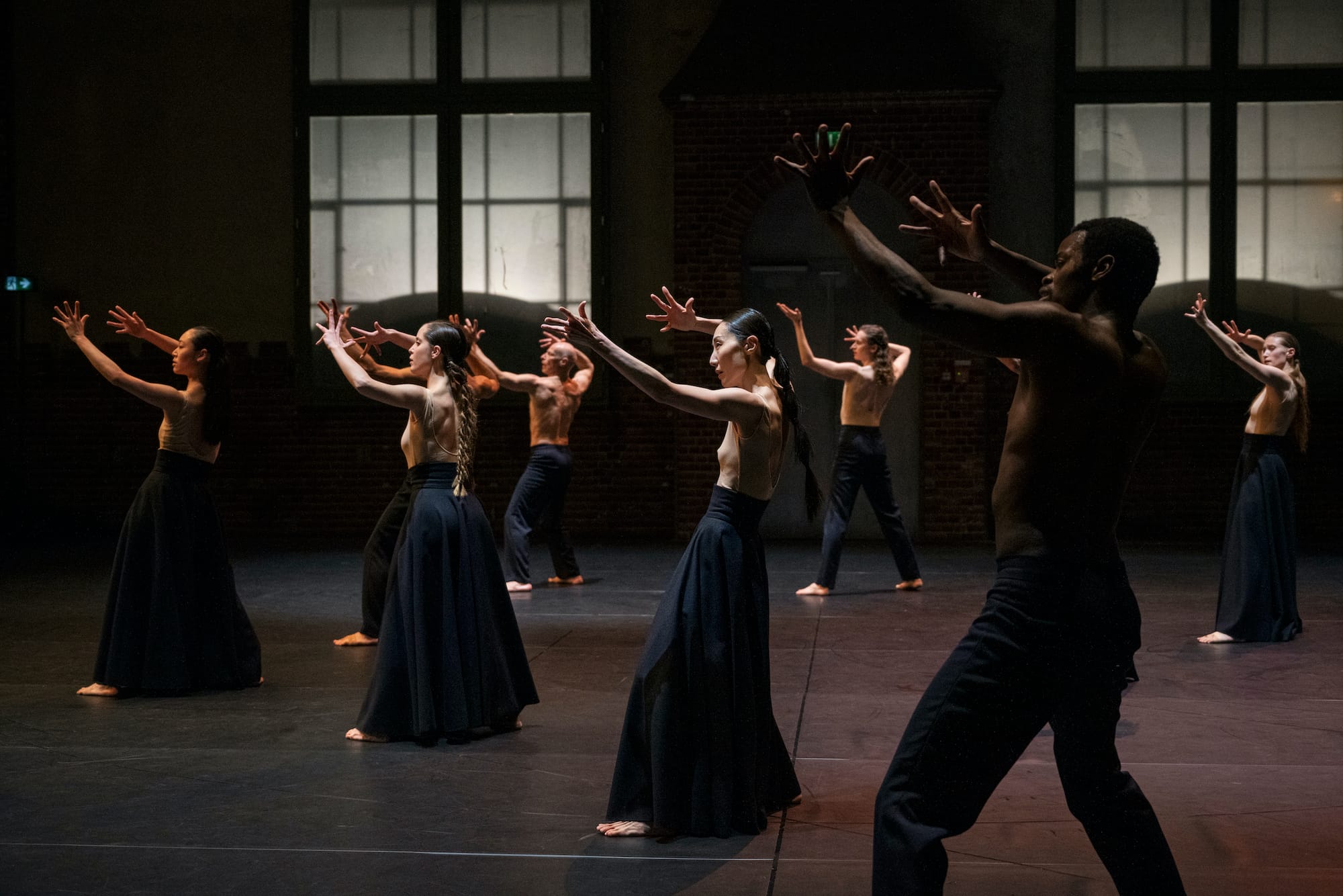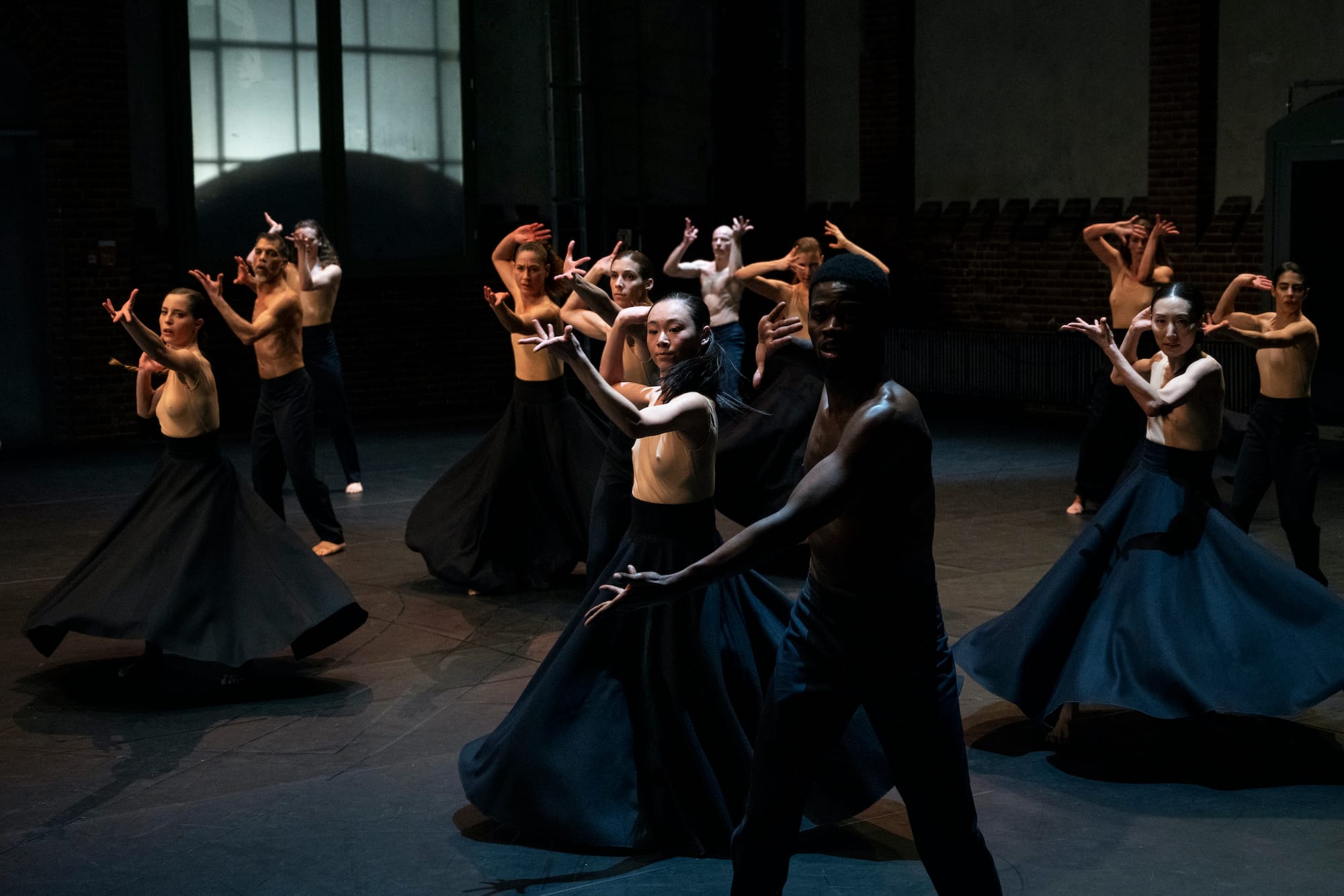 In Beethoven 7 (2023) „orchestriert“ Waltz ein kraftvolles choreografisches Werk, in dem die Musik von Beethoven und Noguera einen intensiven Dialog zwischen choreografischem Erbe und Moderne entstehen lässt. Das Stück beginnt mit einer Dystopie von düsterer Schönheit: Der erste Teil mit dem Titel Freedom / Extasis evoziert dämmrige Nebel, fragmentierte Gesten und Körper in seltsamen Formen verschlungen, vollführen einen langsamen, bedächtigen Tanz. Nogueras himmelhohe, synkopierte Musik erzeugt eine gedämpfte Spannung und spiegelt eine Welt in der Krise wider. Die Tänzer bewegen sich in Trios vorwärts, spannen sich an, brechen zusammen in einer Dynamik, in der die Gruppe das Individuum einengt. Die Grenze zwischen der Körperlichkeit und den ätherischen Schatten verschwimmt in dieser Klanglandschaft. Dann folgt der Bruch! Die Körper werden befreit, getragen von der rhythmischen Vitalität dieser 7. Sinfonie. Barfuß, in leichten Tuniken, gleiten, springen und schwingen die vierzehn Tänzer ihre Arme wie imaginäre Gewichte in einer fließenden und jubelnden Choreografie, einer wirbelnden Gestensprache spiralförmiger Drehungen. Das Poco sostenuto – Vivace wird zu freudiger Turbulenz, das Allegretto für einen Moment schwerelos, oder eine durchsichtige Fahne flattert, ein zerbrechlicher Hoffnungs-Schimmer.