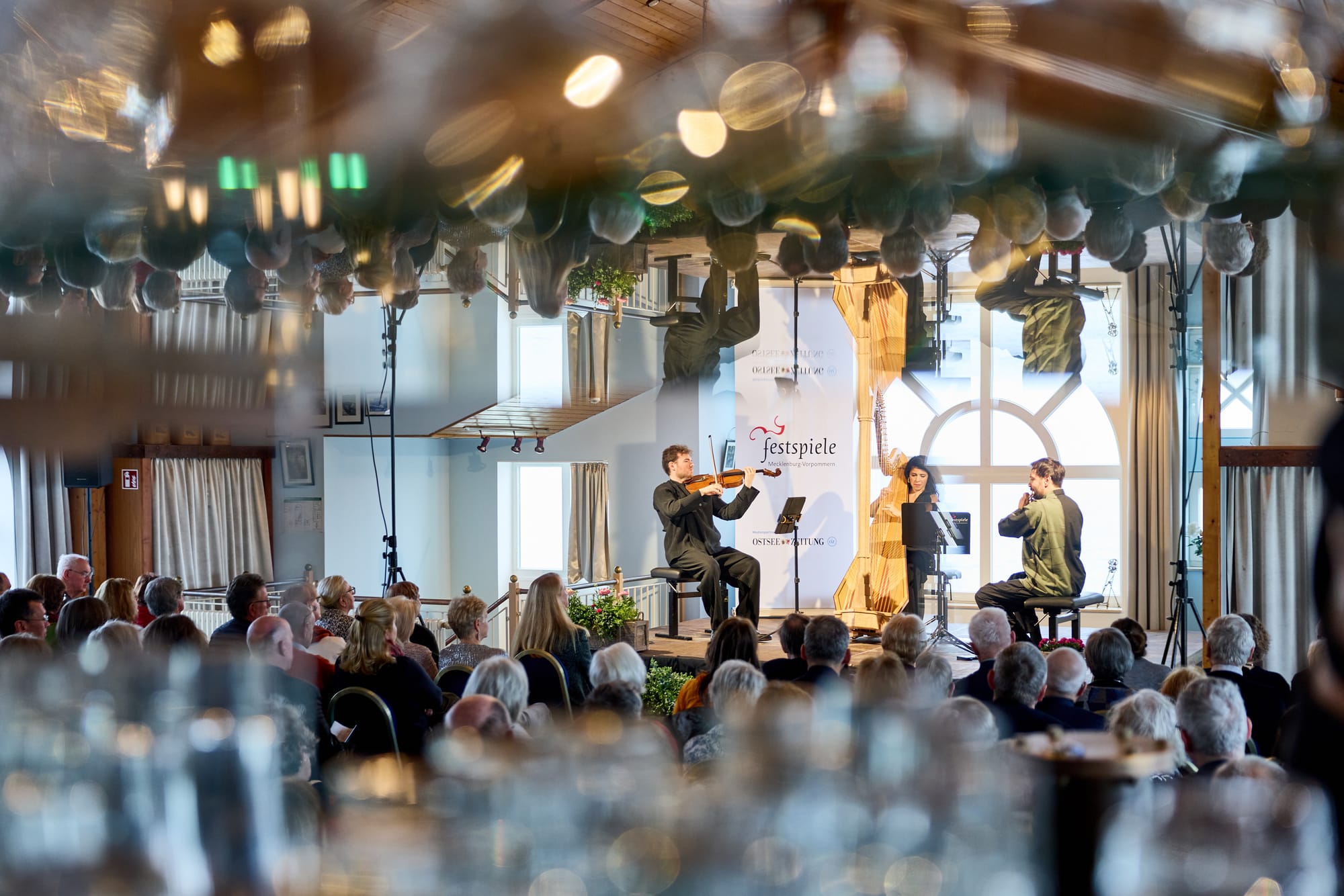 Auf Sellins Seebrücke ging es am anderen Morgen entschieden entspannter zu. Das Ambiente unvergleichlich: Man sitzt über dem Wasser, Blick durch umlaufende Fenstergalerien auf Wasser, Himmel und Möven. Von vorn ätherische Klänge unter dem Stichwort MELANCHOLIA musiziert von Adam Walker (Flöte), Timothy Ridout (Viola) und Annaleen Lenaerts (Harfe). Eine Welt voller Ruhe und schillernder Klangfarben, pastoral, filigran, schwebend, aber auch voller spielerischer Bewegtheit – eine gelegentlich fast unwirkliche Atmosphäre der Entrücktheit, die dennoch vielleicht gerade deshalb einlud, im scheinbar Eindeutigen die Feinheit zu suchen, auch gedanklich aktiv zu bleiben. Dies mit Werken von Debussy (Sonate für Flöte, Viola, Harfe, L 137), Joseph Jongen (Danse lente für Flöte und Harfe op. 56b, Deux pieces en trio für Flöte, Viola und Harfe op. 80), Ravel (Sonatine fis-Moll für Flöte, Viola und Harfe, orig. Klavier) und Louis Vierne (Zwei Stücke für Viola und Harfe op. 5, orig. für Viola und Klavier). Ein musikalisches Erlebnis mit Seltenheitswert!