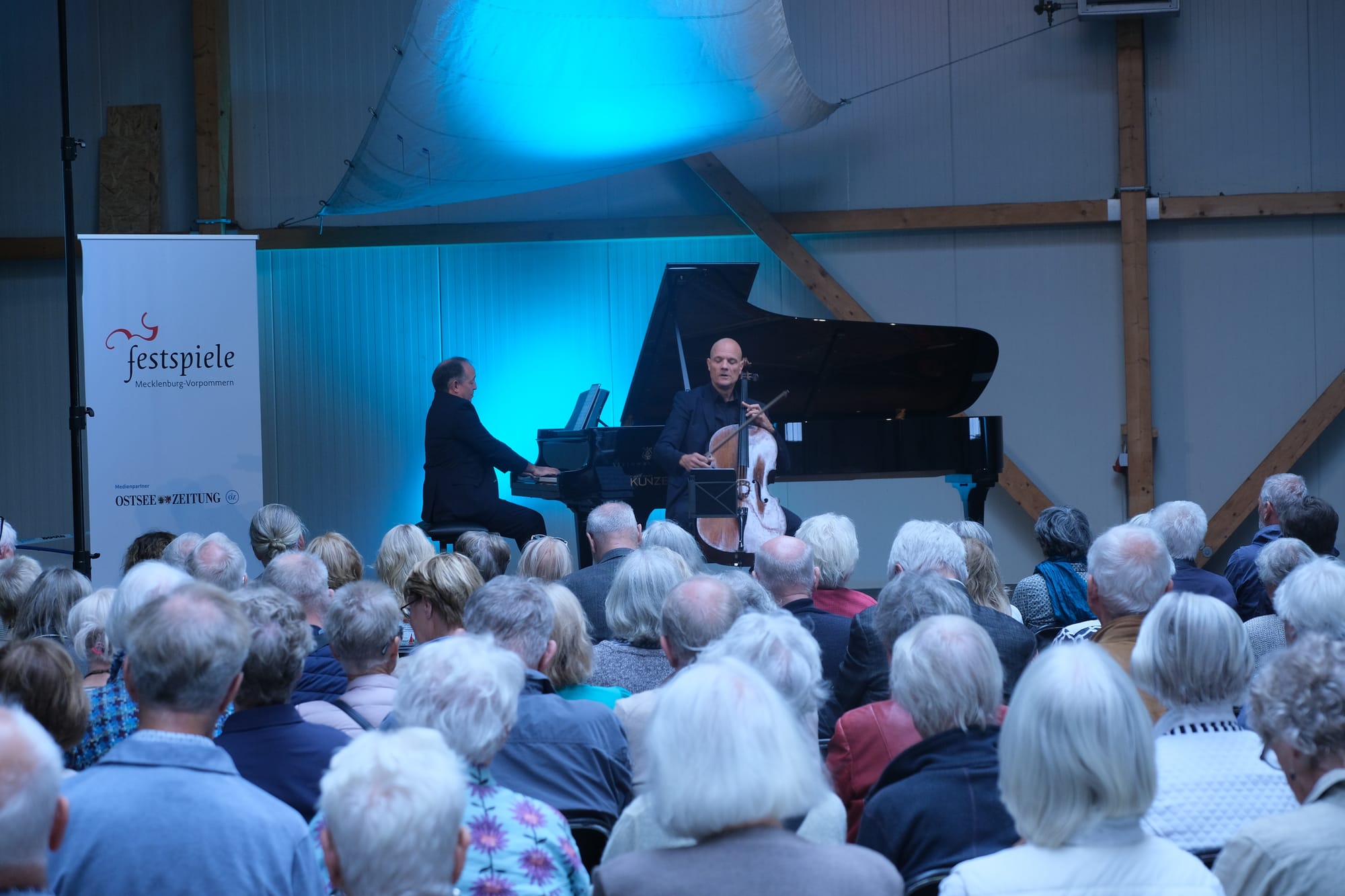 Ein freundlicher, etwas kühler Vormittag und der Riesenraum einer Bootshalle in der Naturoase Gustow (Drigge) – dies der Start mit gleich allen an den drei Tagen vielbeschäftigten Protagonisten. Eine Visitenkarte, die es in sich hatte. Sanft der Einstieg mit Mendelssohn (Lied ohne Worte op. 109), schockierend rasant der Kontrast mit einer Paraphrase über einen sehr bekannten Song von einem gewissen Mackie Messer (Die Dreigroschenoper) und einem weniger bekannten (ursprünglichen) Tango (Youkali) aus dem Theaterstück Marie Galante - beide von Kurt Weill und ausnehmend raffiniert für Violoncello und Klavier arrangiert von Wolf Kerschek und dem Duo Runge & Ammon. Die beiden hatten denn auch keine Mühe, das hiermit vorliegende Reservoir an romantischem, melodisch-musikantisch verführerisch Schönem (Mendelssohn) und einer die musiksprachlich höchst unorthodox, frei, fantasievoll, auch mal rabiat, ungemein kontrastreich und inspiriert bearbeitete „Moderne“ souverän und begeisternd vorzutragen. Ein ungetrübtes Vergnügen, den wahrlich kompetenten Arrangeuren auf ihren verschlungenen Wegen musikalischen Fabulierens zu folgen; von dem der mitreißenden Präsentation ganz zu schweigen.