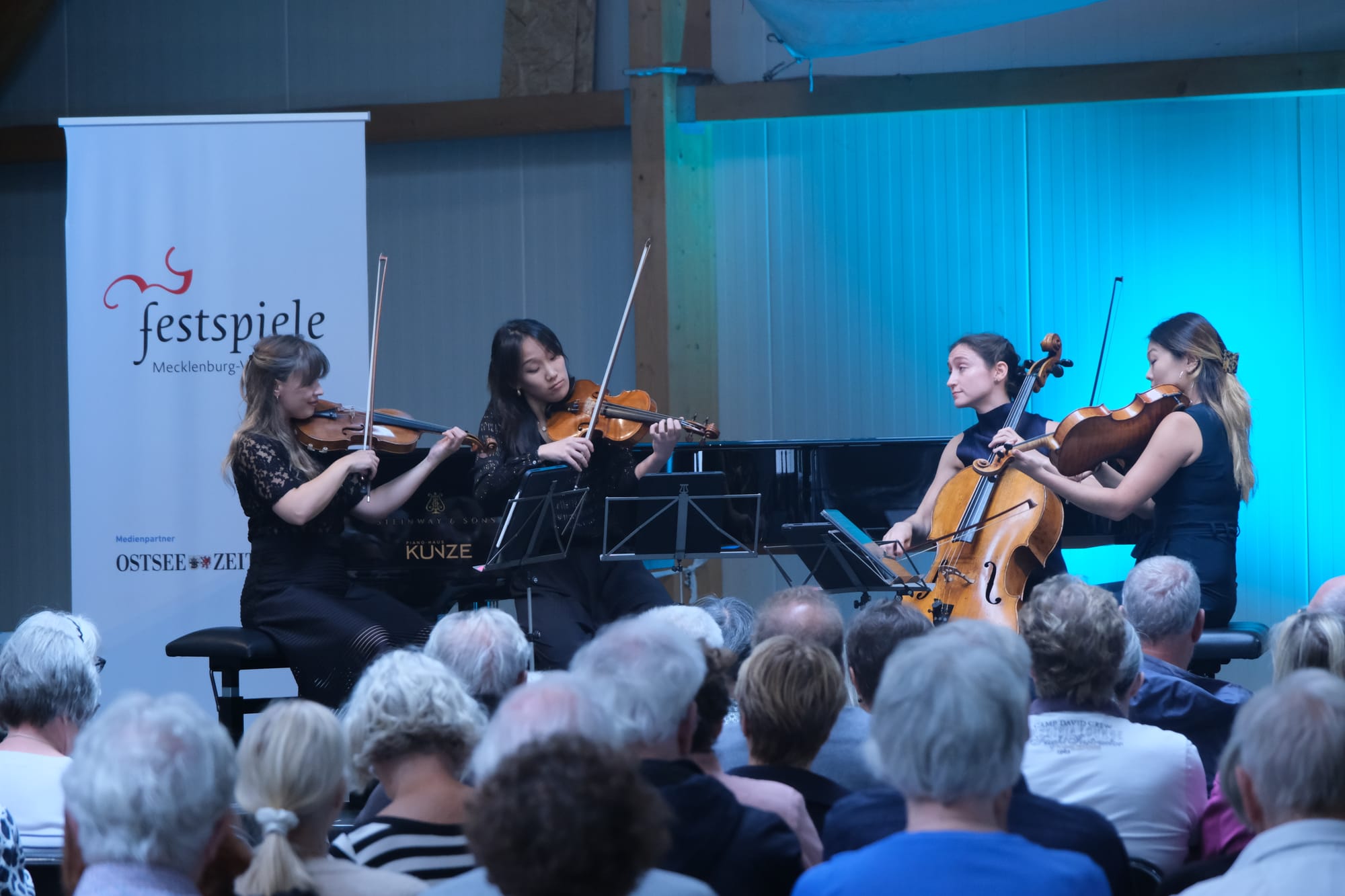 Fulminant aber wieder der Zielpunkt des Tages mit dem Kleio-Quartet in der Kapelle des Gutshauses Boldevitz. Man kann eben nicht nur Haydn. Man glänzt etwa mit Benjamin Britten und seinen Drei Divertimenti für Streichquartett – die mit Haydnscher Lockerheit und Spritzigkeit sowie seiner unerhörten Musizierfreudigkeit, aber in ganz anderem stilistischen Gewand aufhorchen ließen. Kraftvoll, spritzig, brillant, heftig, auch burlesk bis orgiastisch beeindruckten die vier Damen mit bereits bekannter Leidenschaftlichkeit und verhalfen den souverän einfallsreich komponierten, durchaus modern unkonventionellen Genre-Stücken (March, Waltz, Burlesque) zu lebhaft bekundetem Erfolg.