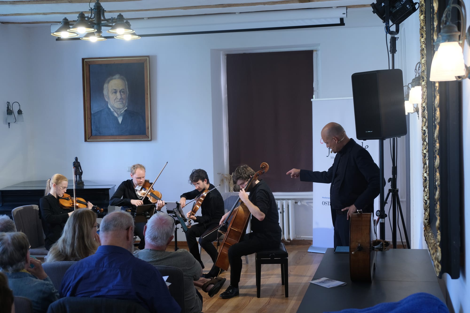 Soweit ein musikalisch fulminanter Tagesbeginn. Danach war eine emotionale Pause durchaus angemessen. Zu finden war sie in Groß Schoritz, im Geburtshaus Ernst Moritz Arndts. Dort gab es ein „Open Masterclass“, eine Demonstration zum Thema: wie erarbeite ich mir ein Streichquartett, hier am Beispiel von Beethovens Quartett cis-Moll op. 131. Das Ganze mit dem Fibonacci-Quartet und Eckart Runge, der glaubwürdig (und englischsprachig) zu vermitteln wusste, wie man aus papiertrockenen Noten lebendige Musik macht. Da waren selbst oft wiederholte Auszüge hörenswert und die nachmittägliche Stunde insgesamt so unterhaltsam wie erholsam.