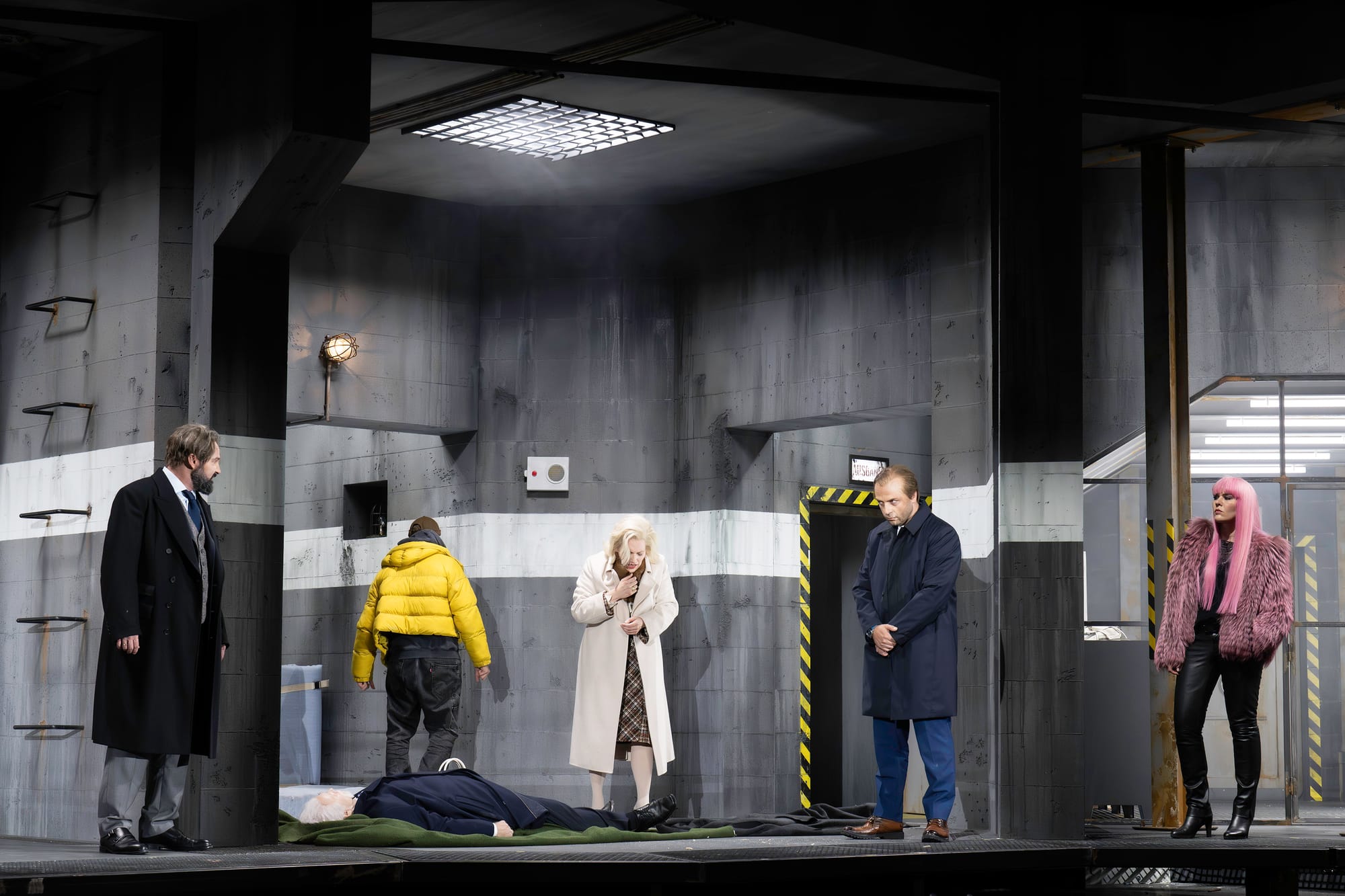 Das eindrucksvollste Element dieser Inszenierung ist zweifellos das realistisch und detailgetreu nachgebaute Bühnenbild eines Luftschutzbunkers. Dmitri Tcherniakov strebt eine möglichst intensive Interaktion zwischen Opernbühne und Publikum an, deshalb reicht die Bühne weit in den Zuschauerraum hinein.