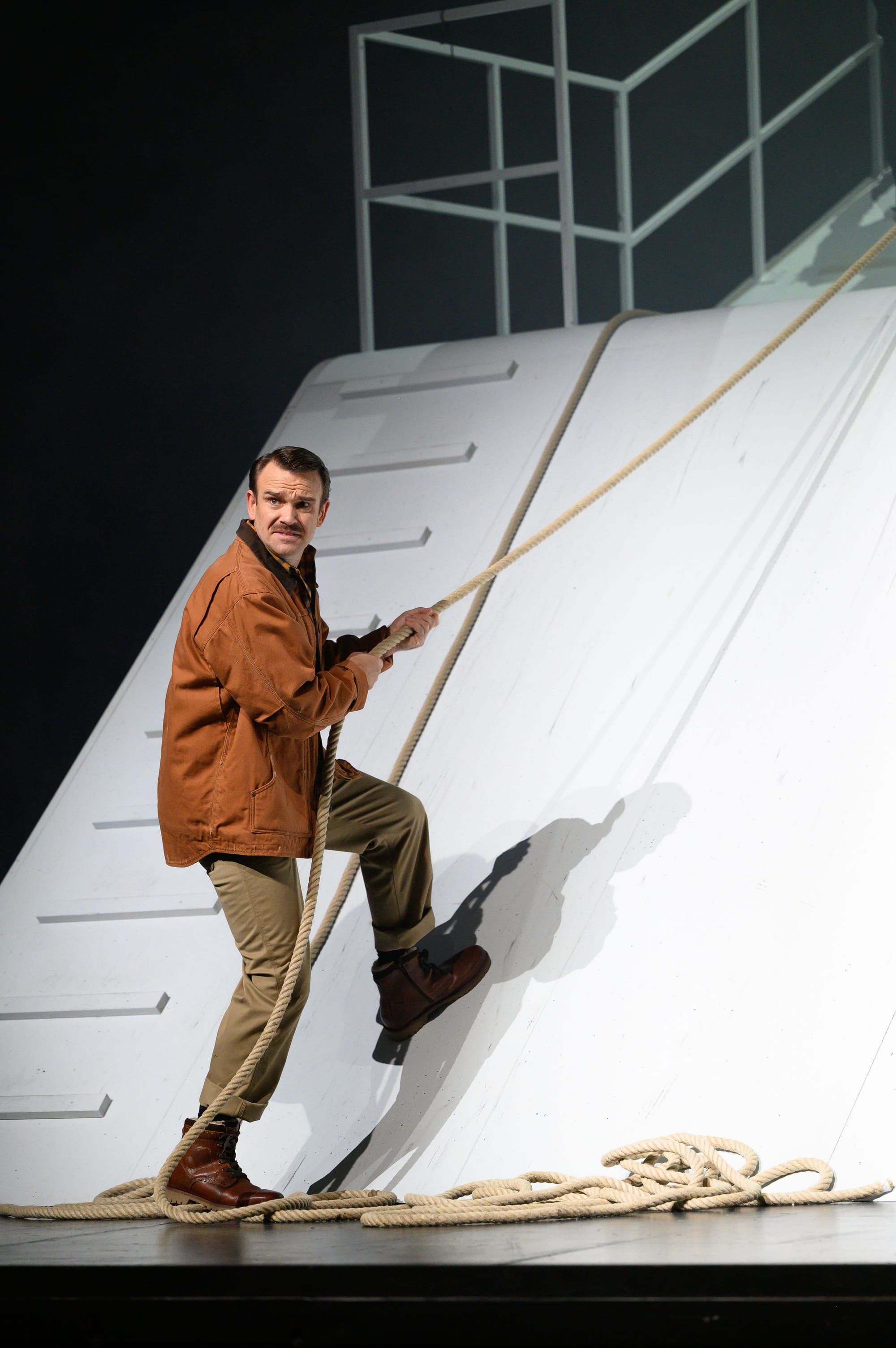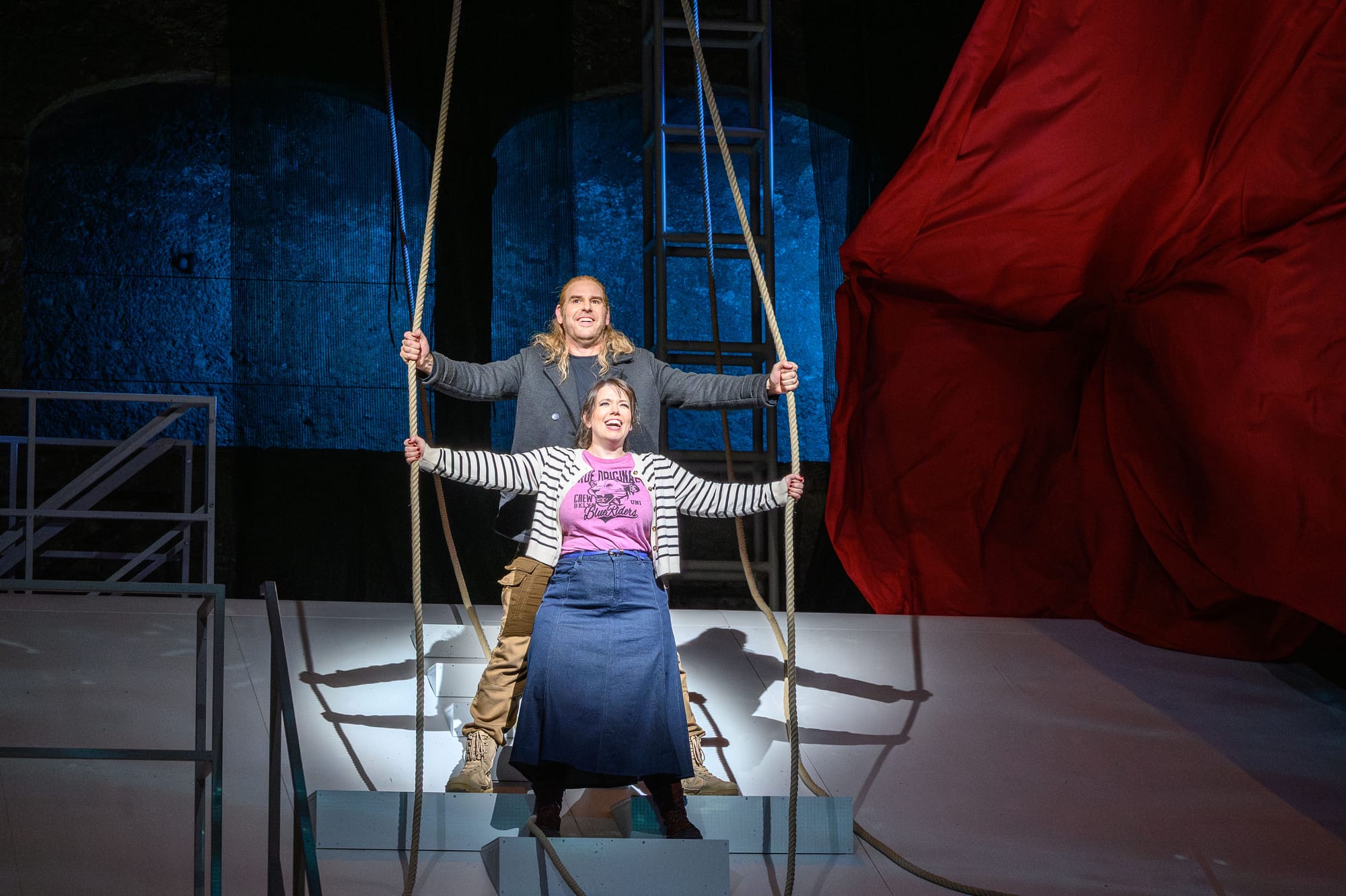 Von Maldeghem nutzt diese Struktur konsequent für die Figurenführung. Die Matrosen Dalands erscheinen als moderne Arbeiter in blauen Overalls; der Holländer dagegen bleibt eine Figur, die trotz moderner Kleidung aus einer anderen Sphäre zu kommen scheint – stets verortet im kalten Rot-Blau jener Bühnenhälfte, die seine Welt markiert. Senta steht zwischen beiden Sphären: In der Fabrik Außenseiterin, im Jugendzimmer entrückt, im Aufeinandertreffen mit dem Holländer seltsam selbstbewusst. Die Taue, die die Bühne durchziehen, werden zu sichtbaren Linien von Halt und Bindung; kaum eine Figur berührt sie, ohne dass es Bedeutung erhielte.