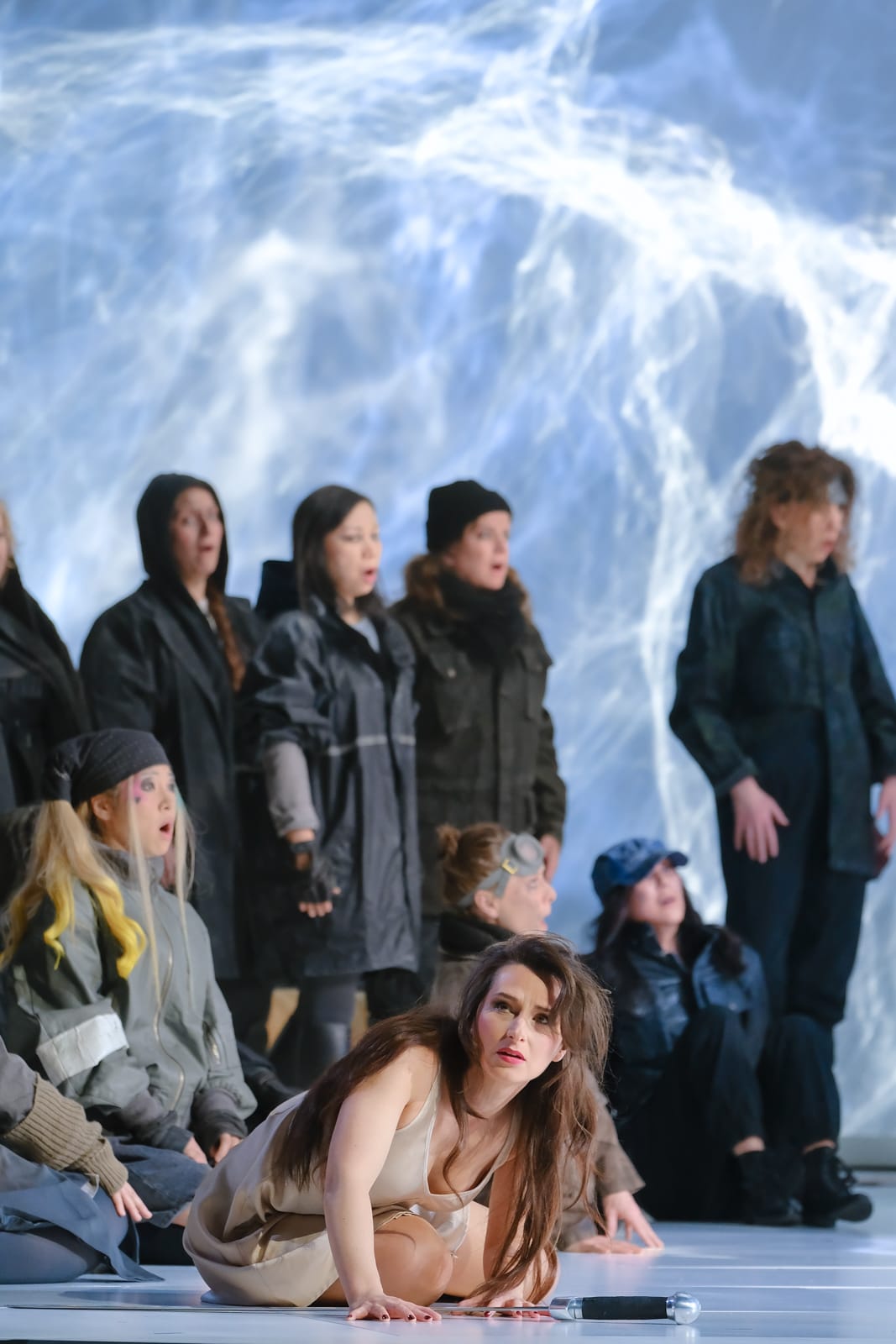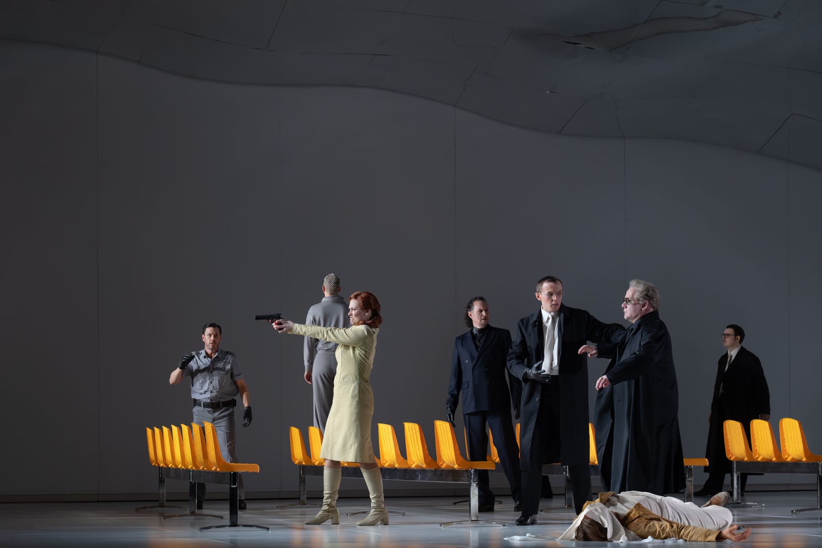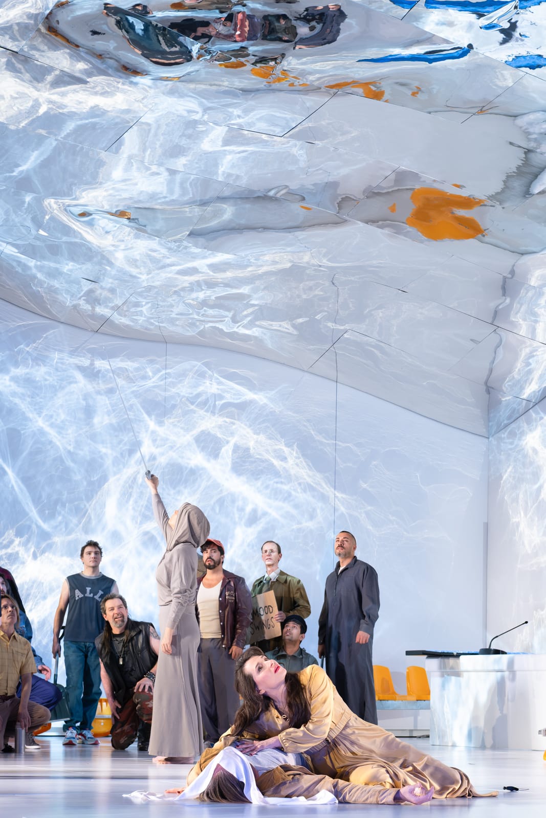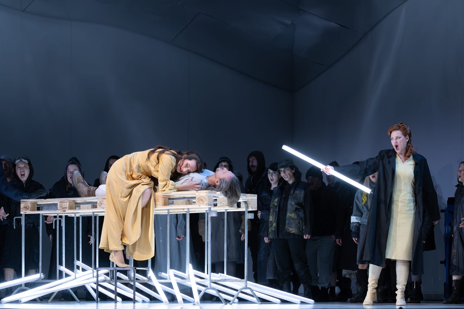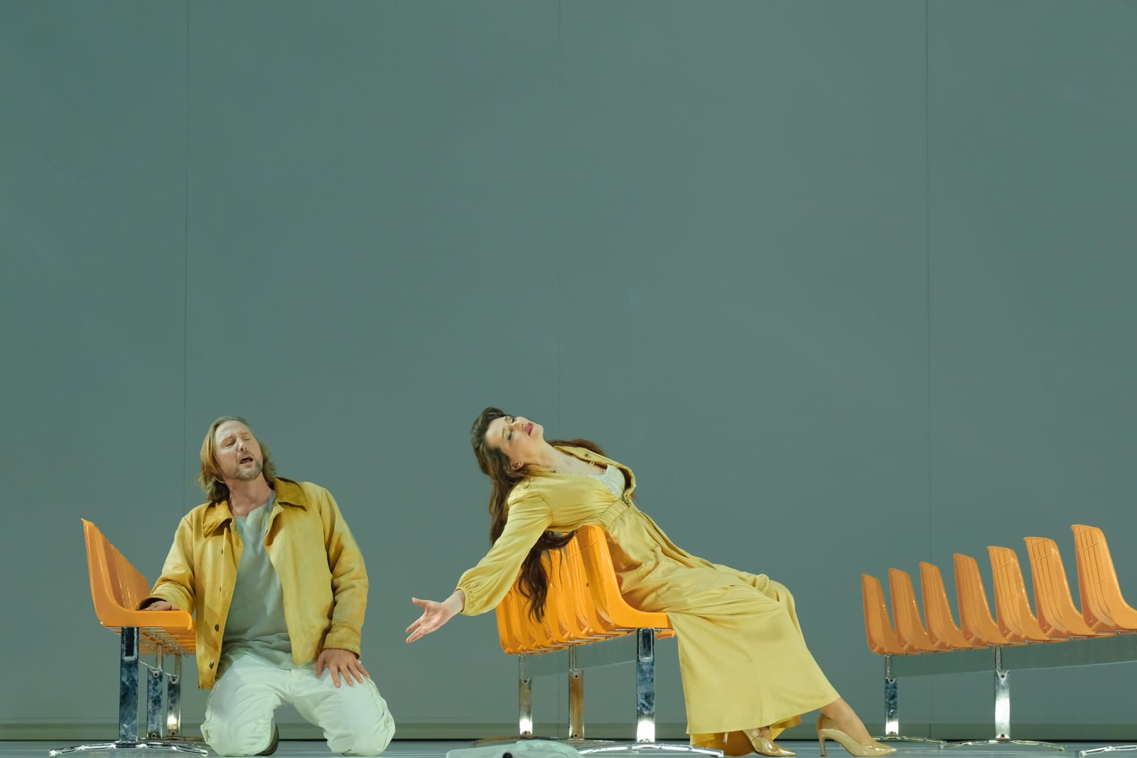 Der Regisseur Peters-Messer mit dem äußerst talentierten deutschen Bühnenbildner Guido Petzold und seinen spektakulären Bühnenbildern, desgleichen seine Kollegin, die deutsche Kostümbildnerin Tanja Liebermann für die wunderschönen Kostüme bietet uns eine Szenografie, die sich intelligent weiterentwickelt und eng der Perspektive des Komponisten folgt, dessen Werk mit dem Fortschreiten das Dramas an Intensität zunimmt. Der erste Akt führt die Hauptfiguren in einer trostlosen Umgebung zusammen, getaucht in das grelle Licht moderner Gefängnisse, wo der Schlaf verboten ist. Der Fremde, ein Unruhestifter, weil er Glück und Freude verteidigt hat, verbüßt seine Strafe und liegt in einer spartanischen Umgebung auf einem Bett. Gleichzeitig ist der Zuschauer fasziniert von der hellen, metallischen Hülle, die sich über ihm zu einem Bogen wölbt – ein Bühnenbild, das in zwei darauffolgenden Akten beibehalten wird und dessen Himmel sich am Ende während der „Auferstehung“ des Fremden in ein funkelndes Kreuz aufspaltet, genau in dem Moment, in dem Chöre und Orchester uns eine Art apokalyptisches Musik-Ensemble präsentieren. Da der Zeitraum unbestimmt ist, verortet sich Peters-Messer in einer ebenso unbestimmten Zukunft. Die Kostüme scheinen daher verschiedenen Geschichten zu entstammen und symbolisieren die Rolle der jeweiligen Figur: Der Fremde ähnelt dem Luke Skywalker aus dem Film Star Wars (1977) von George Lukas (*1944), der Herrscher erinnert an die Strenge der Star-Trek-Helden, auch Helianes langes Kleid verwandelt sich beim Ausziehen in einen kurzen, eleganten Jumpsuit und die bunte Menge spiegelt die Vielfalt des geheimnisvollen Königreichs wieder. Die Veränderungen im Bühnenbild betreffen hauptsächlich die Möbel – Reihen orangefarbener Stühle und ein Konferenztisch im zweiten Akt, dem Akt mit dem Urteil über Heliane, dann eine Rückkehr zur Schlichtheit, aber dann die Allgegenwart der Menge im dritten Akt. Auch die Beleuchtung ist erst orange, dann grünlich und spiegelt die wechselnden Situationen wider. Diese klare Inszenierung wird durch die sehr feine Regie der Schauspieler-Sänger ergänzt, die von der Oper hervorragend besetzt wurden. Die gesamte Aufführung wird von den anmutigen Bewegungen der mausgrauen deutschen Tänzerin Nicole van den Berg begleitet, die in ihrer eigenen Choreografie den Engel verkörpert. Ihre Bewegungen, die harmonisch mit den Bühnenbewegungen der Protagonisten verschmelzen, unterstreichen die Allgegenwart des Übernatürlichen in Korngolds Oper. Der Gesamteindruck ist ein silbriger, mal schimmernder, mal gedämpfter Farbton, wobei das dominante Grau ihres Trikots perfekt mit dem Bühnenbild verschmilzt, sodass sie in der Stille fast zu verschwinden scheint.