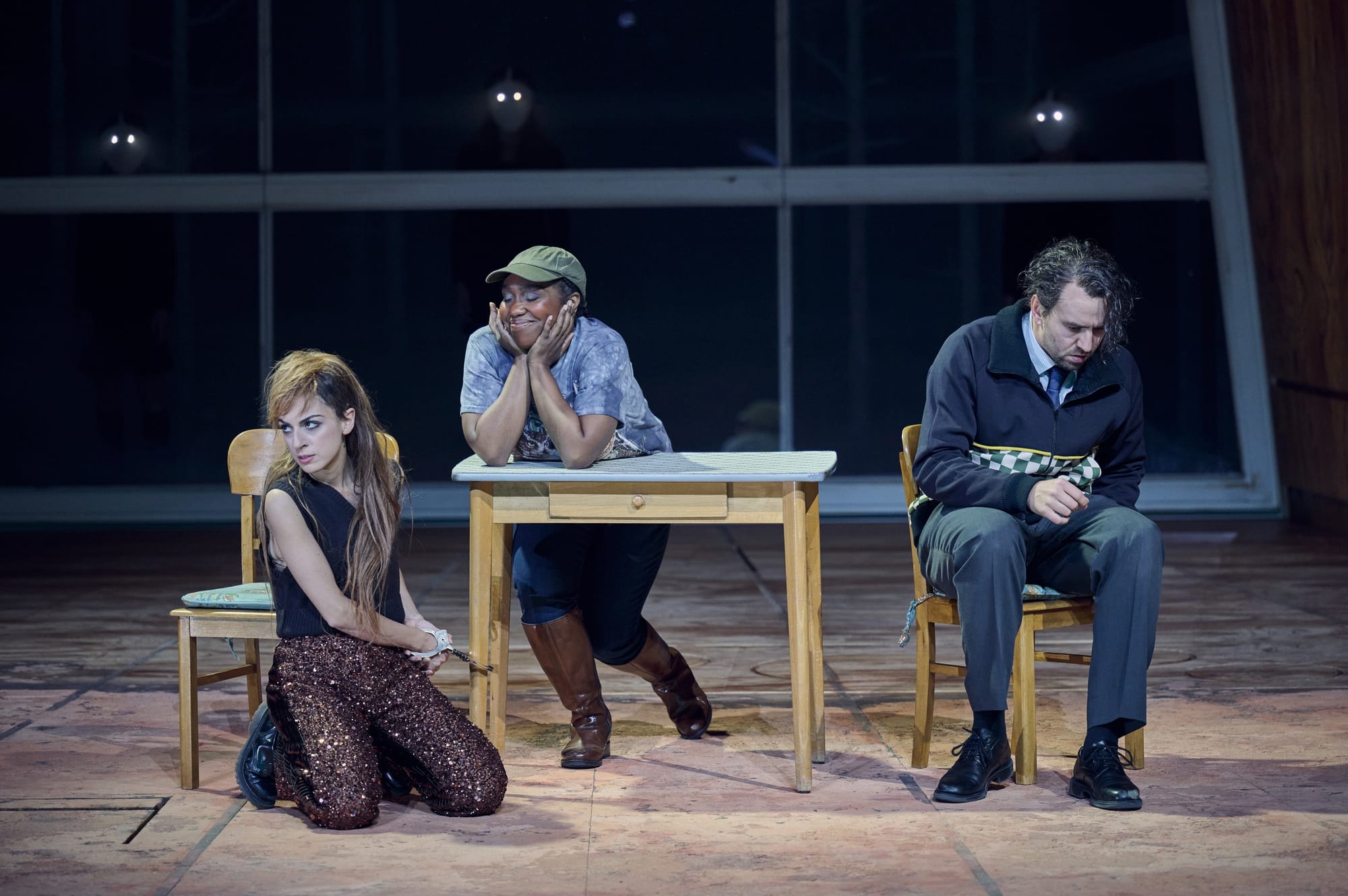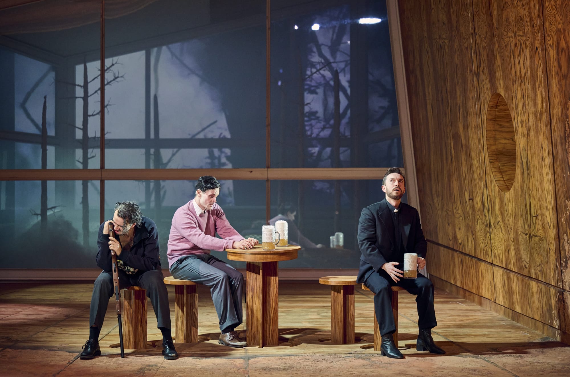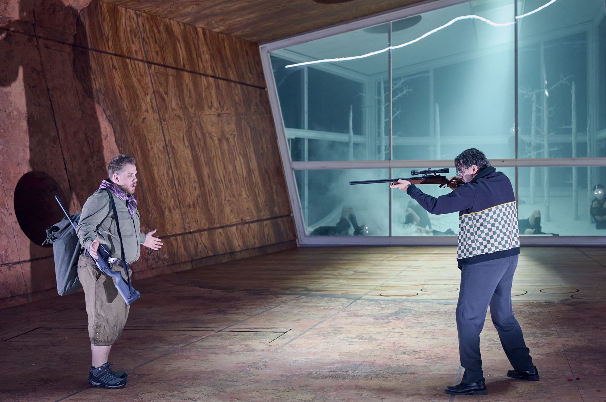 Katja Haß hat für diese „Verbund-Welt“ eine aus Holz gefertigte tunnelartige und in die Tiefe der Bühne ragende Halle gebaut. Diese mag auf den ersten Blick den Naturbezug verleugnen und allzu technisch und mensch-bezogen wirken. Auf den zweiten Blick und im weiteren Verlauf der gut 90 Minuten dauernden, ohne Pause gespielten Oper ergeben sich jedoch zahlreiche inhaltliche und ikonografische Bezüge zwischen den beiden Polen Natur und menschliche Gesellschaft. Auch ermöglicht die raffinierte Konstruktion dieses Einheitsbildes mit ihren versteckten Türen, Luken und sonstigen Durchlässen recht wirksame Auf- und Abtritte, was der Aufführung einen gewissen Drive verleiht, manchen szenischen Effekt ermöglicht und die Verschränkung der verschiedenen Handlungs- und Zeitebenen weiter perfektioniert. Darüber hinaus bietet das Bühnenbild der Regie zusätzliche Möglichkeiten, die an sich schon sehr schlüssige und psychologisch spannende Personenführung nochmals zu verfeinern und erweist sich auch akustisch als vorteilhaft.