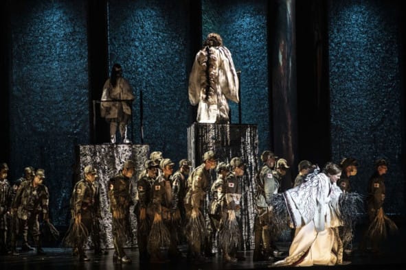 Für Idomeneo entwickelte Miyagi eine faszinierende Parallele zwischen dem Text der in Mozarts Oper dargestellten Situationen und der großen Katastrophe Japans im Jahre 1945 in einem besiegten und sterbenden Land. Über die Prüfungen hinaus bleibt Idomeneo an seinem Platz, überlässt jedoch den Thron seinem Sohn, genau wie Kaiser Hirohito (1901-1989), dessen Abstammung vom amerikanischen Sieger, vertreten durch General Douglas MacArthur (1880-1964) für die zukünftige Stabilität des Landes bewahrt wird. Der Regisseur, platziert das Geschehen von 1945 bewusst inmitten einer Masse von erschöpften und zerlumpten japanischen Soldaten, die immer noch in ihrer Tarnkleidung aus Ästen und übergroßem Gras gekleidet sind: Die als eine Art von ewigen umherirrenden Zombies verurteilt sind! Die dominanten Figuren auf dem Höhepunkt ihrer Privilegien, König Idomeneo, sein Sohn Idamante und die zerbrechliche Ilia, Tochter des Priamos, Herrscher von Troja, singen von der Höhe aus auf beweglichen dreieckigen durchsichtigen Podesten, womit sie sich oft auf der Bühne bewegen mit der Hilfe eines akrobatischen und tanzenden Zombie-Ballett. Dieses eigenwillige skurrile Ballett wurde von der japanischen Choreographien Akiko Kitamura gezaubert. Aus Sicherheitsgründen gezwungen, lehnen sie an eine Sicherheitsstange oder sie halten sich daran fest, sie bilden somit tatsächlich eine ziemlich starre, gleichmäßig hieratische Versammlung, die fast keinen Blick miteinander wechselt und vor allem niemals auf dem Bühnen-Boden der sterblichen Menschen herabsteigt. Nur Elettra ist durch ihren Partikularismus und den Ausdruck ihrer vulkanischen Liebe auf derselben niedrigen Ebene: Also viel menschlicher! Der von dem japanischen Bühnenbildner Junpai Kiz geschaffene Bühnenraum erinnernd an imposante japanische Wandschirme aus dem exotischen Papier Washi, durch die das Licht je nach der jeweiligen Szene dringen kann und so ein wunderbares feenhaftes Schattenspiel zum Vorschein bringt. Abgesehen von Ilia, die amerikanische Kleider aus den 1940er Jahren trägt, tragen die anderen Protagonisten mehr oder weniger üppig aussehende Kimonos, die von der japanischen Kostümbildnerin Kayo Takahashi Deschene entworfen wurden. Die entwickelte Ästhetik wirkt durchaus sehr ansprechend und die starken Momente sollten in dieser Aufführung nicht außer Acht gelassen werden. Während der Szene, in der Idomeneo bereit ist seinen Sohn dem Gott Neptun zu opfern, verwandeln sich die Bildschirme plötzlich in ein Gemälde aus der künstlerischen Serie The Hiroshima Panels / Genbaku no zu (1950/1982) die die japanischen Künstler Iri (1901-1995) und Toshi Maruki (1912-2000) am Ende des Krieges geschaffen haben und zwar das Gemälde N° 2: Feuer. Die Bühne erscheint in einer Variation aus extravaganten Rottönen: Die in Flammen aufsteigen! Die von der japanischen Lichtbildnerin Yukiko Yoshimoto großartigen phänomenalen Beleuchtungen verleihen dieser Aufführung eine weitere gewaltige Dimension, unterstreicht aber auch das Ausmaß, dass die dramaturgische Arbeit insbesondere in ihren vermeintlichen Zusammenhängen zwischen der antiken Tragödie und dem besiegten tausendjährigen japanischen Imperium von 1945 andeuten will. Die Charaktere als solche verlieren vielleicht bei diesem Ansatz ein wenig von ihrer Substanz, aber überzeugen doch mit einem unbestreitbaren Teil ihre gewaltigen psychologischen Dimension.